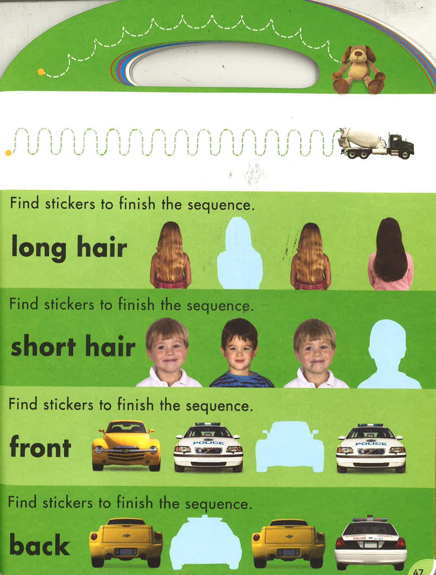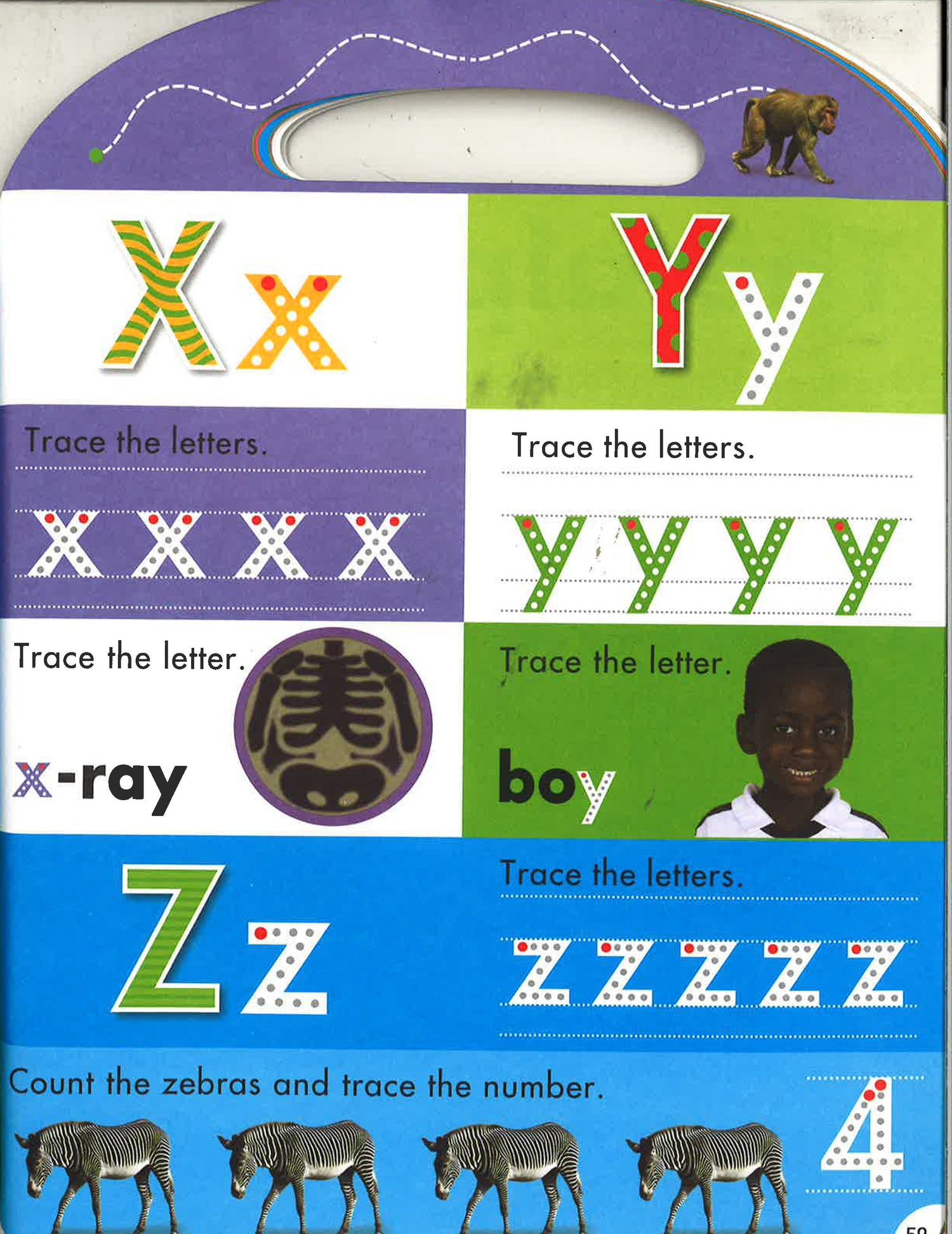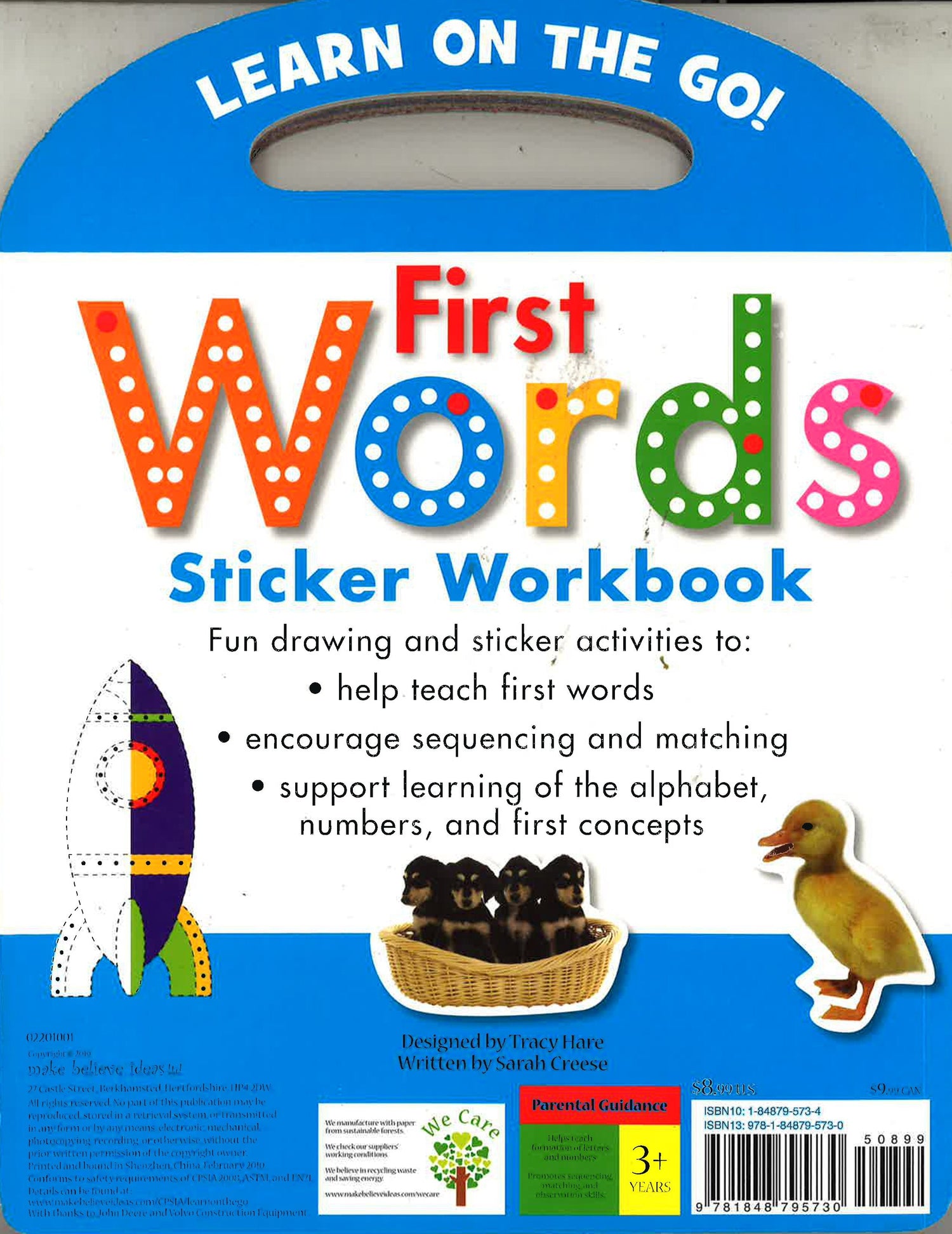 The First WordsSticker Workbook encourages children to practice tracing first words bylooking at things familiar to their world including: my body, my family, myday, animals and vehicles. It contains clear and colorful design, livelyphotographic images, and simple text instructions. There are also over 1000stickers for children to use in the book and wherever they want! A carry-me handleis perfect for little hands to pick up, and allows children to have fun wherever they are!