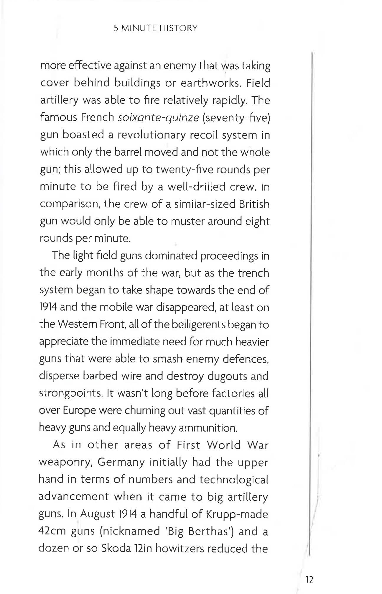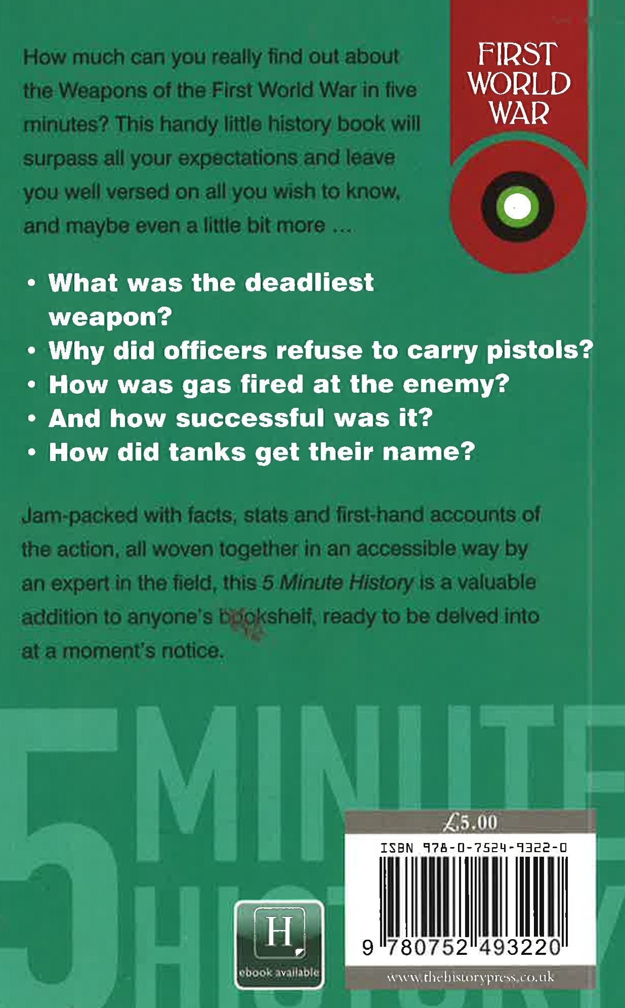 How much can you really find out about the Weapons of the First World War in five minutes? This handy little history book will surpass all your expectations and leave you well versed on all you wish to know, and maybe even a little bit more... What was the deadliest weapon? Why did officers refuse to carry pistols? How was gas fired at the enemy? And how successful was it? How did tanks get their name? Jam-packed with facts and first-hand accounts of the action, all woven together in an accessible way by an expert in the field, this 5 Minute History is a valuable addition to anyone's bookshelf, ready to be delved into at a moment's notice.