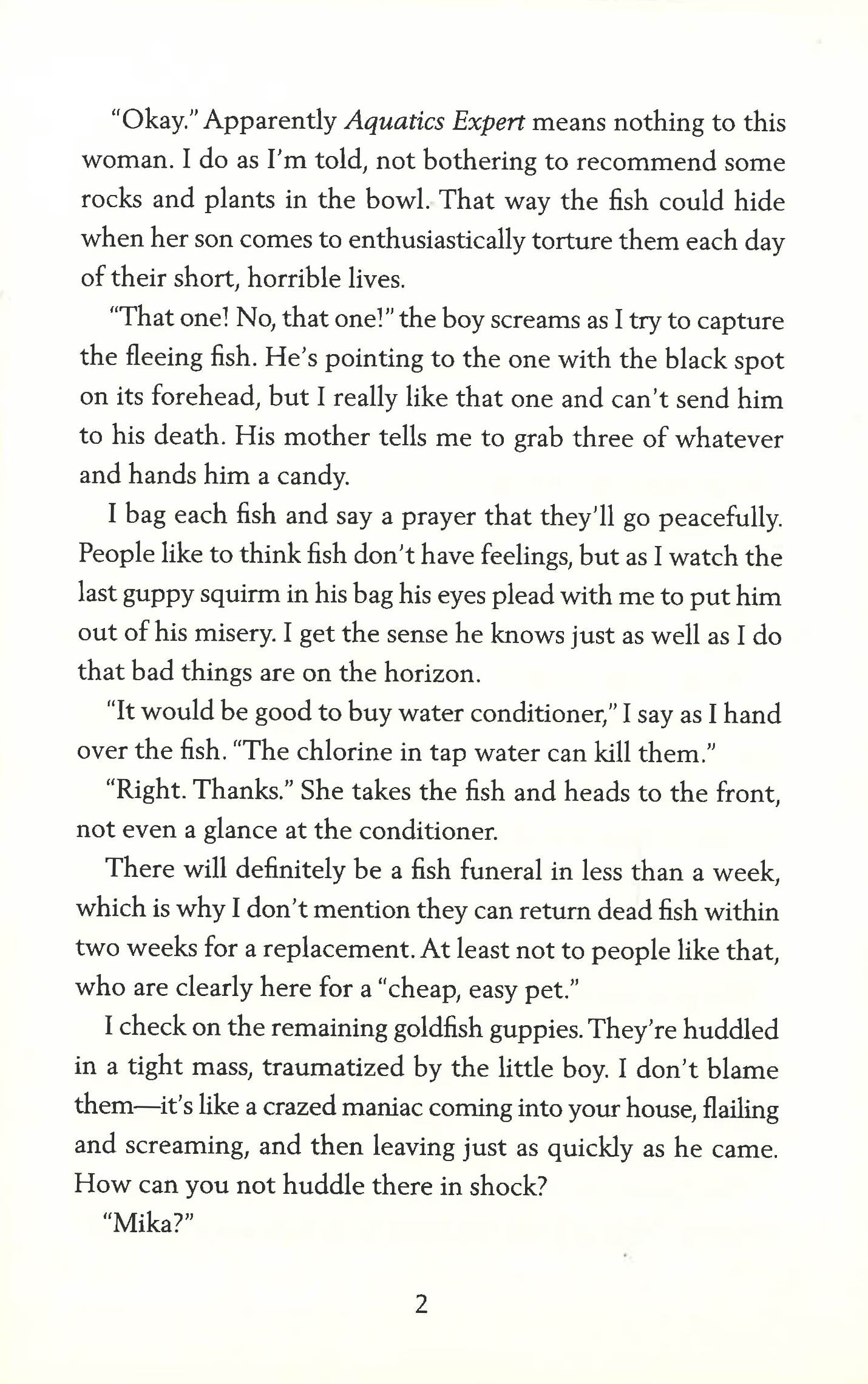 People like to think fish don't have feelings - it's easier that way - but as I watch the last guppy squirm in his bag, his eyes seem to plead with me. I get the sense that it knows just as well as I do that bad things are on the horizon.' Mika Arlington has her perfect summer all planned out, but the arrival of both her estranged grandmother and too-cool Dylan are going to make some very big waves in her life. Told with Natalie Whipple's signature whip-smart wit and warmth, this is a story about prejudice, growing up and the true meaning of sticking by your family.