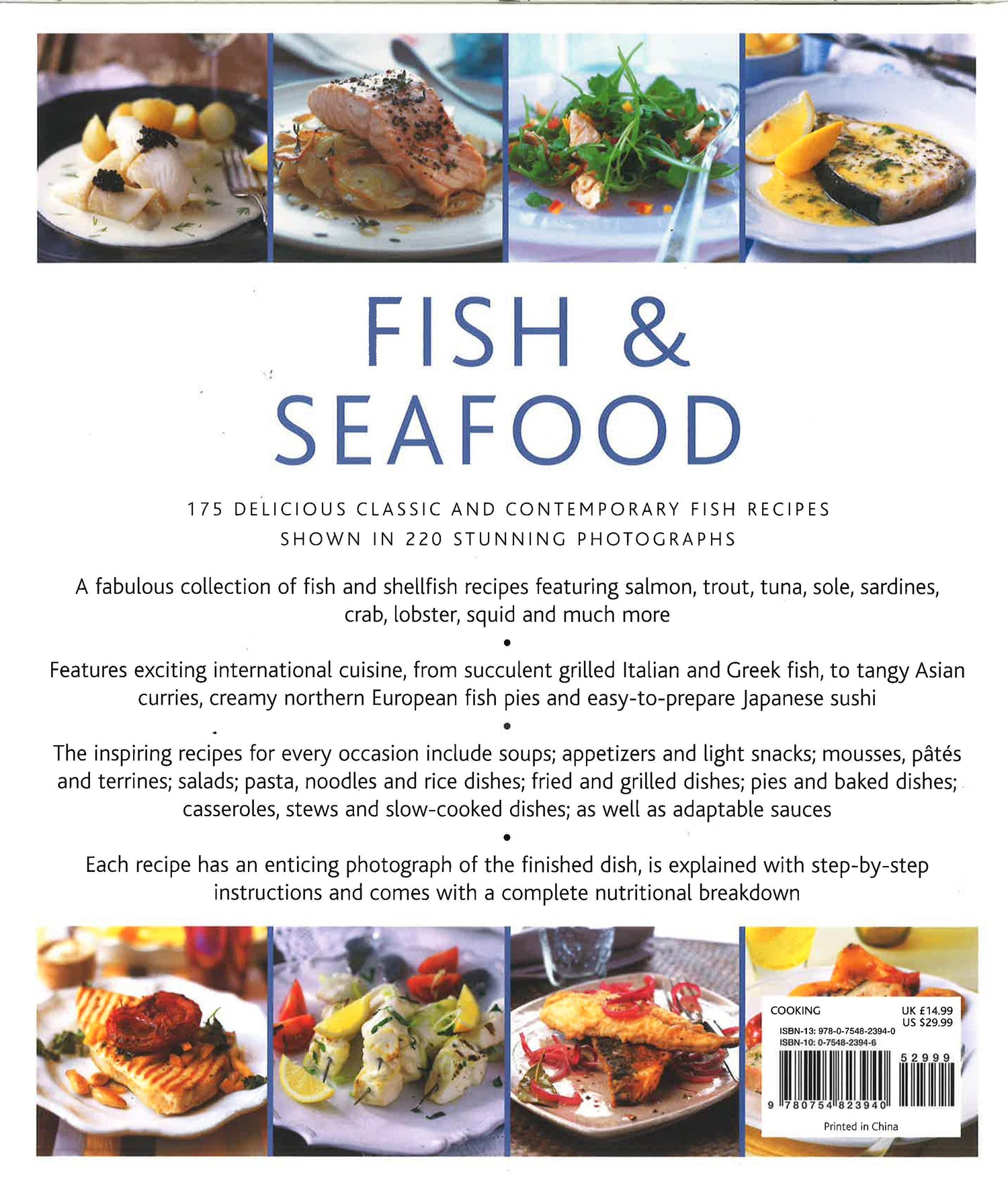 175 delicious classic and contemporary fish recipes shown in 220 stunning photographs. This is a fabulous collection of fish and shellfish recipes featuring salmon, trout, tuna, sole, sardines, crab, lobster, squid and much more. It features exciting international cuisine, from delicious grilled Italian and Greek fish, to tangy Asian curries, creamy northern European fish pies and easy to prepare Japanese sushi. The inspiring recipes for every occasion include soups; appetizers and light snacks; mousses, pates and terrines; salads; pasta, noodles and rice dishes; fried and grilled dishes; pies and baked dishes; casseroles, stews and slow-cooked dishes; as well as adaptable sauces. Each recipe has an enticing photograph of the finished dish, is explained with step-by-step instructions and comes with a complete nutritional breakdown. Low in fat and rich in protein, minerals and vitamins, fish and shellfish make a magnificent contribution to a healthy diet. This collection of vibrant, taste-packed dishes is the perfect cookbook for any occasion - from a formal dinner party to a quick and easy supper for two. Here are all the popular classics such as Scallops with Bacon, Poached Salmon with Hollandaise Sauce, Crab Cakes, Moroccan Fish Tagine, and Seared Tuna Steaks with Red Onion Salsa. Inspirational contemporary dishes using less familiar fish include Eels in Green Herb Sauce, Octopus Pasta Bake and Cockle Pie. Fresh, bright and accessible, this beautiful book is filled with 130 dishes from all over the world. With something to please every palate, every season and every type of fish, each recipe has easy-to-follow instructions to help you achieve perfect results every time.