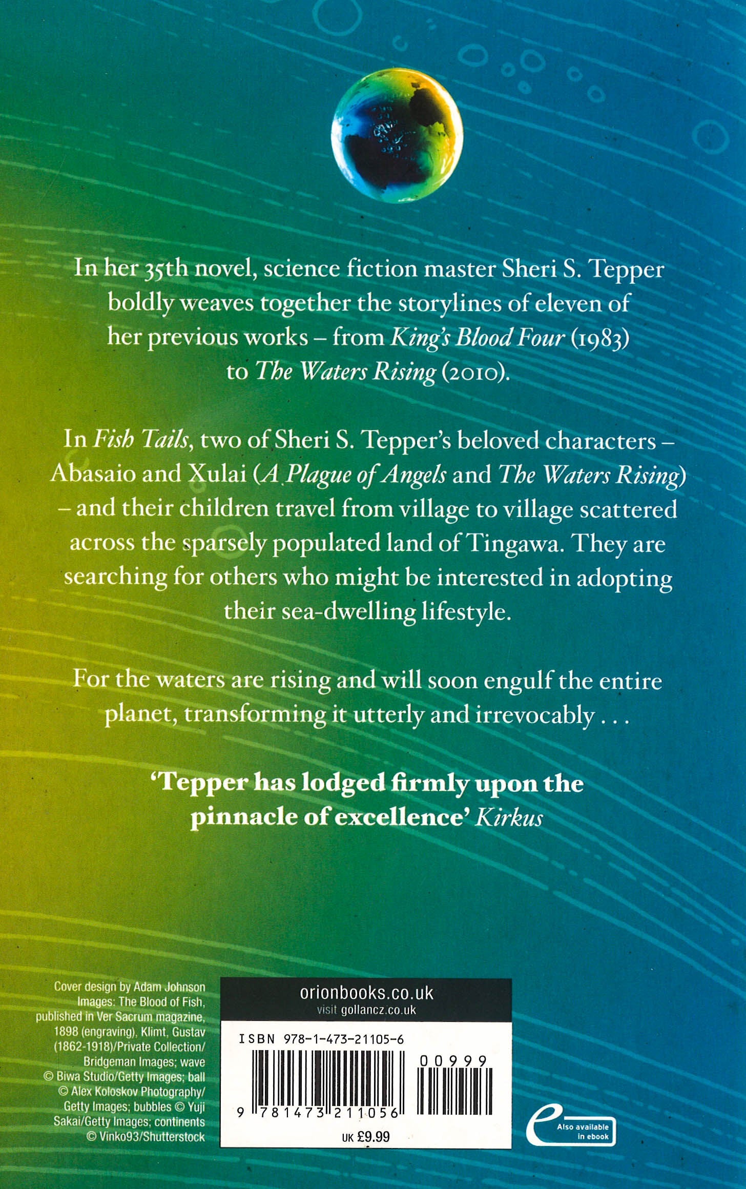 In her 35th novel, science fiction master Sheri S. Tepper boldly weaves together the storylines of eleven of her previous works from KING'S BLOOD FOUR (1983) to THE WATERS RISING (2010)In FISH TAILS, two of Tepper's beloved characters - Abasio and Xulai (A PLAGUE OF ANGELS and THE WATERS RISING) - and their children travel from village to village scattered across the sparsely populated land of Tingawa. They are searching for others who might be interested in adopting their sea-dwelling lifestyle.Along their journey they encounter strange visitors from the far-off world of Lom, characters from Tepper's nine-book True Game series of novels - Mavin Manyshaped, Jinian Star-eye, and Silkhands the Healer - all of whom have been gathered up by an interfering, time-traveling, rule-breaking do-gooder to do one last good dead on earth before its metamorphosis is complete. For the waters are rising and will soon engulf the entire planet, transforming it utterly and irrevocably.
