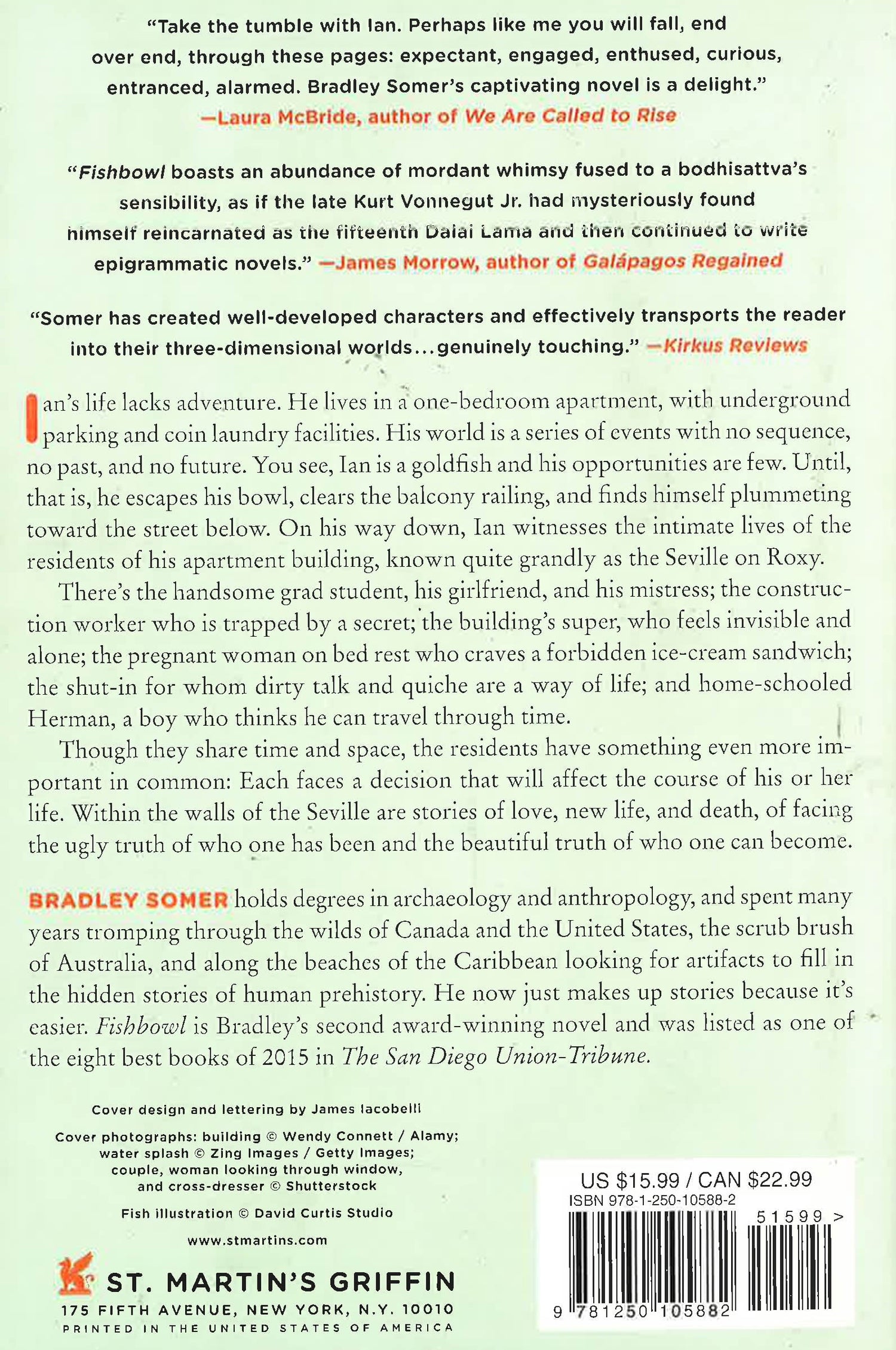 A goldfish named Ian is falling from the 27th-floor balcony on which his fishbowl sits. He's longed for adventure, so when the opportunity arises, he escapes from his bowl, clears the balcony railing and finds himself airborne. Plummeting toward the street below, Ian witnesses the lives of the Seville on Roxy residents.There's the handsome grad student, his girlfriend, and his mistress; the construction worker who feels trapped by a secret; the building's super who feels invisible and alone; the pregnant woman on bed rest who craves a forbidden ice cream sandwich; the shut-in for whom dirty talk, and quiche, are a way of life; and home-schooled Herman, a boy who thinks he can travel through time. Though they share time and space, they have something even more important in common: each faces a decision that will affect the course of their lives. Within the walls of the Seville are stories of love, new life, and death, of facing the ugly truth of who one has been and the beautiful truth of who one can become. Sometimes taking a risk is the only way to move forward with our lives. As Ian the goldfish knows, "An entire life devoted to a fishbowl will make one die an old fish with not one adventure had."