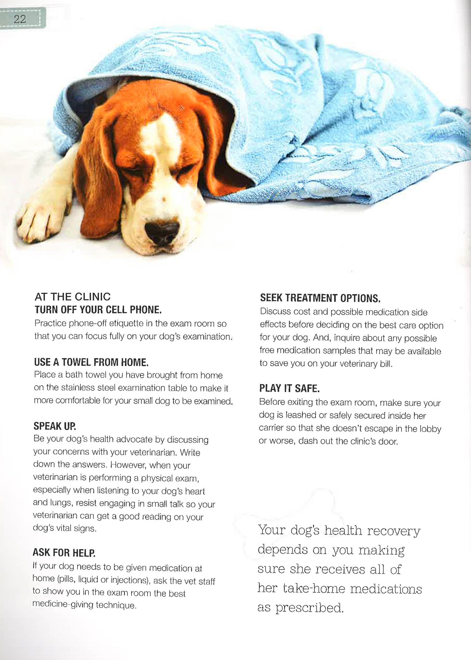 Topics include: How Healthy is Your Dog? - veterinary care, medications Knowing Your Dog - communication, barking, moods, intelligence, popular breeds Food and Nutrition - feeding tips, portion size, buying/making food (recipes), treats, weight Obedience Training - how to train, essential commands, clickers/pointers, problem behaviors Household Chore Tricks - such as Fetch the Remote, Tidy Your Toys, Bring Me... Basic Show Tricks - such as Shake Hands, Take a Bow, Sit Pretty Advanced Show Tricks - such as Say Your Prayers, Spin in Circles, Play Dead Socializing - dog to dog, cat, humans, how to stop a dog fight, party games, rainy day games Travel - preparation, pet-friendly hotels, dog parks, hikes Canine Sports - agility, Frisbee, dock diving, dance freestyle Pet First Aid - emergencies, CPR, first aid kit, bleeding, bee stings, burns Budgeting - how to lower expenses, homemade toys, pet insurance.