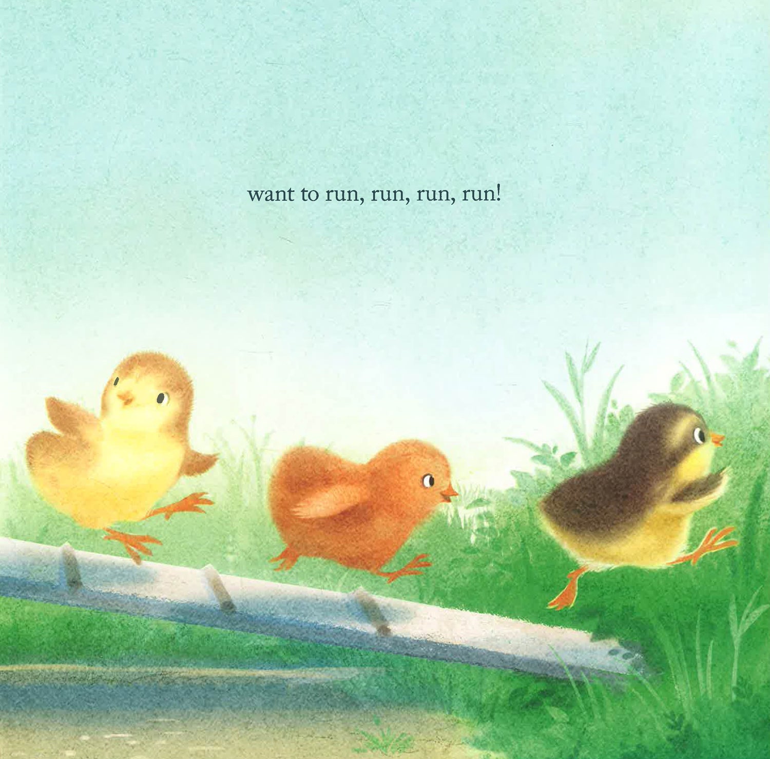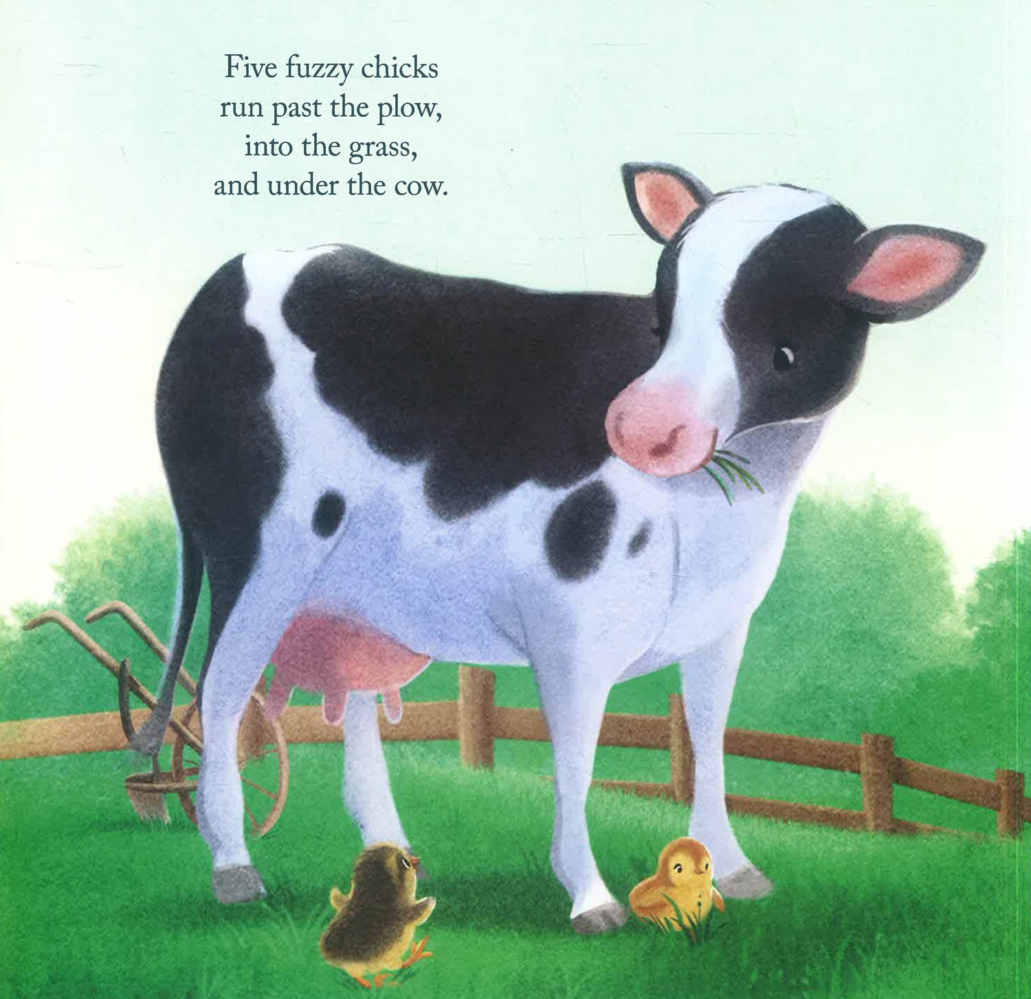 They race out of the coop to visit all of the other animals. But the dog is so snuggly and the hay is so comfy, and these five fuzzy chicks can’t help but fall asleep one by one.