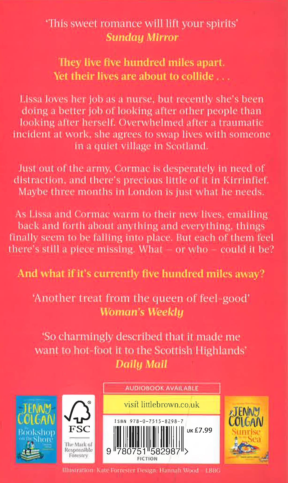 'Nobody does cosy, get-away-from-it-all romance like Jenny Colgan' Sunday Express 'A sheer delight from start to finish' Sophie Kinsella ___________________________________ They live five hundred miles apart. Yet their lives are about to collide . . . Curl up and escape with Jenny Colgan 'An evocative, sweet treat' Jojo Moyes 'Gorgeous, glorious, uplifting' Marian Keyes 'Irresistible' Jill Mansell 'Just lovely' Katie Fforde 'Naturally funny, warm-hearted' Lisa Jewell 'A gobble-it-all-up-in-one-sitting kind of book' Mike Gayle ___________________________________ Lissa loves her job as a nurse, but recently she's been doing a better job of looking after other people than looking after herself. After a traumatic incident at work leaves her feeling overwhelmed, she agrees to swap lives with someone in a quiet village in Scotland. Cormac is restless. Just out of the army, he's desperately in need of distraction, and there's precious little of it in Kirrinfief. Maybe three months in London is just what he needs. As Lissa and Cormac warm to their new lives, emailing back and forth about anything and everything, finally things seem to be falling into place. But each of them feel there's still a piece missing. What - or who - could it be? And what if it's currently five hundred miles away? ___________________________________ Why readers ADORE Jenny Colgan 'Jenny Colgan has a way of writing that makes me melt inside' 'Her books are so good I want to start over as soon as I have finished' 'There's something so engaging about her characters and plots' 'Her books are like a big, warm blanket' 'Her stories are just so fabulous' 'She brings her settings and characters so vividly to life' 'The woman is just magic'