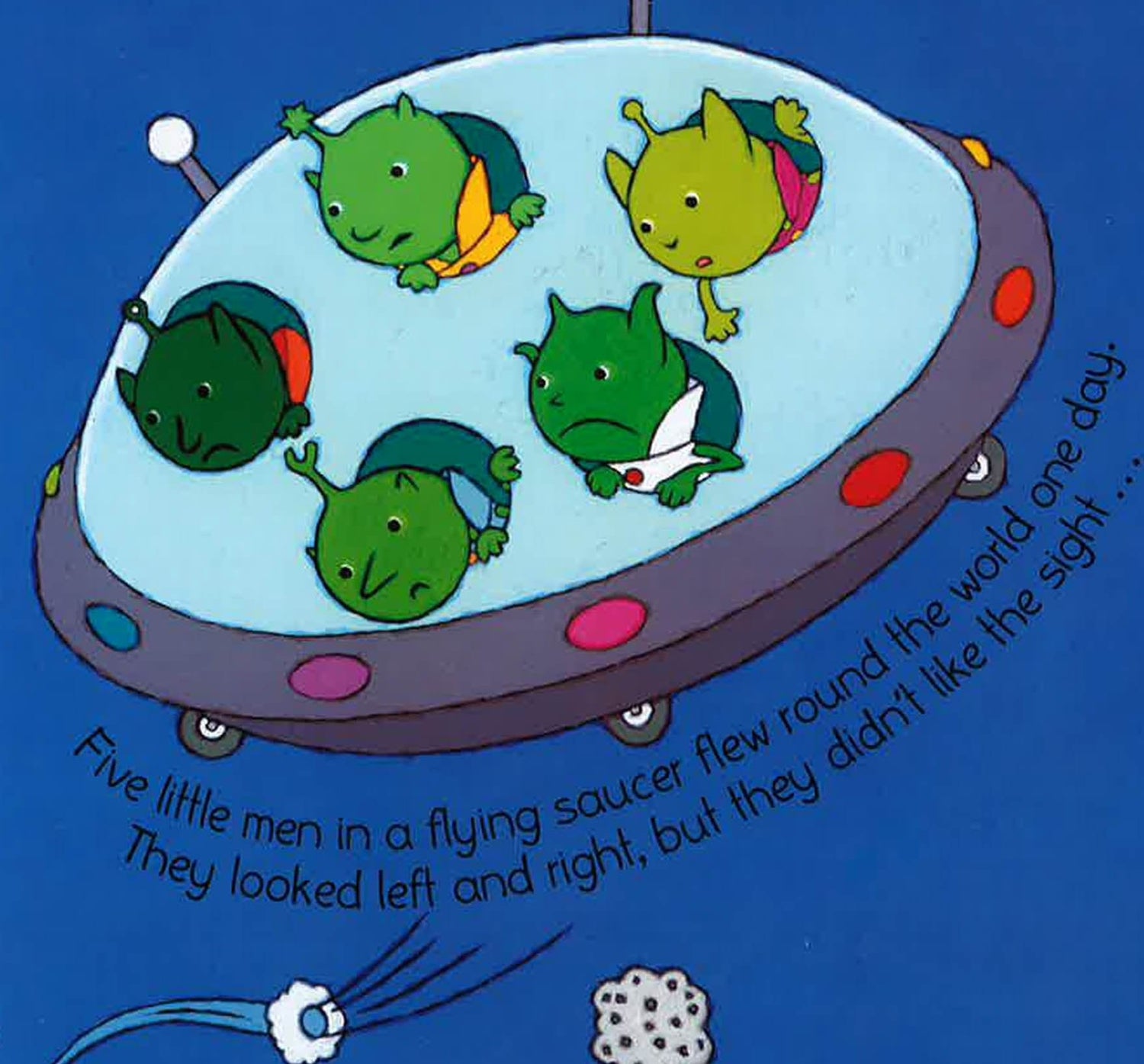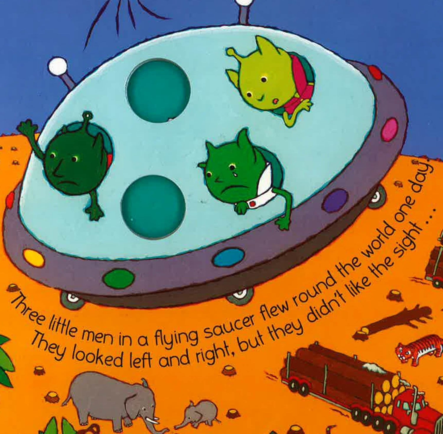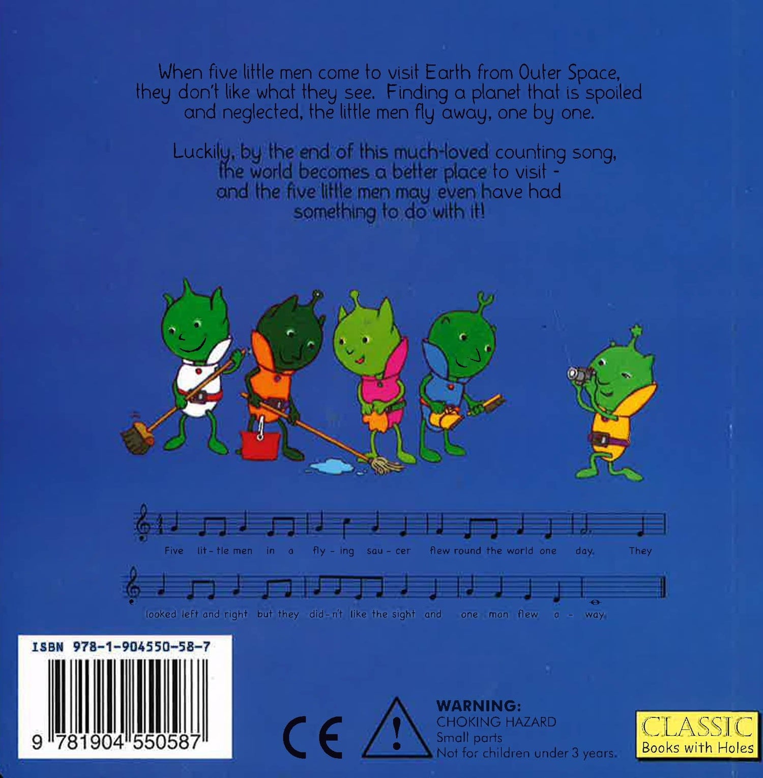 When five little men come to visit Earth from Outer Space, they don't like what they see. Finding a planet that is spoiled and neglected, the little men fly away, one by one. Luckily, by the end of this much-loved counting song, the world becomes a better place to visit - and the five little men may even have had something to do with it! All children love this traditional rhyme and singing along will help to develop number skills. Bouncy illustrations, innovative die cutting and popular rhymes make Books with Holes a must for every child. Available in three formats, suitable for babies, toddlers, pre-schoolers and the nursery or classroom.
