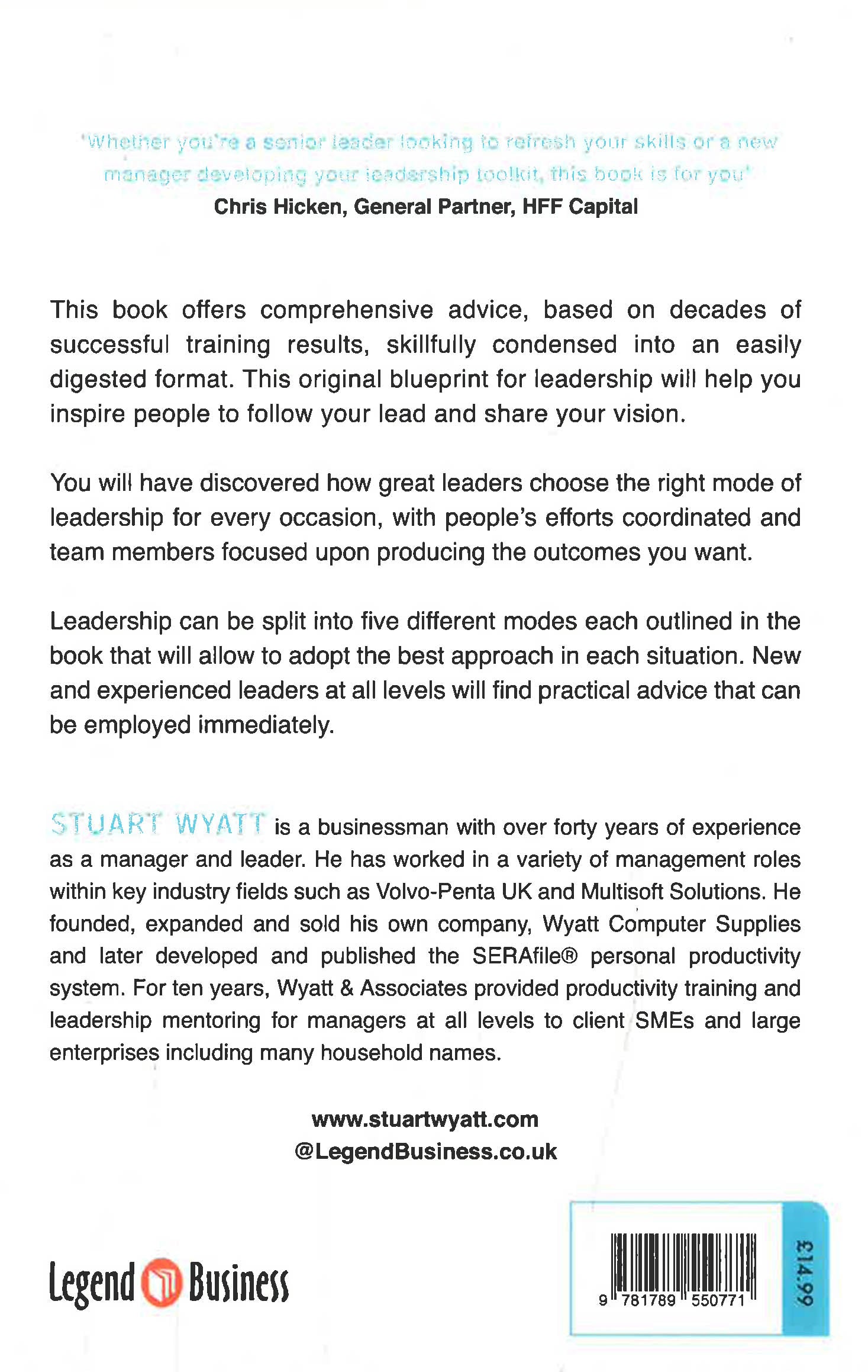 ‘Unlike most business books that can be summarized in a page or two, Wyatt provides practical, no-nonsense advice on five different modes of leadership. Whether you’re a senior leader looking to refresh your skills or a new manager developing your leadership toolkit, this book will help.’ Chris Hicken, General Partner, HFF Capital