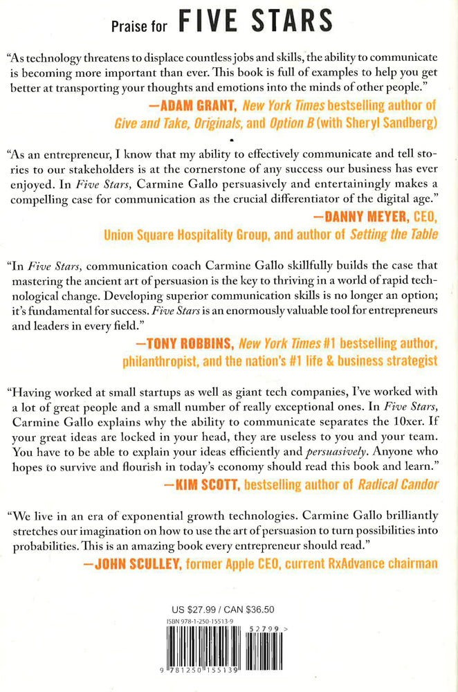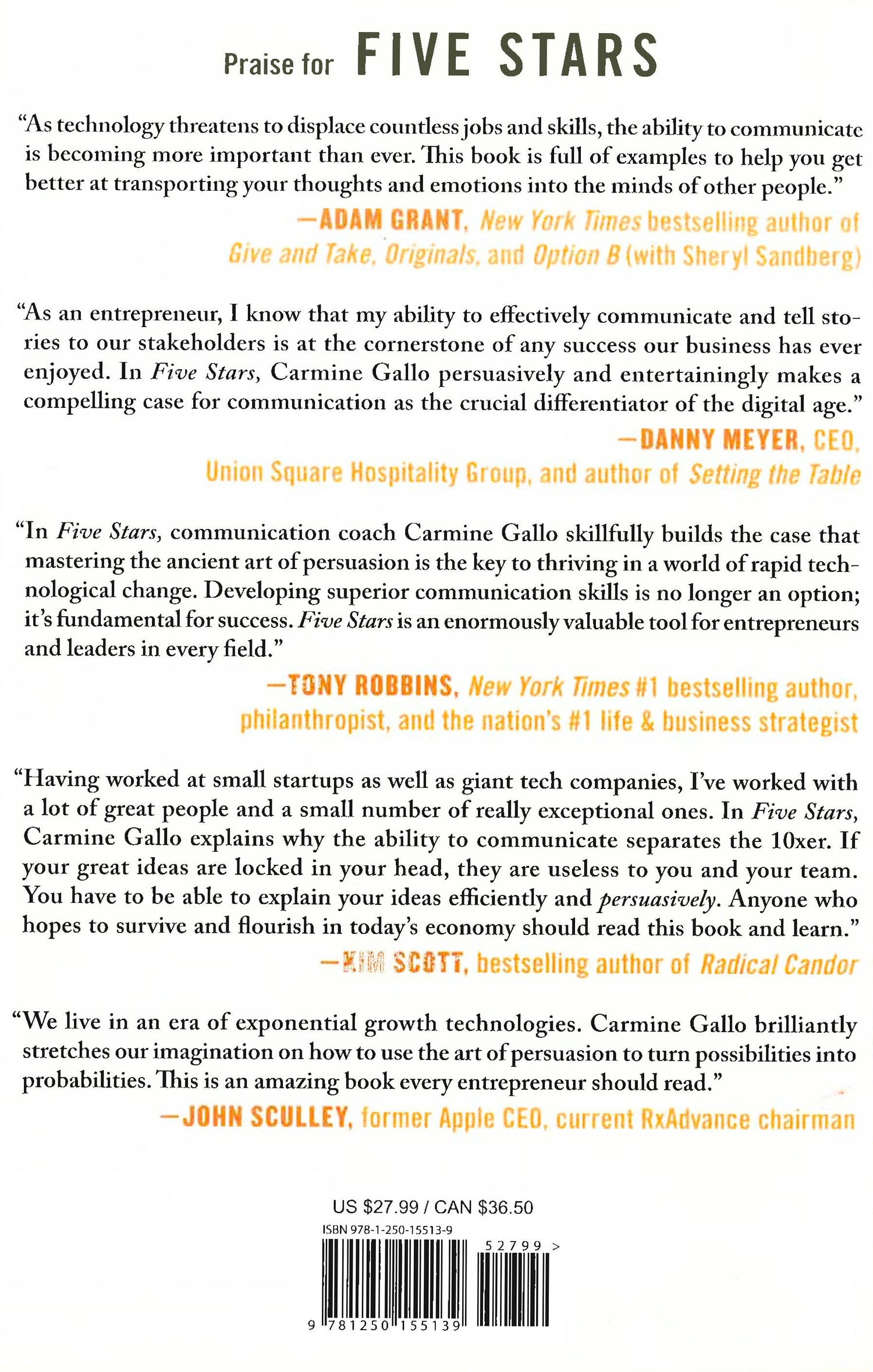 Ideas don’t sell themselves. As the forces of globalization, automation, and artificial intelligence combine to disrupt every field, having a good idea isn’t good enough. Mastering the ancient art of persuasion is the key to standing out, getting ahead, and achieving greatness in the modern world. Communication is no longer a “soft” skill - it is the human edge that will make you unstoppable, irresistible, and irreplaceable - earning you that perfect rating, that fifth star.In Five Stars, Carmine Gallo, bestselling author of Talk Like TED, breaks down how to apply Aristotle’s formula of persuasion to inspire contemporary audiences. As the nature of work changes, and technology carries things across the globe in a moment, communication skills become more valuable - not less. Gallo interviews neuroscientists, economists, historians, billionaires, and business leaders of companies like Google, Nike, and Airbnb to show first-hand how they use their words to captivate your imagination and ignite your dreams.In the knowledge age - the information economy - you are only as valuable as your ideas. Five Stars is a book to help you bridge the gap between mediocrity and exceptionality, and gain your competitive edge in the age of automation.