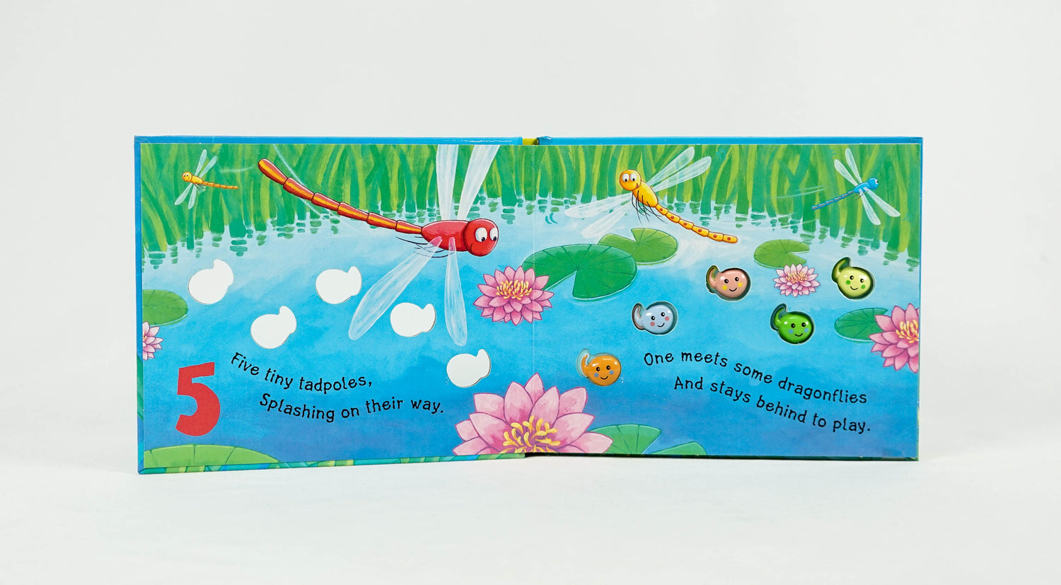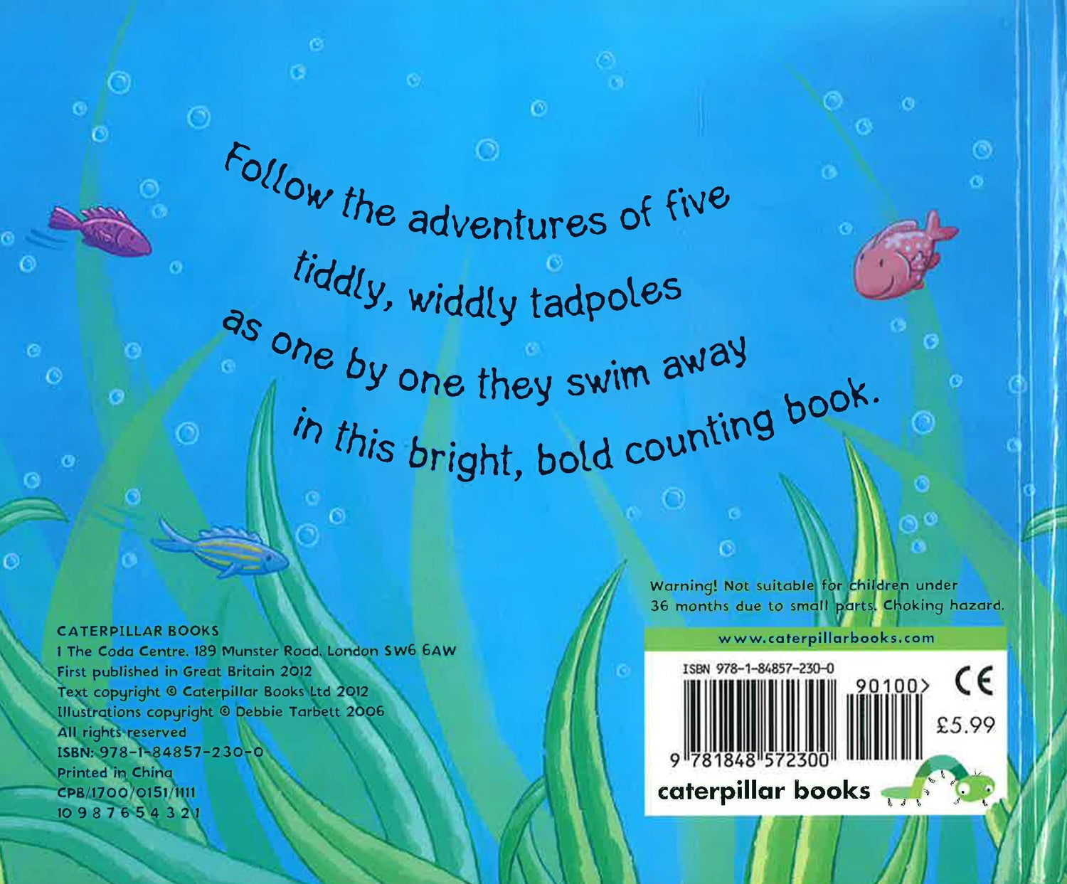 A mini version of a best-selling favourite. Follow the adventures of five tiddly, widdly tadpoles as they swim around the pond in this colourful counting book. With appealing illustrations and chunky plastic tadpoles to touch and count.