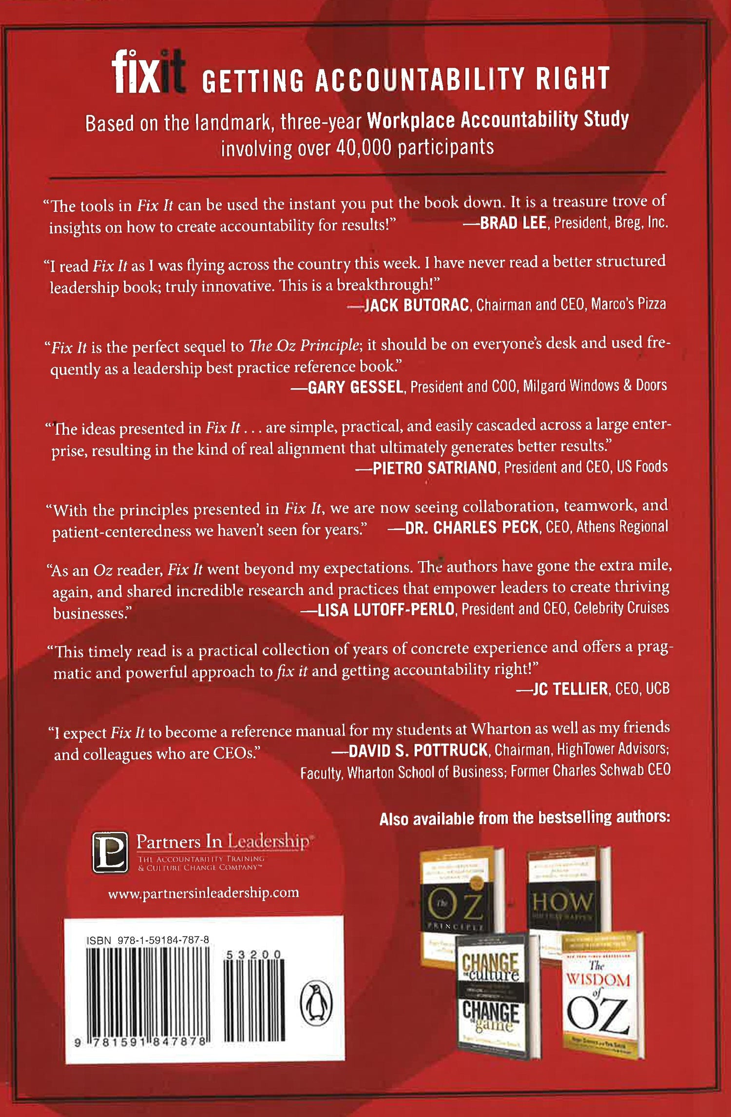 From the world's leading experts on workplace accountability comes the most comprehensive study on the subject, revealing the cure that could fix low employee engagement in the workplace once and for all One factor, more than any other, causes the problems business leaders fear most. Lackluster performance, sinking profits, and unmet stockholder expectations all stem from one source: a massive decline in em-ployee engagement. Rather than blaming employees themselves for the decline, however, the Workplace Accountability Study reveals how to fix it the secret lies with those who lead and manage our organiza-tions. To inspire employees to be fully engaged, men-tally and emotionally, in their work, leaders must first and foremost fix accountability--in themselves, their teams, and the entire enterprise. But how? To answer that question, Roger Con-nors and Tom Smith--cofounders of Partners In Leadership, the Accountability Training and Culture Change Company, and the authors of the New York Times bestseller The Oz Principle, the definitive bible on workplace accountability--have joined forces with three expert field practitioners. The resulting book not only presents eye-opening insights drawn from the authors' three-year, first-of-its-kind Workplace Accountability Study, it also offers 240 proven solu-tions advanced by 120 successful leaders interviewed exclusively for this book. Their combined wisdom can help you solve every conceivable accountability prob-lem, whenever and wherever it pops up. Since one size does not fit all in today's chal-lenging business environment, this official sequel to The Oz Principle provides an innovative, self-directed journey into accountability that enables you to tailor solutions to your own unique situation. Fix It tack-les the 16 Accountability Traits consistently found in highly accountable, effective people, teams, and organizations, and it guides you to the ones you need to fix right now. You will design your personally tailored path through the book: 1. In Part 1, you create your Fix It Bucket List by taking the three-minute Fix It Assessment. 2. In Part 2, you spend fifteen minutes reading about the Accountability Trait in question. 3. In Part 3, you explore several tried-and-true solu-tions that will work for you, your team, or your entire organization. Fix It is destined to become an indispensable leadership and management resource for resolving any pressing problem in your organization. Whatever you need, from more accountability and ownership to greater engage-ment and leadership, this book will help you get the results you need. For more information, visit: www.fixit-book.com *This Book May Have Remainder Mark*