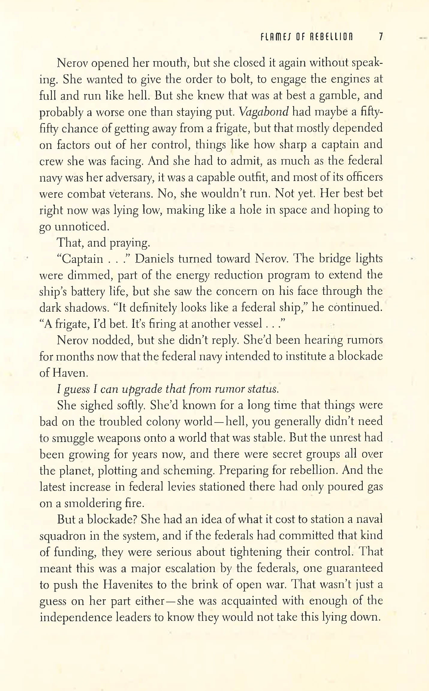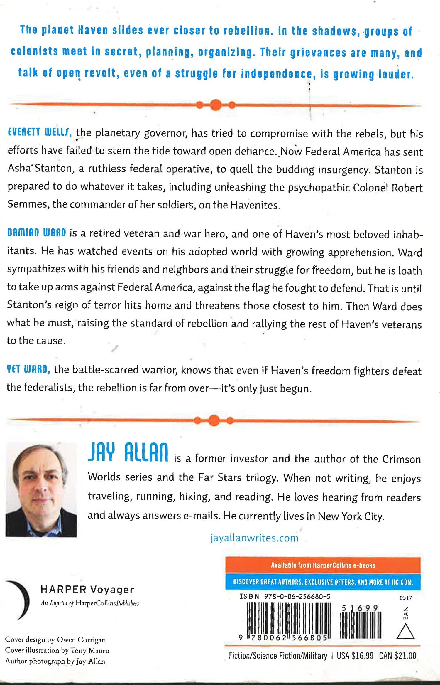 The planet Haven slides closer to revolution against its parent nation, Federal America. Everett Wells, the fair-minded planetary governor, has tried to create a peaceful resolution, but his failure has caused the government to send Asha Stanton, a ruthless federal operative, to quell the insurgency.Wells quickly realizes that Stanton has the true power . . . and two battalions of government security troops - specifically trained to put down unrest - under her control. Unlike Wells, Stanton is prepared to resort to extreme methods to break the back of the gathering rebellion, including unleashing Colonel Robert Semmes, the psychopathic commander of her soldiers, on the Havenites.But the people of Haven have their own ideas. They are not the beaten-down masses of Earth, but men and women with the courage and fortitude to tame a new world.Damian Ward is such a resident of Haven, a retired veteran and decorated war hero, who has watched events on his adopted world with growing apprehension. He sympathizes with the revolutionaries, his friends and neighbors, but he is loath to rebel against the flag he fought to defend. That is, until Stanton’s reign of terror intrudes into his life - and threatens those he knows and loves. Then he does what he must, rallying Haven’s other veterans and leading them to the aid of the revolutionaries.Yet the battle-scarred warrior knows that even if Haven’s freedom fighters defeat the federalists, the rebellion is far from over . . . it’s only just begun.