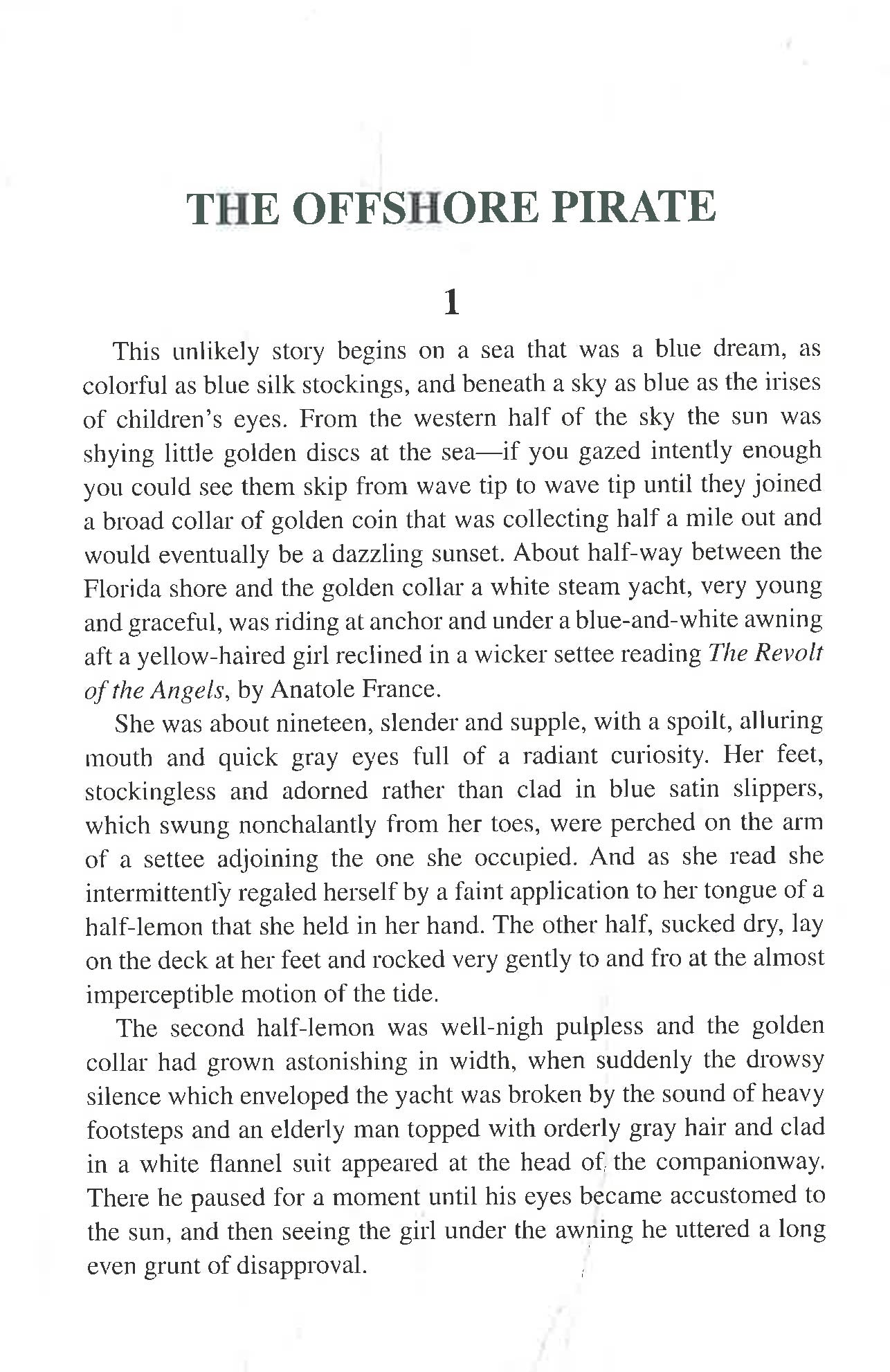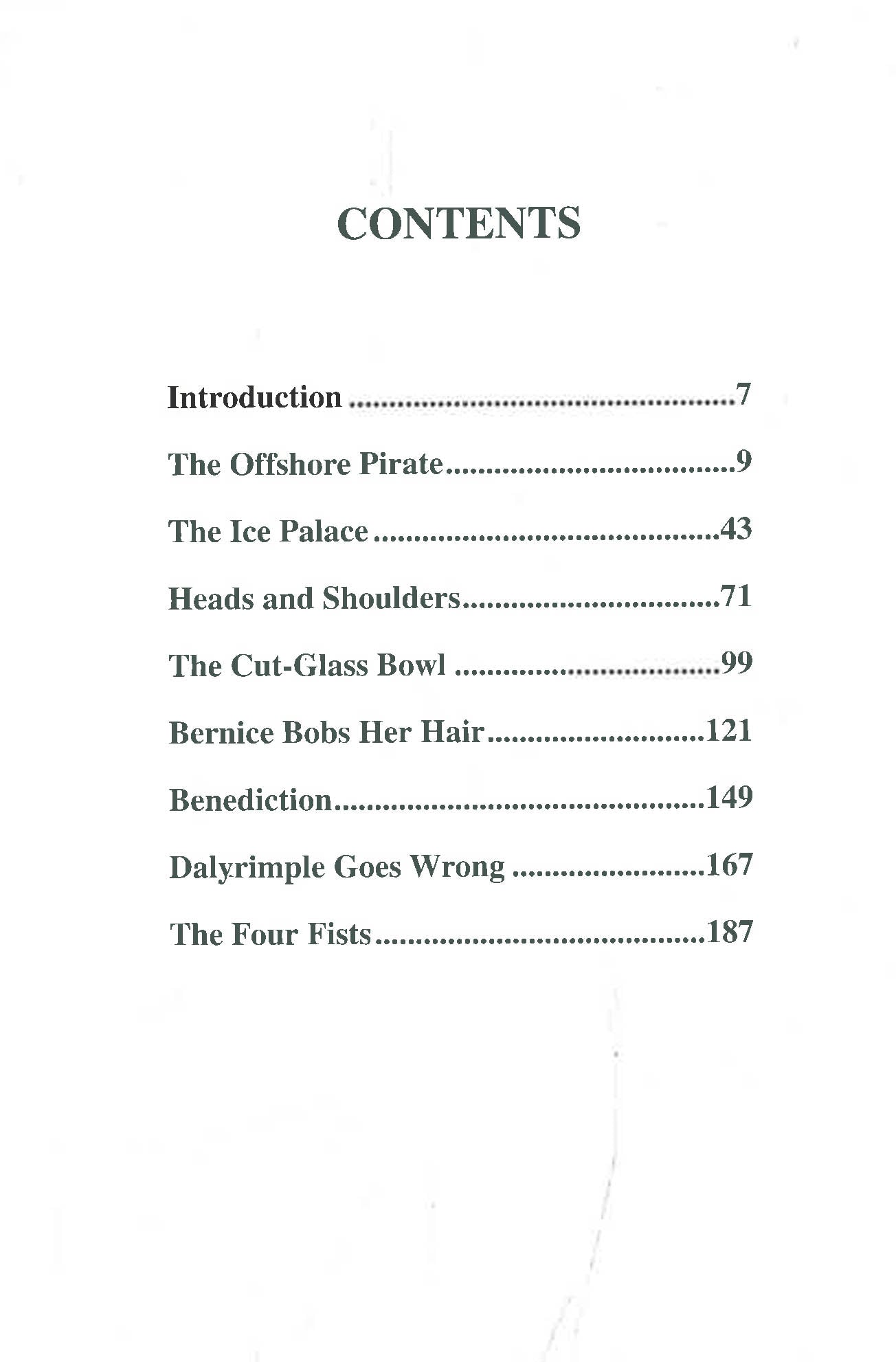 There are eight stories, including one of his most famous, "Bernice Bobs Her Hair". Other stories in this volume are "The Offshore Pirate" where the protagonist falls in love with the pirate who captured her; "Head and Shoulders", the tale of a couple who undergo a role reversal; and "The Cut-Glass Bowl" that is the recurring feature through various difficult or tragic events endured by a New York couple. The collection dates from the beginning of Fitzgerald's career and reveals an American society on the verge of jumping wholeheartedly into the brilliance of the "Jazz Age".