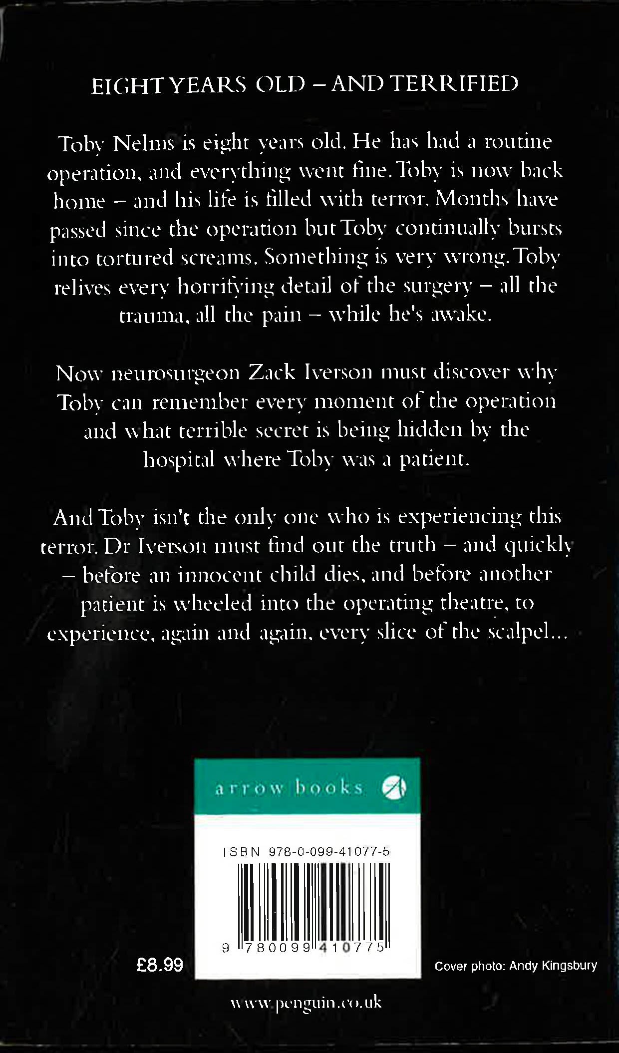 Toby Nelms is an ordinary 8-year-old boy who needs a routine operation. Toby is sent home.Months later, terror begins to take over Toby's life, and he keeps on bursting into tortured screaming.Toby Nelms is an ordinary 8-year-old boy who needs a routine operation. Everything seems to go well; the surgery is a success; Toby is sent home.Months later, terror begins to take over Toby's life, and he keeps on bursting into tortured screaming. He has begun to relive every moment of his operation - including the immense pain.Neurosurgeon Zack Iverson must discover why the young boy is re-experiencing every detail of the operation. And he must also uncover the horrifying secret that is being hidden by the hospital where Toby was treated. For Toby is not the only one who is suffering this strange and horrific effect after surgery. Iverson needs to find out the truth quickly, before an innocent child dies - and before another patient is wheeled into the Operating Room, to experience every slice of the scalpel's merciless blade