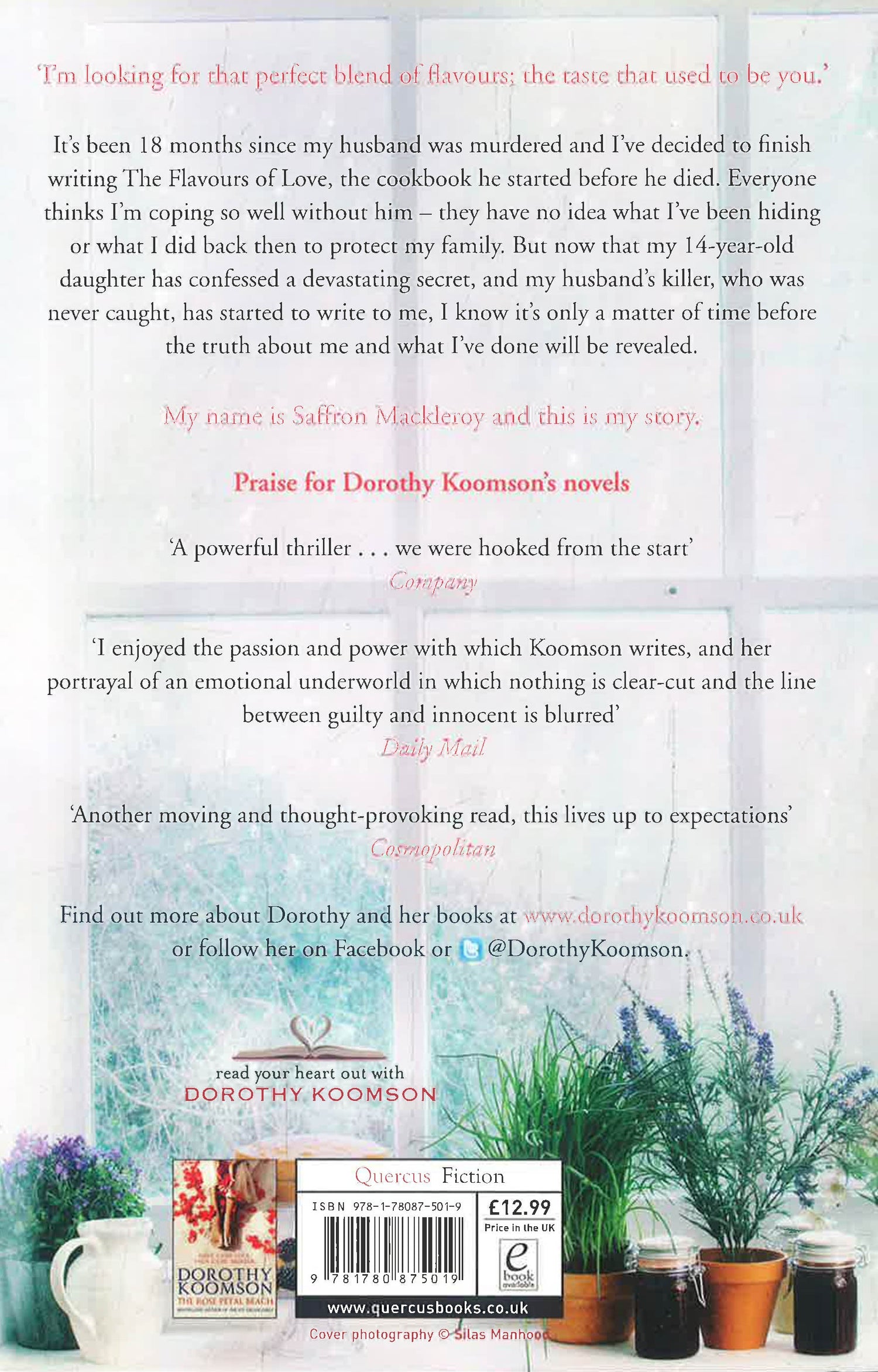 'I'm looking for that perfect blend of flavours; the taste that used to be you.' It's been 18 months since my husband was murdered and I've decided to finish writing The Flavours of Love, the cookbook he started before he died. Everyone thinks I'm coping so well without him - they have no idea what I've been hiding or what I did back then to protect my family. But now that my 14-year-old daughter has confessed a devastating secret, and my husband's killer, who was never caught, has started to write to me, I know it's only a matter of time before the truth about me and what I've done will be revealed. My name is Saffron Mackleroy and this is my story.