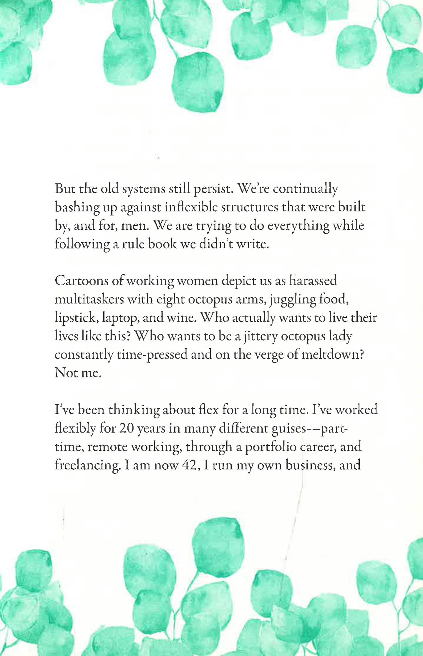 What happens when women embrace the concept of flex? We become more creative, more strategic with our time and energy, and more engaged with our personal lives. As Auerbach makes clear, we reject "our toxic culture of presenteeism, time-pressure, and ultimately burnout. It helps us escape the army of octopus lady jugglers, crazed with the exhaustion of "having it all." It allows us to live longer lives more sustainably. It gives us self-worth."