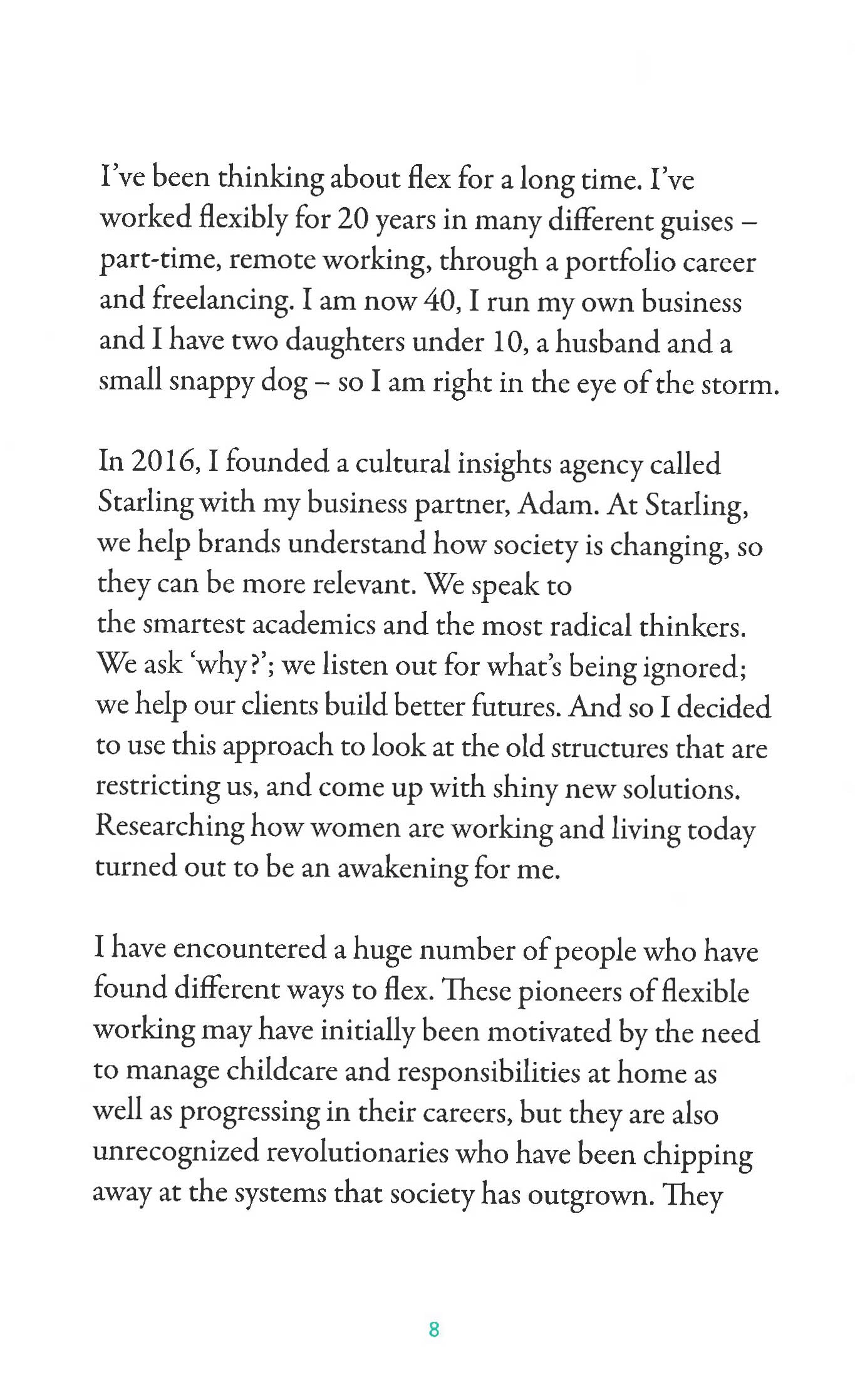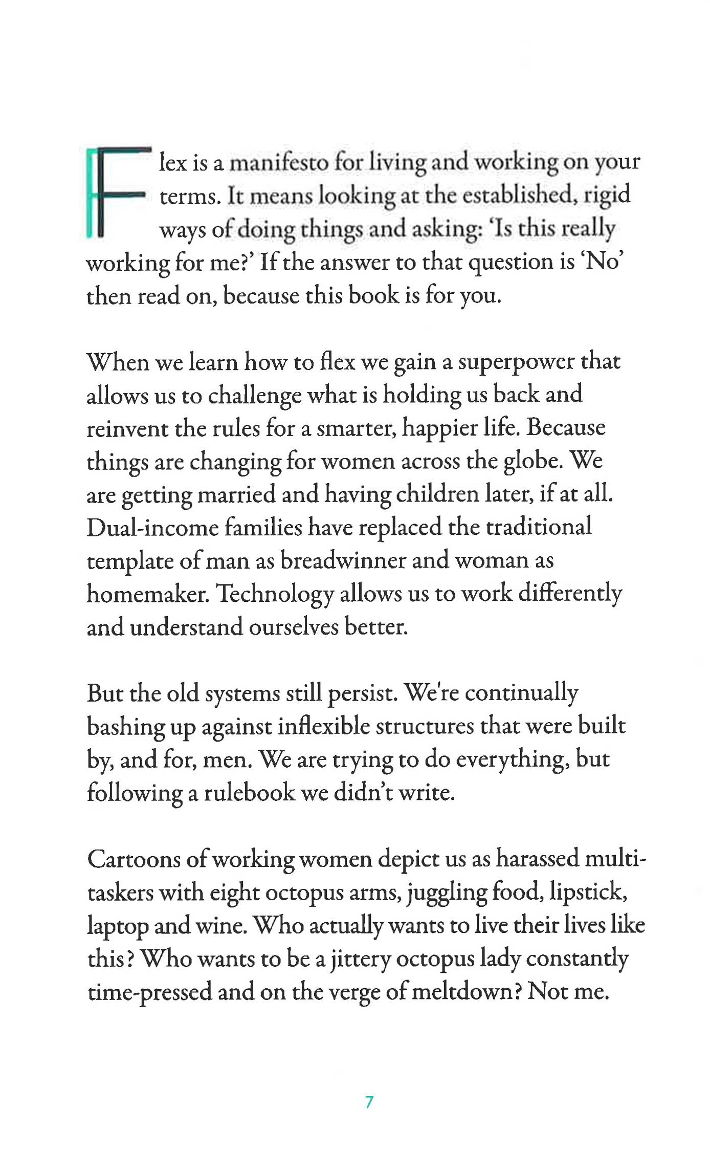 A beguiling exploration of how flexibility can contribute to creativity, purpose and happiness.' Justine Roberts, founder of Mumsnet 'Straight-talking self-help... Inspiring words, practical help and a fresh way of seeing things that we'll be forcing on just about everyone we know.'Stylist 'A no-nonsense guide to thinking and behaving more flexibly in order to have a happier, better, less frenetic life' Marie Claire As featured in Sunday Times Style, Stella, Stylist, Grazia, The Sun, Bustle, Marie Claire Reinventing the rules for a smarter, happier life. Flex is a creative, rebellious way to live. It's about looking at routines (like the nine to five) and social norms (like women bearing the brunt of the 'emotional load' at home) and bending and re-shaping them. Flex is looking within and understanding yourself, your body and the patterns of your relationships, and working out how to live, earn money and be happy in a way that is perfect for you and your unique talents. Flex is knowing that the world is changing fast. The jobs we were trained for in school won't exist in a decade. The career ladder has been replaced with the portfolio. If you feel stuck, tired, not at your best, bored... this book is for you.If you are burning with ideas but stuck in an environment that squashes them... this book is for you.If you are a rebel at heart... this book is for you. Flex is reinventing the rules for a smarter, happier future.