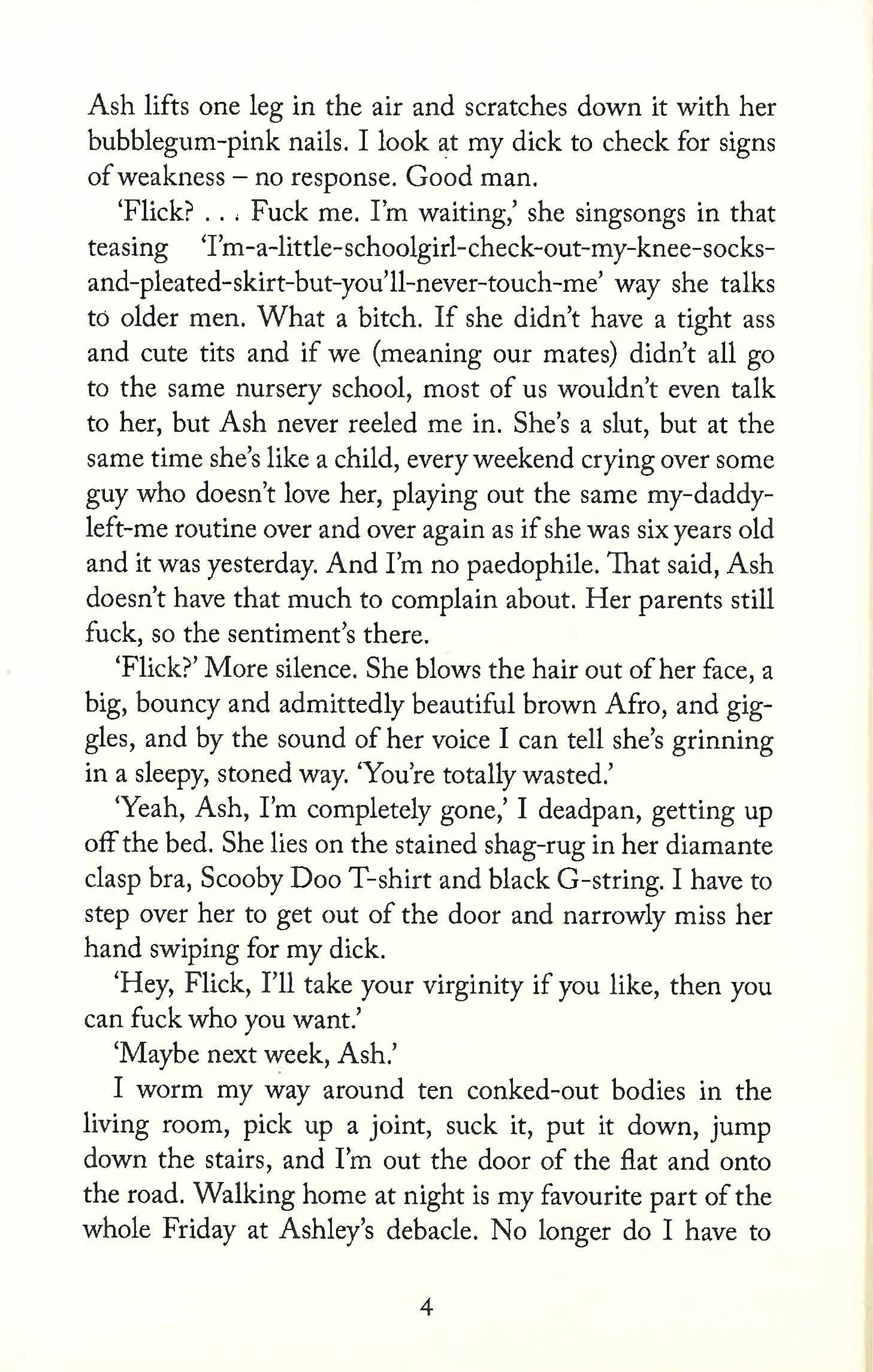 My name is Flick and these are my images of my disconnected life, my forgettable weeks and unforgettable weekends. I am one of the disaffected youth.'Stranded in his home town by a lack of education, cash and anything better to do, Will Flicker, a.k.a. 'Flick', muses on whether Pepsi is better than Coke, the Art of the Right Amount of Stoned and why Rainbow, the new girl in town, is just so much hotter than the losers and users he counts as friends.But when a dangerous figure from the past threatens his future with Rainbow, Flick finds himself torn between the ties that bind him to his old life and the freedom that she represents.
