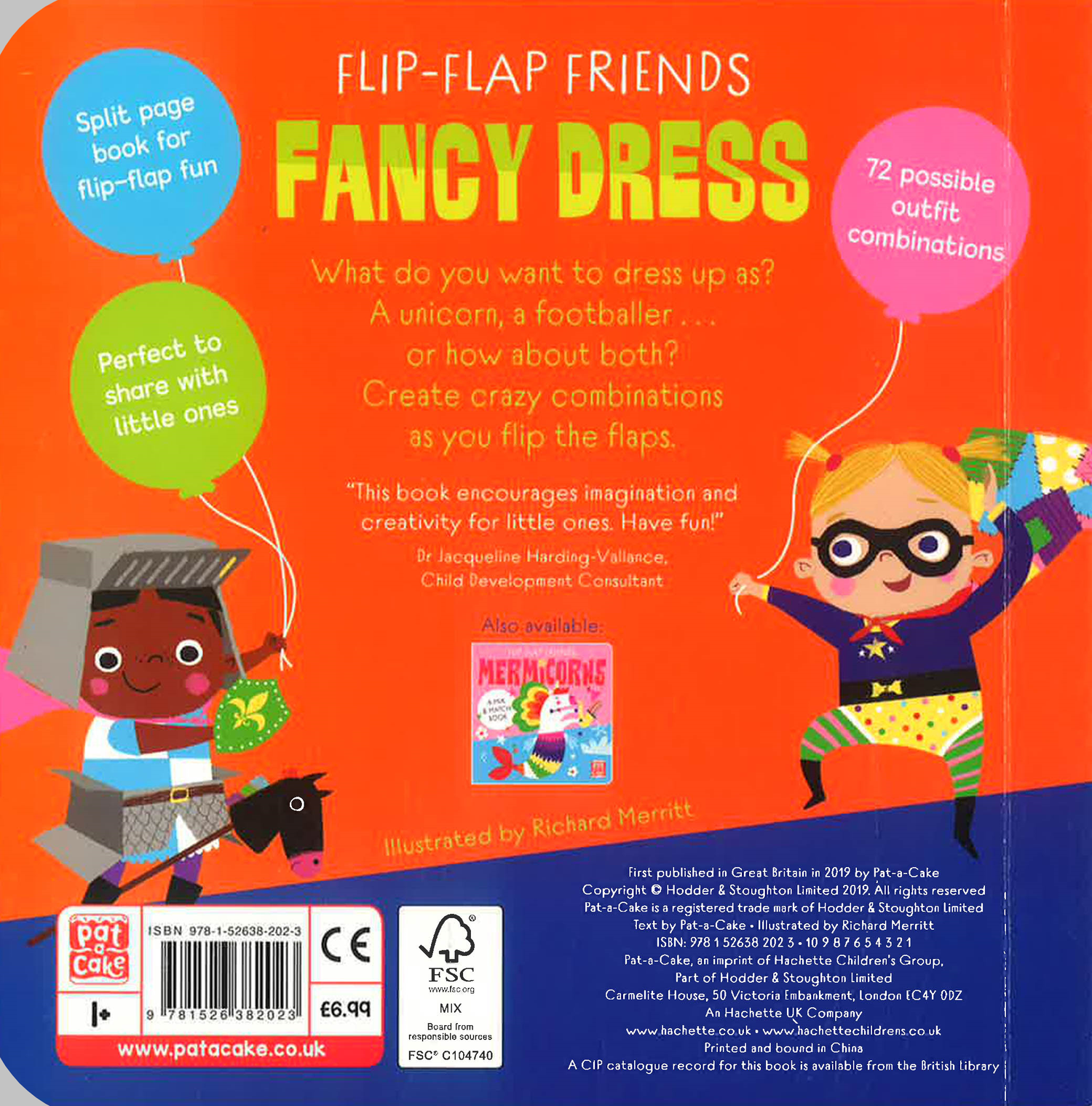 Mix and match fun fancy dress costumes to make lots of new flip flap friends with this colourful split-page book. Watch as spacesuits, tiger costumes and footballers get all mixed up in this rainbow book of new fancy dress friends. With 72 possible combinations to mix and match, children will keep coming back for more flip-flap fun.