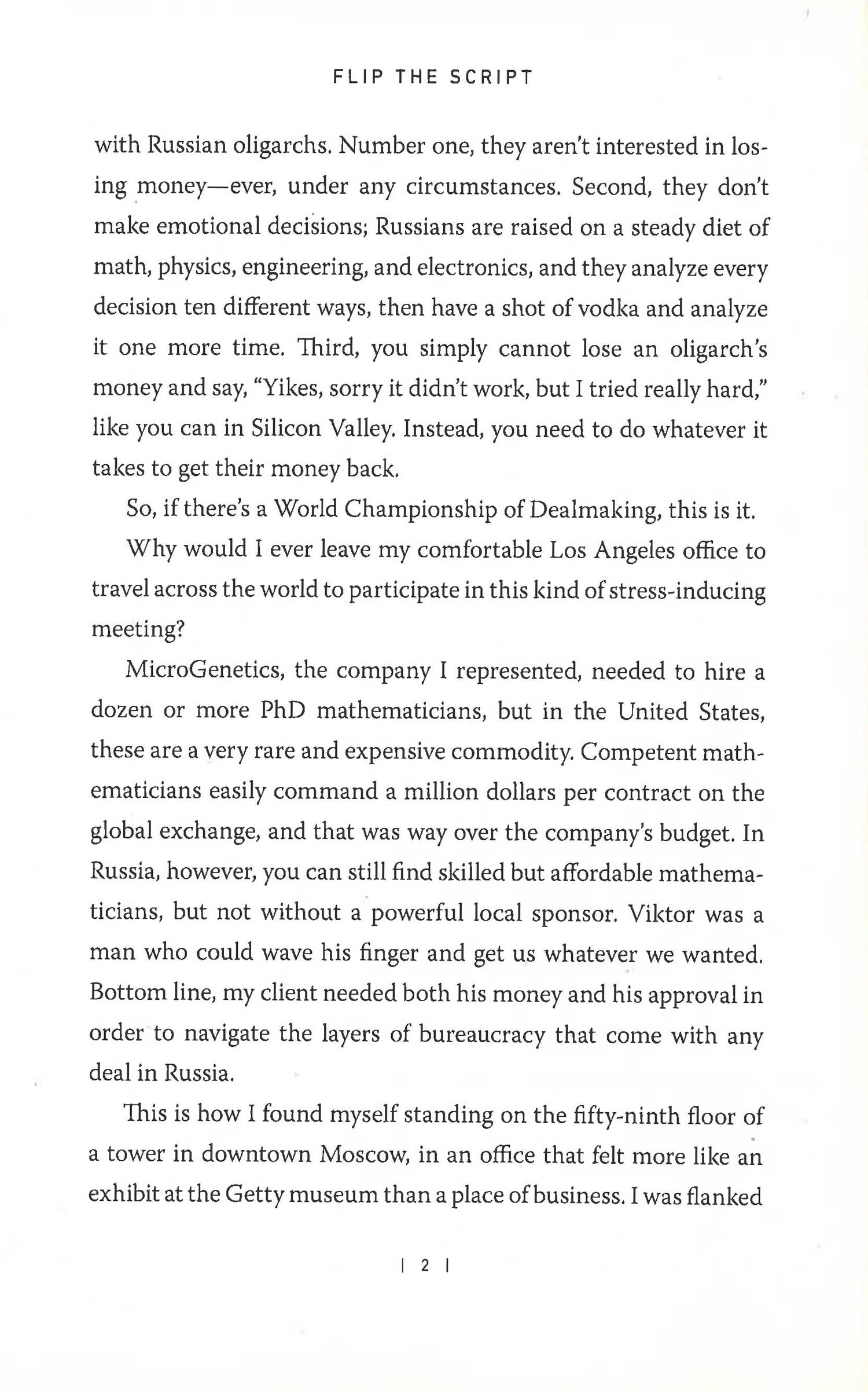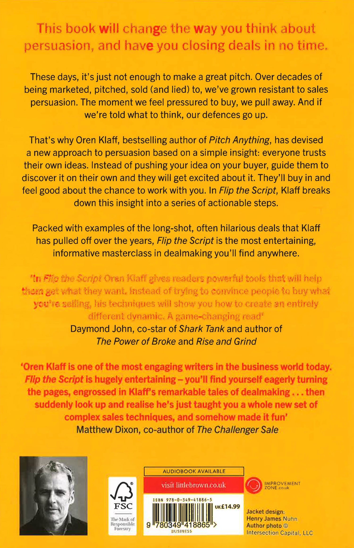 This book will change the way you think about persuasion, and have you closing deals in no time.These days, it's just not enough to make a great pitch. Over decades of being marketed, pitched, sold (and lied) to, we've grown resistant to sales persuasion. The moment we feel pressured to buy, we pull away. And if we're told what to think, our defences go up. That's why Oren Klaff, bestselling author of Pitch Anything, has devised a new approach to persuasion based on a simple insight: everyone trusts their own ideas. Instead of pushing your idea on your buyer, guide them to discover it on their own and they will get excited about it. They'll buy in and feel good about the chance to work with you. In Flip the Script, Klaff breaks down this insight into a series of actionable steps.You will learn how to:*Achieve Status Alignment: Use a status tip-off, a strategically placed remark that identifies you as an insider who can relate to your client's concerns.*Close the Certainty Gap: Allay your buyer's fears about going into business with you by delivering a flash roll, proving your expertise in the domain.*Present Your Idea as Plain Vanilla: Don't overhype your product as a first-of-its-kind solution. The more you emphasise the familiar, reliable elements of your product, the easier you make it for your buyer to say yes.Packed with examples of the long-shot, often hilarious deals that Klaff has pulled off over the years, Flip the Script is the most entertaining, informative masterclass in dealmaking you'll find anywhere. It will transform your approach to pitching, leaving you fully prepared to raise money, seal deals and keep your cool in the toughest business situations.