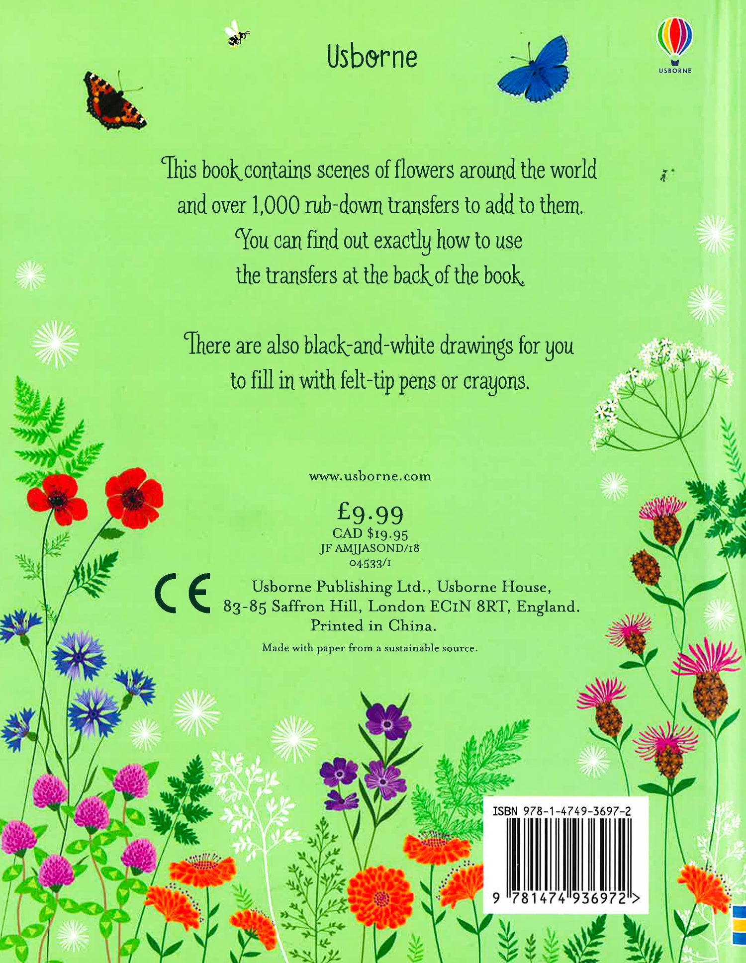 Decorate the pages of this elegantly illustrated book with transfers and crayons to create beautiful scenes of flowers around the word. Each double page has delicate drawings to colour in and a detailed scene to fill with over 1,000 rub-down floral transfers. The transfers are stored in a wallet inside the front cover to keep them safe.