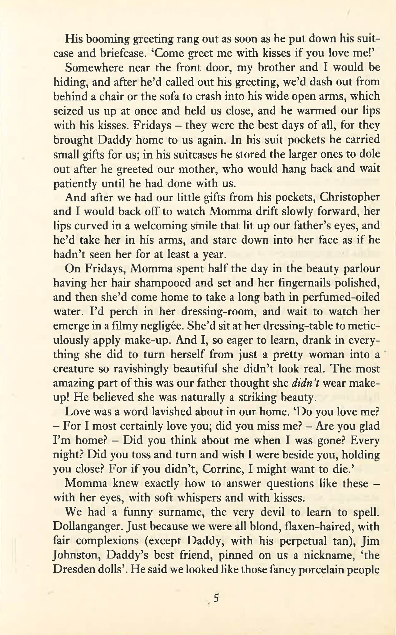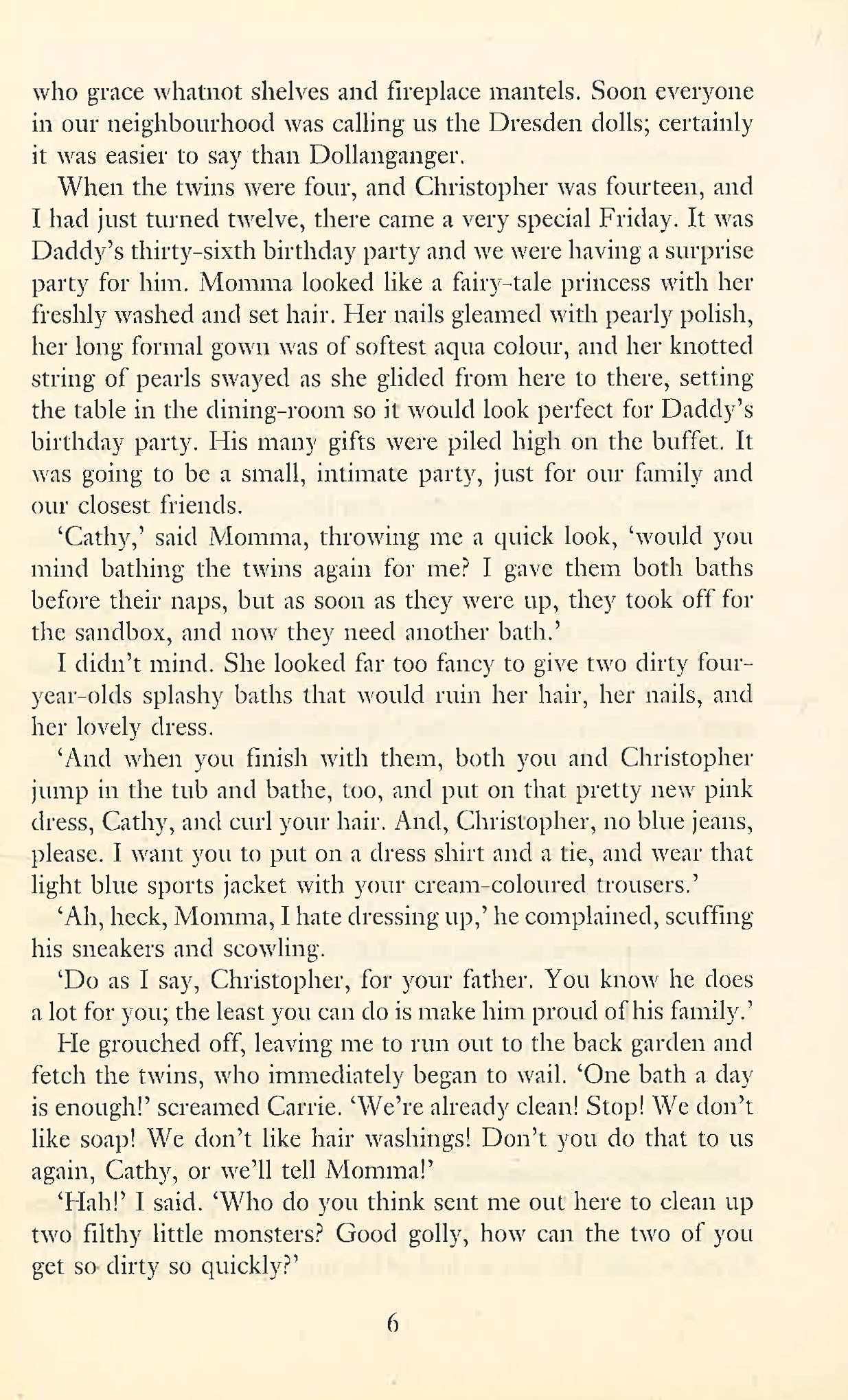 Such wonderful children. Such a beautiful mother. Such a lovely house. Such endless terror! It wasn't that she didn't love her children. She did. But there was a fortune at stake—a fortune that would assure their later happiness if she could keep the children a secret from her dying father. So she and her mother hid her darlings away in an unused attic. Just for a little while. But the brutal days swelled into agonizing years. Now Cathy, Chris, and the twins wait in their cramped and helpless world, stirred by adult dreams, adult desires, served a meager sustenance by an angry, superstitious grandmother who knows that the Devil works in dark and devious ways.