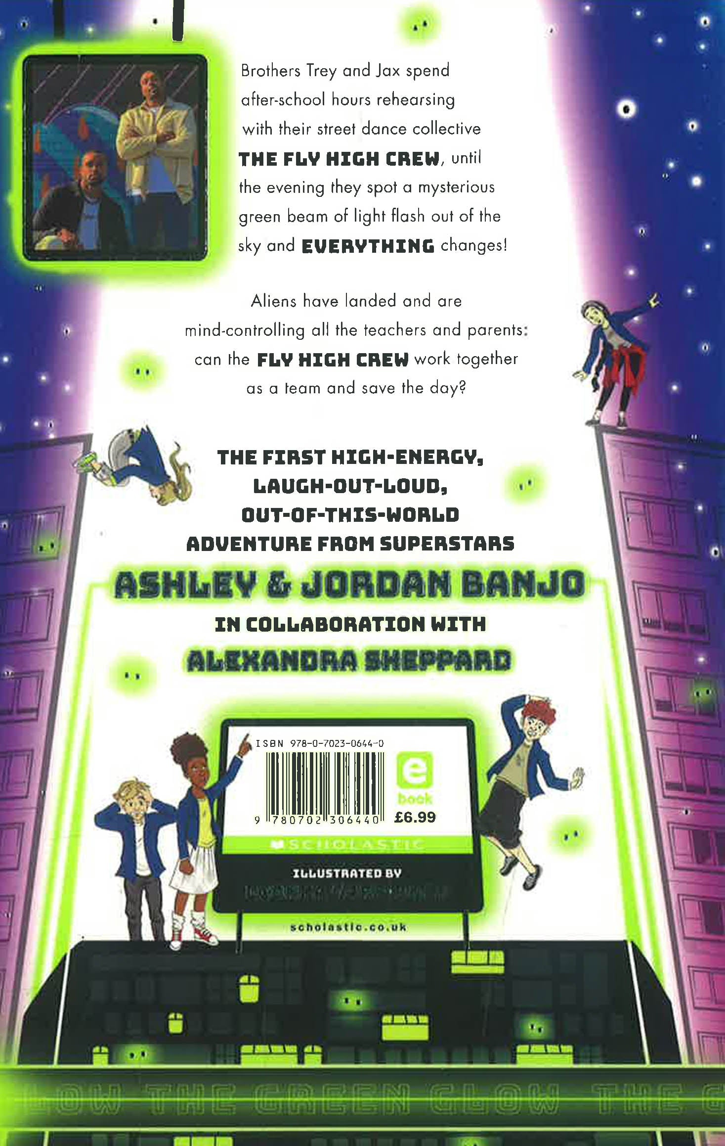 An action-packed, laugh-out-loud, high-energy story for boys and girls featuring adults taken over by aliens and a brave group of kids who must work together as a team to stop them! From TV personalities and Diversity street dance superstars, brothers Ashley and Jordan Banjo. Brothers Trey and Jax spend after-school hours rehearsing with their street dance collective the Fly High Crew, until the evening they see a green beam of light flash out of the sky and are thrown into an out-of-this-world adventure! Aliens have landed and are mind-controlling all the teachers and adults: can the Fly High Crew work together as a team and save the day? Written in collaboration with Alexandra Sheppard Full of fantastic art by Dionna Gary Bunn For fans of Tom Fletcher and Alesha Dixon.