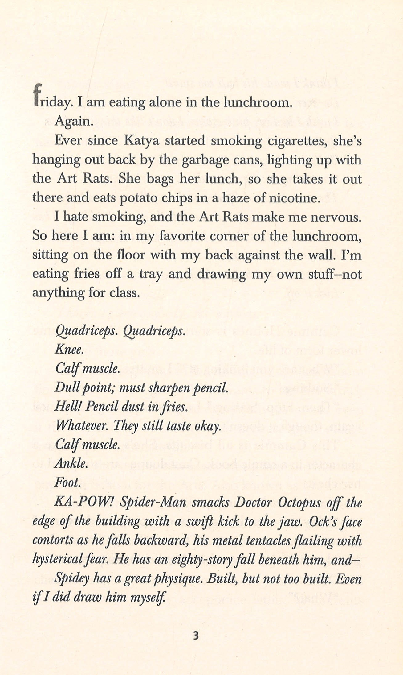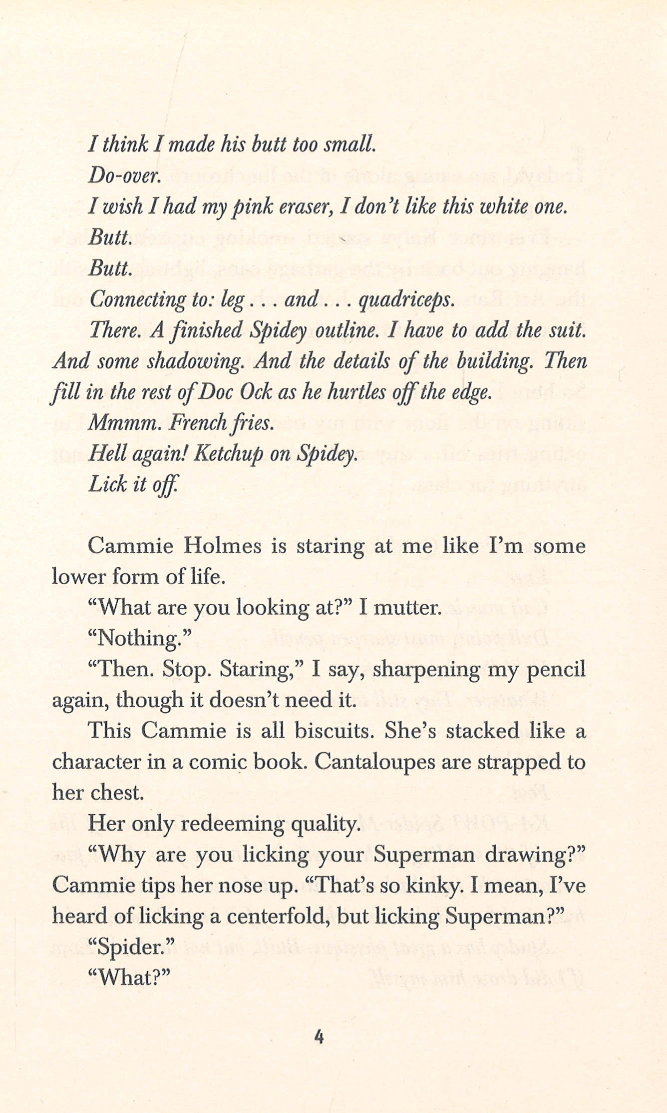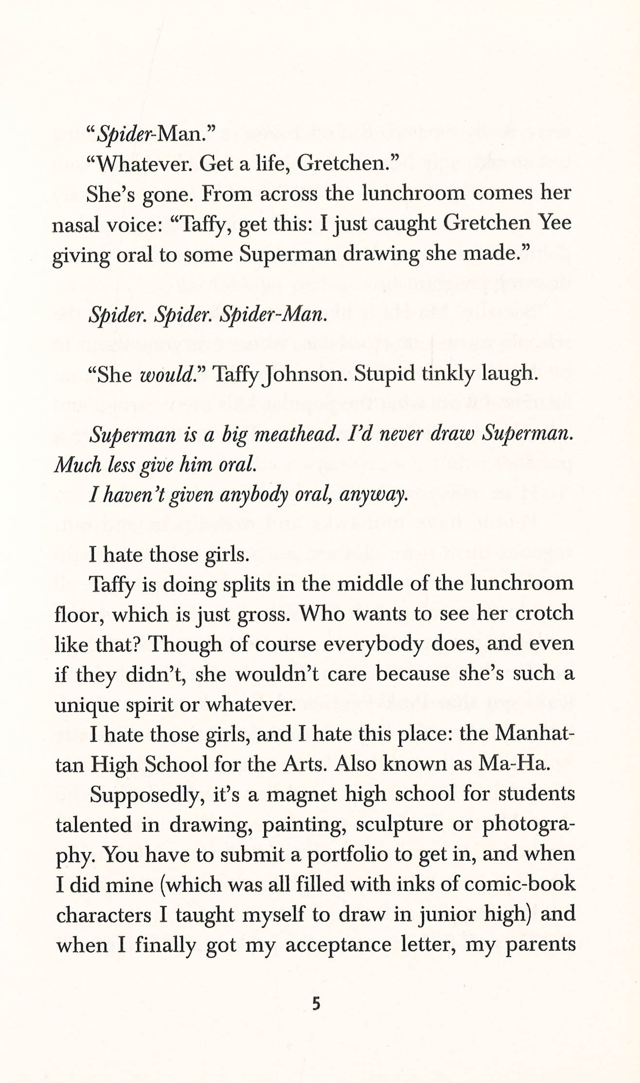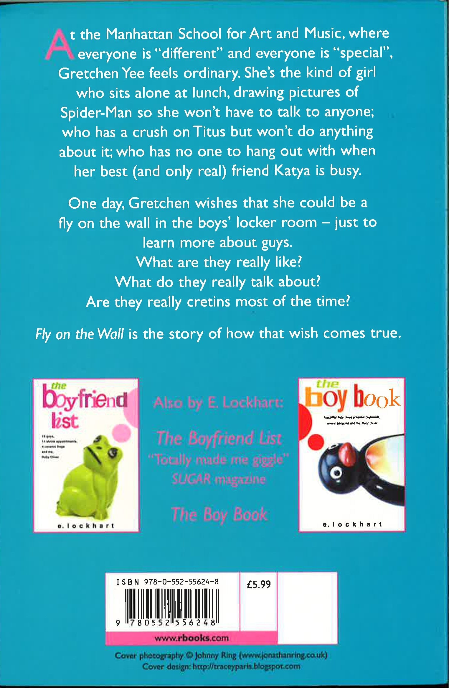 At the Manhattan School for Arts, where everyone is 'different' and everyone is 'special', Gretchen Yee feels ordinary. She sits alone at lunch, drawing pictures of spider-man, so she won't have to talk to anyone; has a crush on Titus but won't do anything about it and has no one to hang out with when her best (and only real) friend Katya is busy. One day, Gretchen wishes that she could be a fly on the wall in the boys' locker room - just to learn more about guys. What are they really like? What are they really cretins most of the time? "Fly on the Wall" is the story of how that wish comes true.