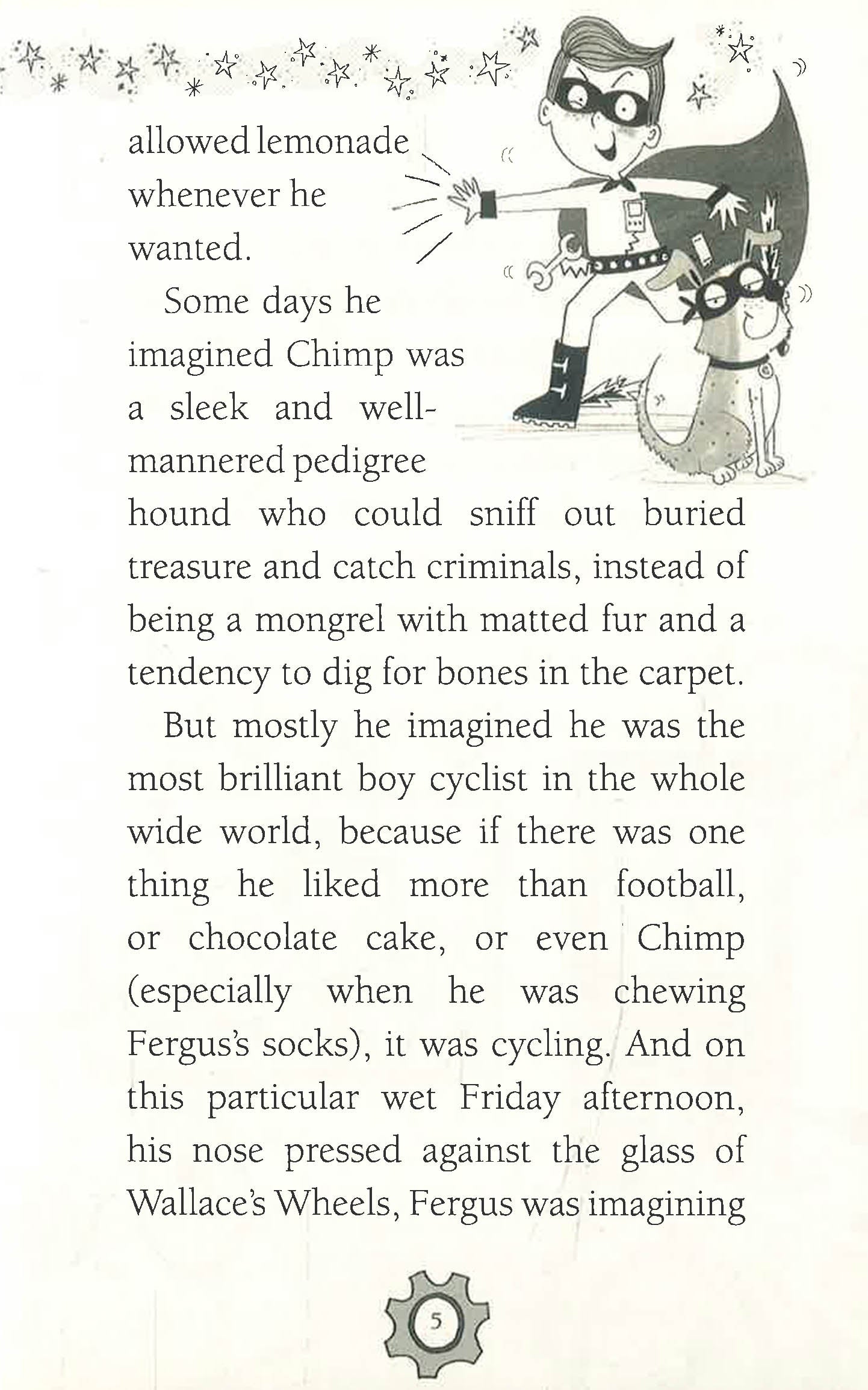 Fergus Hamilton is a boy with a big imagination. Living with his mum and grandad and his dog, Chimp, he dreams of a state-of-the-art Sullivan Swift and becoming the most brilliant boy cyclist in the world. So when he gets a rusty second-hand bike for his ninth birthday he can’t help feeling a bit disappointed. But then he discovers something amazing when he takes it for a ride. . .