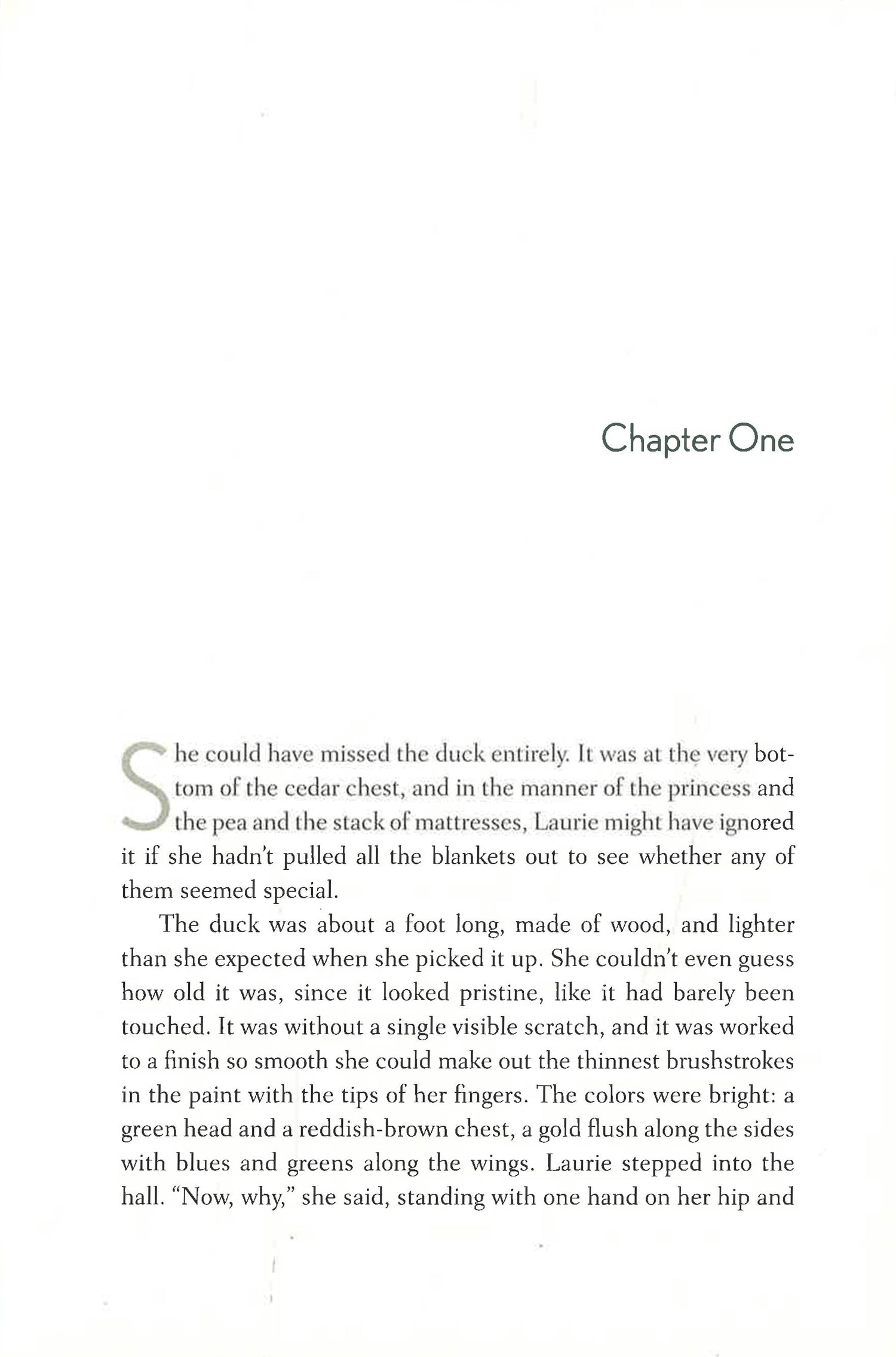 Smarting from her recently canceled wedding and about to turn forty, Laurie Sassalyn returns to her Maine hometown of Calcasset to handle the estate of her great-aunt Dot, a spirited adventurer who lived to be ninety-three. Alongside boxes of Polaroids and pottery, a mysterious wooden duck shows up at the bottom of a cedar chest. Laurie's curiosity is piqued, especially after she finds a love letter to the never-married Dot that ends with the line "And anyway, if you're ever desperate, there are always ducks, darling."