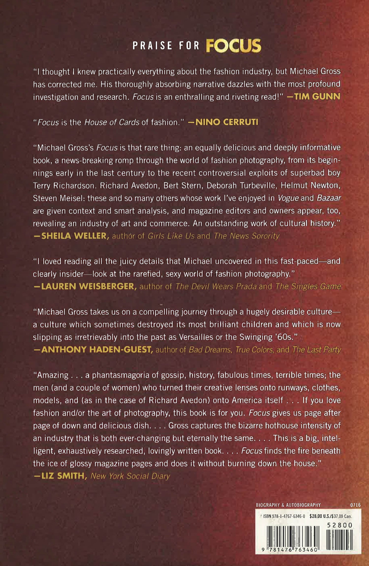 In this rollicking account of fashion photography's golden age, the New York Times bestselling author of Model and House of Outrageous Fortune, Michael Gross, brings to life the wild genius, ego, passion, and antics of the men (and a few women) behind the camera. Before Instagram was an art form, fashion photographers and the models they made famous were pop culture royalty. From the postwar covers of Vogue to the triumph of the digital image, the fashion photographer sold not only clothes but ideals of beauty and visions of perfect lives. Even when they succumbed to temptation and excess--and did they ever--the very few photographers who rose to the top were artists, above all. Focus probes the lives, hang-ups, and artistic triumphs of more than a dozen of fashion photography's greatest visionaries: Richard Avedon, Irving Penn, Melvin Sokolsky, Bert Stern, David Bailey, Bill King, Deborah Turbeville, Helmut Newton, Gilles Bensimon, Bruce Weber, Steven Meisel, Corinne Day, Bob and Terry Richardson, and more. From Avedon's haute couture fantasies and telling portraits to Weber's sensual, intimate, and heroic slices of life, and from Bob Richardson's provocations to his son Terry's transgressions, Focus takes readers behind the scenes to reveal the revolutionary creative processes and fraught private passions of these visionary magicians. Tracing the highs and lows of fashion photography from the late 1940s to today, Gross vividly chronicles the fierce rivalries between photographers, fashion editors, and publishers like Conde Nast and Hearst, weaving together candid interviews, never-before-told insider anecdotes and insights born of his three decades of front-row and backstage reporting on modern fashion. An unprecedented look at an eccentric and seductive profession and the men and women who practice it on the treacherous shifting sands of pop and fashion culture, Focus depicts--perhaps most importantly--the rewards and cost, both terribly high, of translating an artist's vision of beauty for an often cold and cruel commercial reality. *This book may have remainder mark*