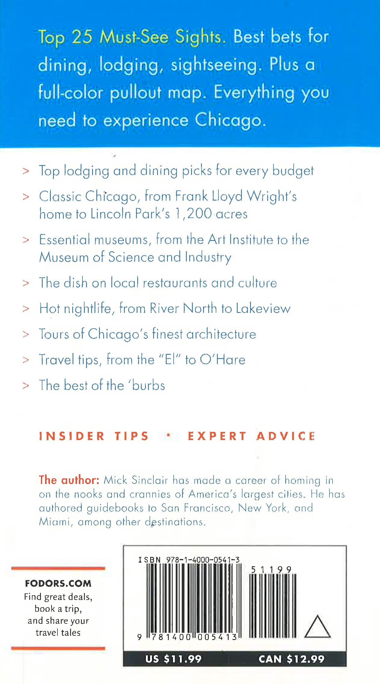 Fodor's. For Choice Travel Experiences. Fodor's helps you unleash the possibilities of travel by providing the insightful tools you need to experience the trips you want. While you're at the helm, Fodor's offers the assurance of our expertise, the guarantee of selectivity, and the choice details that truly define a destination. It's like having a friend in Chicago! Fodor's 25 Best Chicago contains EVERYTHING YOU NEED to experience Chicago, focusing on the top 25 must-see sights plus- - FULL-COLOUR PULL-OUT MAP housed in a convenient envelope affixed to the guide CHICAGO BY AREA we ve broken the city into five areas and recommended the best sights, shops, entertainment venues, nightlife, and restaurants in each one BEST HOTELS, whether you're looking for luxury, budget, or something in between INSIDER TIPS and EXPERT ADVICE Transportation Map Visit Fodors.com for more ideas and information, travel deals, vacation planning tips, reviews and to exchange travel advice with other travelers.