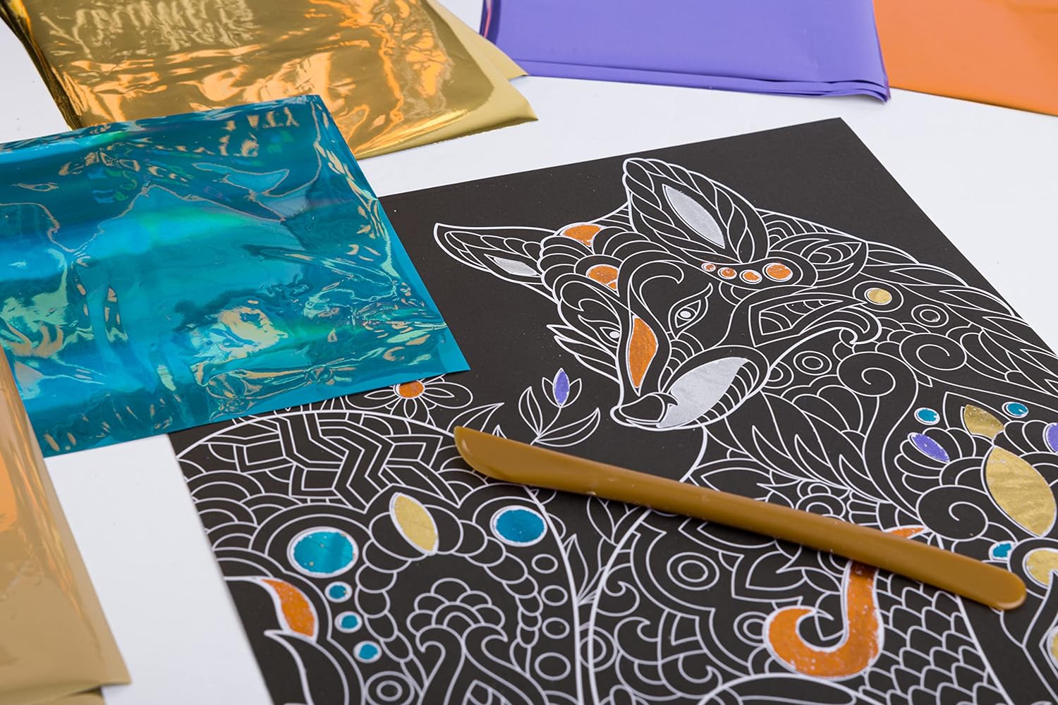 Get ready for an art kit that combines colouring with stickers for a whole new kind of visual experience with the Kaleidoscope Creativity Foil Art Animals. In this innovative kit rather than using standard markers, you use foil sheets to create incredible animal masterpieces. It's so easy to start creating your stunning animal images, just peel back the sticky adhesive areas and use the glittering foil sheets to transform each picture into a sparkly, shiny masterpiece. This kit includes 30 sheets of coloured foil, 8 sticker sheets, instructions and a multi-use tool all held within a handy binder so you're ready start your creative journey! What's Included: 8 stunning images to decorate 30 sheets of coloured foil Multi-use stylus tool