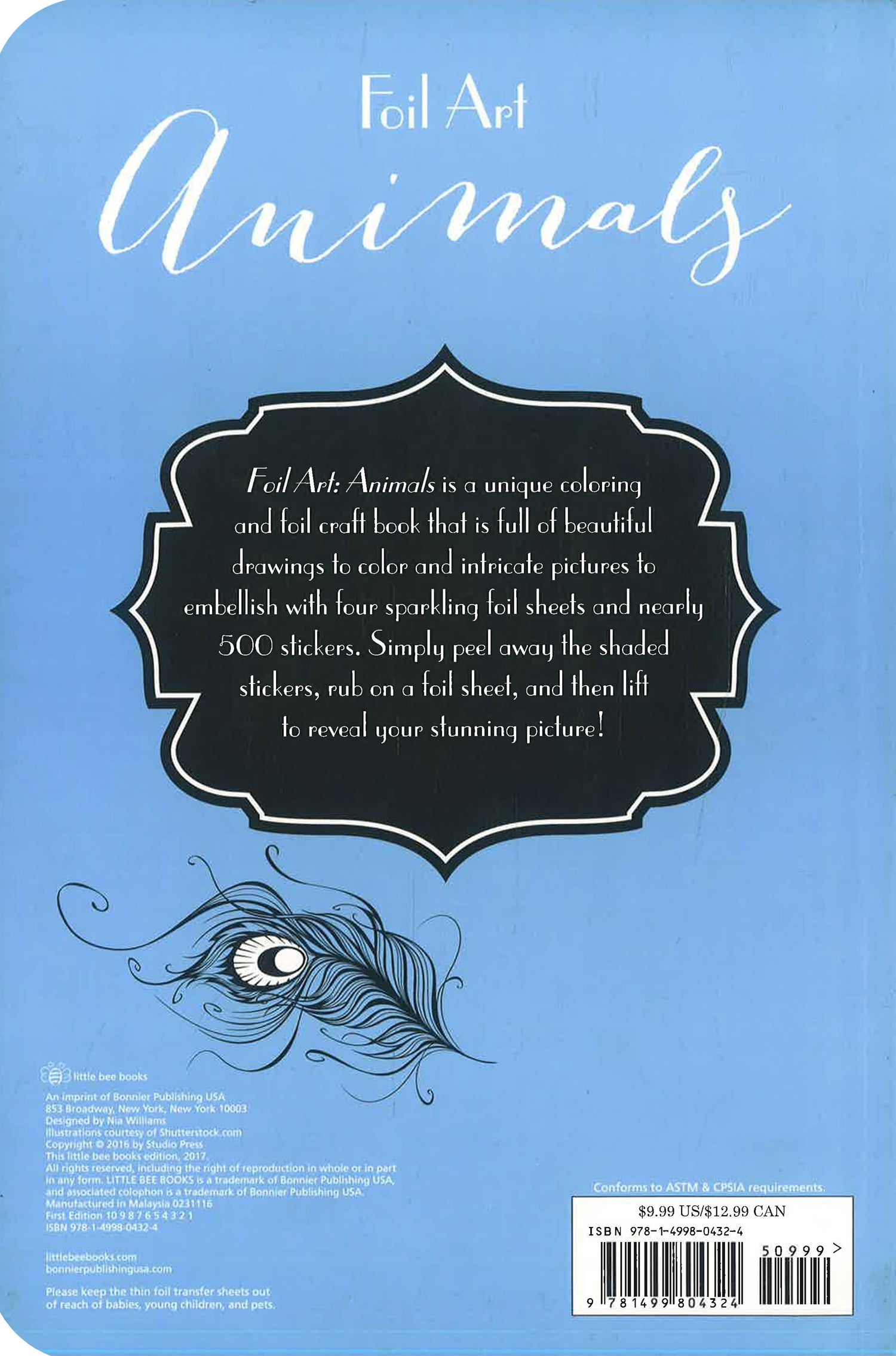 Kids can beautifully illustrated color and decorate animal silhouettes with foiled sheets. There are ten special pictures to reveal by first peeling off the sticker and then rubbing the colored foil onto the sticky surface in this unique and beautiful activity book! There are also a sheet of stickers and 23 pages to color on your own. Discover the world of Foil Art Animals with lyrical quotes from authors such as Charles Dickens, William Shakespeare, and Sir Walter Scott. From tiny hummingbirds and butterflies to magnificent eagles and elephants, there are lots of intricate animal illustrations for kids to decorate.