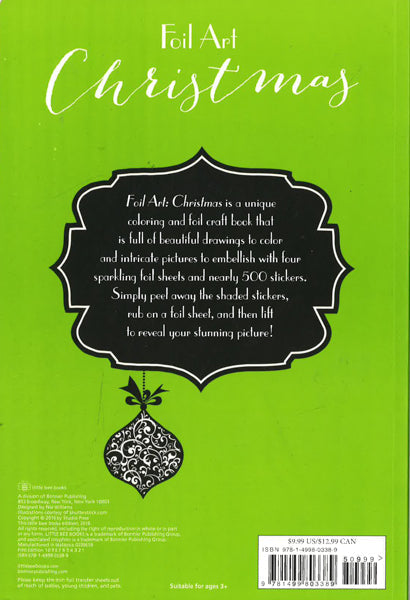Christmas silhouette illustrations and wintry scenes are beautifully illustrated as intricate pictures to color and decorate with the foiled stickers. There are ten special pictures to peel, rub, and reveal as you embellish them with the colored foil sheets in this unique and beautiful activity book! The coloring pages feature images of Christmas decorations, Christmas trees, wintry scenes, and other classic festive images together with Christmas and winter-inspired quotes and poetry.