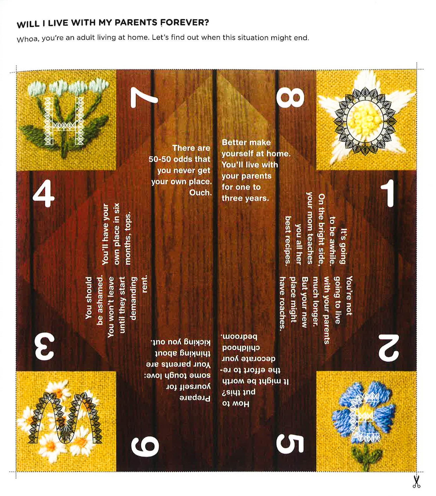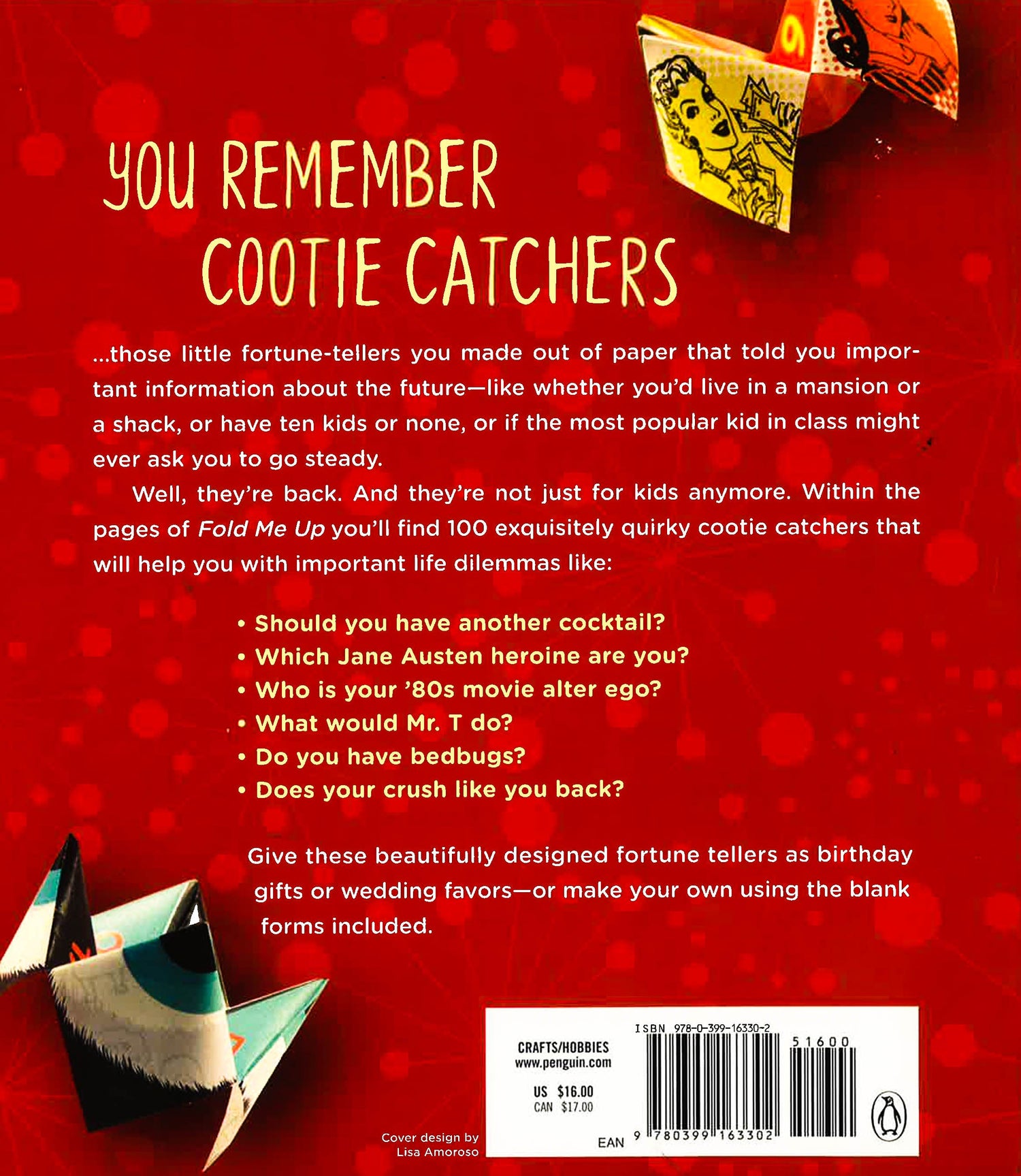 Cut them out. Fold them up. Have fun. A grown-up twist on a childhood classic-exquisitely designed paper fortune-tellers.Cootie catchers aren't just for kids anymore! These 100 paper fortune tellers provide a fresh take on a childhood favorite with answers/strategies for handling tough adult situations and answering important life dilemmas like:Should you have another cocktail?What Jane Austen heroine are you?Your '80s movie alter ego I'm breaking up with you (with this cootie catcher)What would Mr. T do?The hipster wedding decorationImportant messages from cute puppiesEmergency excuse generatorEach fortune teller features a unique and colorful design created specifically for this collection, including contributions from such design luminaries as Noah Scalin (creator of the Skull-a-Day project), Stefan Bucher (creator of dailymonster.com), textile designer Jessica Jones, and more. (There are even a few blank ones so readers can get out what's on their minds.)