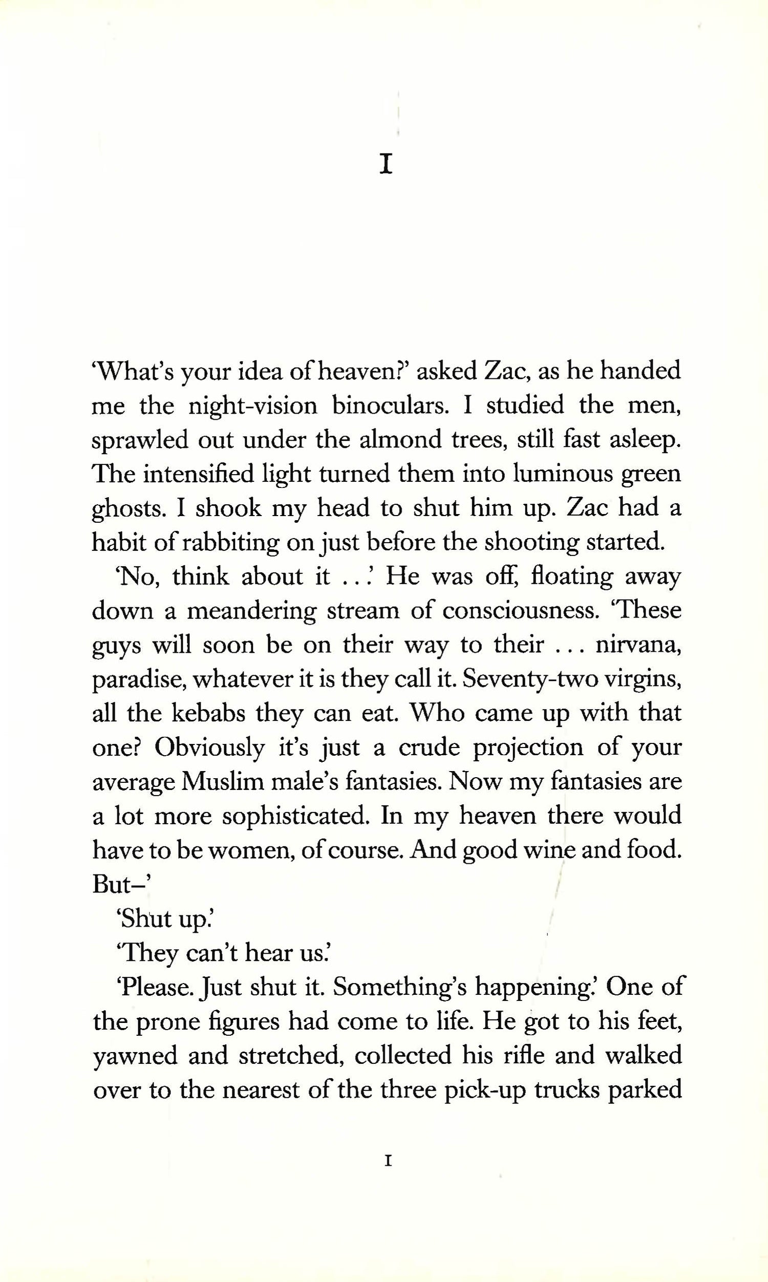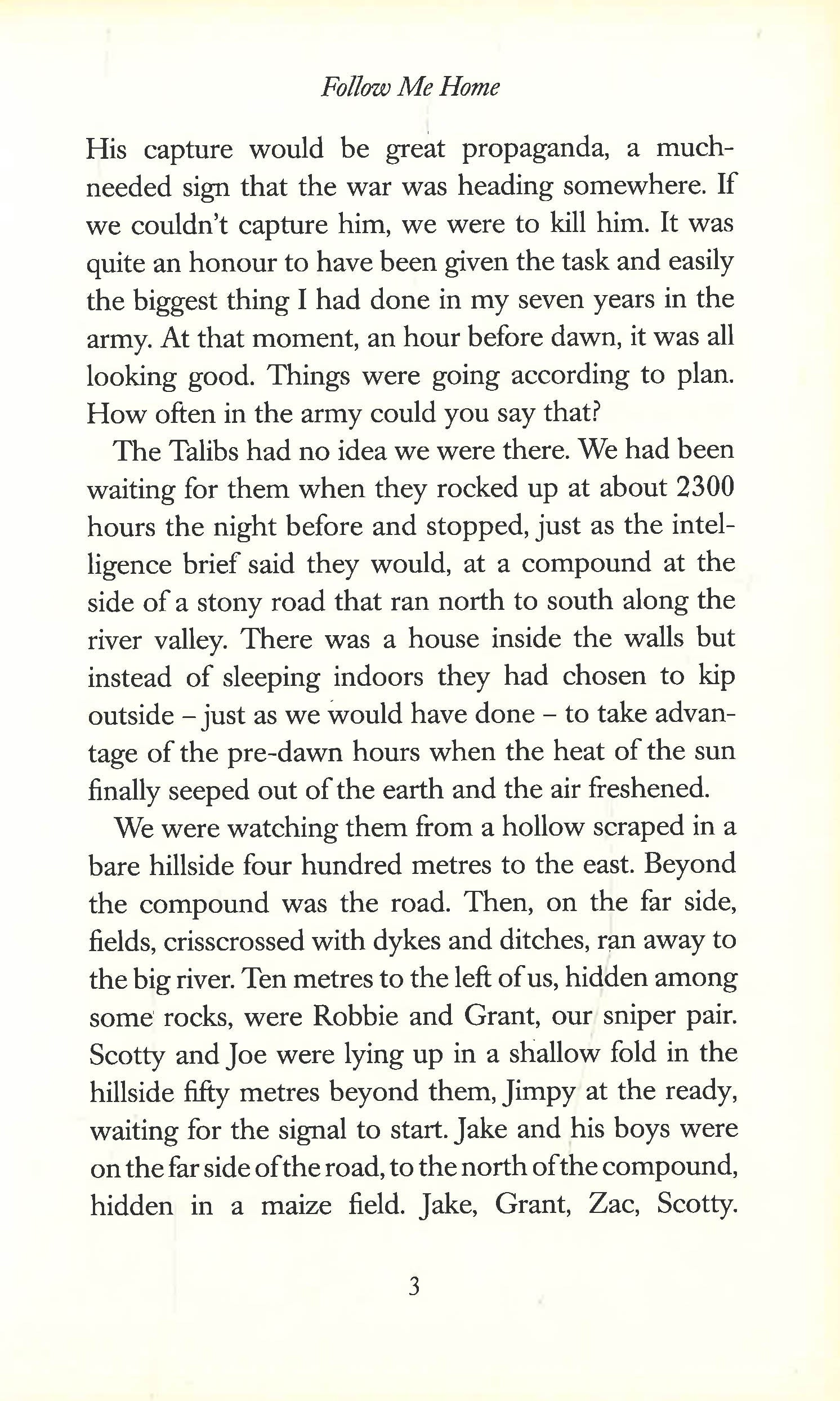 High summer in Helmand Province, Afghanistan.Two young soldiers, Milo and Zac, are on a mission which could really make their names. Their special duties team is to ambush and capture a notorious Taliban leader.The operation has been meticulously planned and set up. But suddenly - all is chaos.The hunters are now the hunted. To reach safety they must make their way through fifty kilometres of hostile territory, with a Taliban captive and a young, frightened woman in tow. Perilous at every turn, the journey is the biggest test any of them has ever faced, and it will change their lives forever.