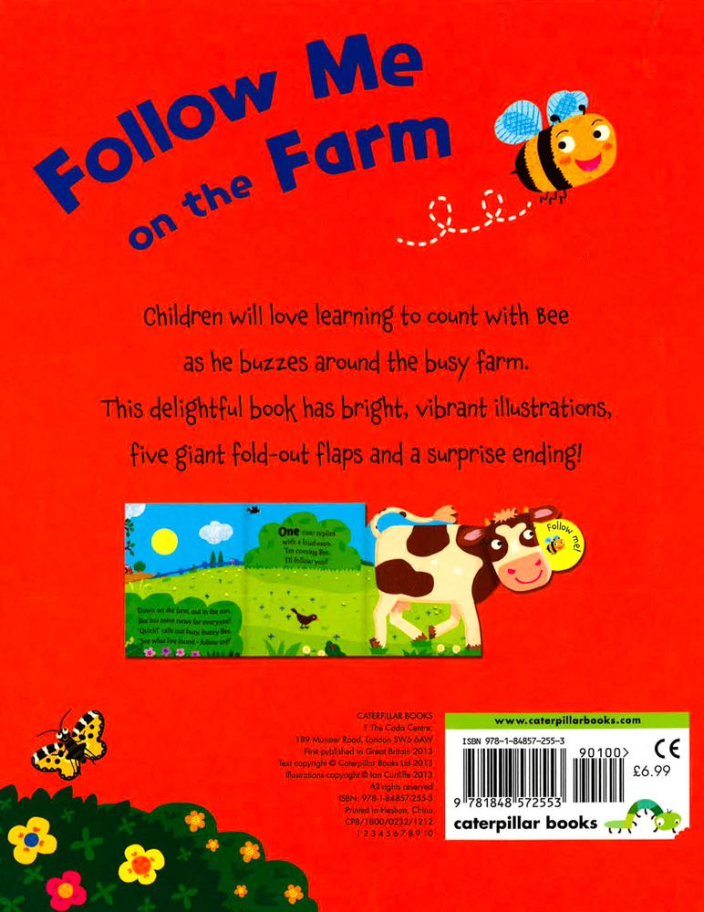 Ideal for toddlers learning to count, "Follow Me on the Farm" is a beautiful, bright lift-the-flap book full of favourite farm animals and first numbers. Children will love following Bee as he buzzes around the busy farm, sharing his exciting news with the friendly animals. Watch Bee persuade the animals to follow him and count each one. This delightful counting book has five giant fold-out flaps for little hands and a surprise ending.