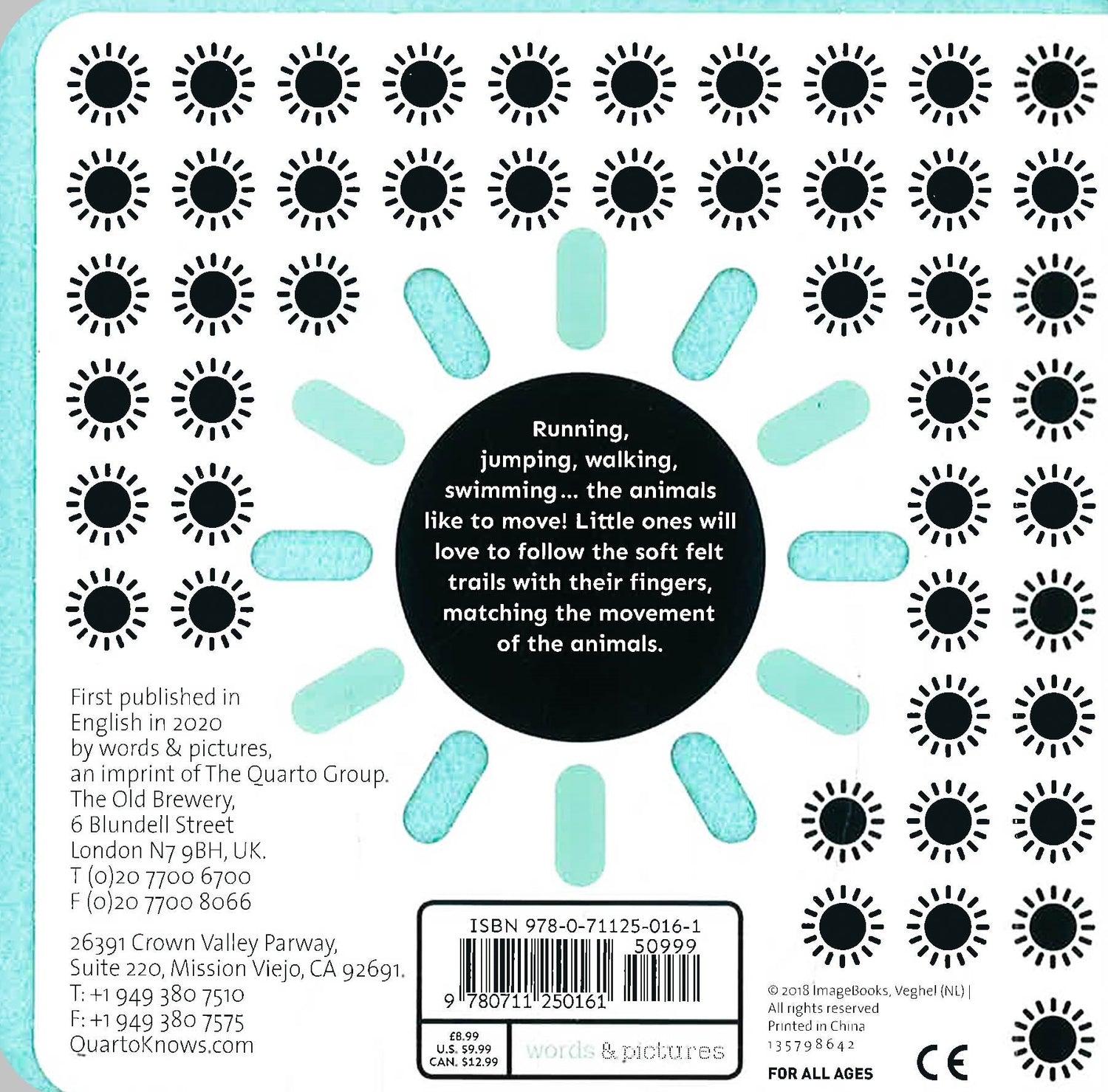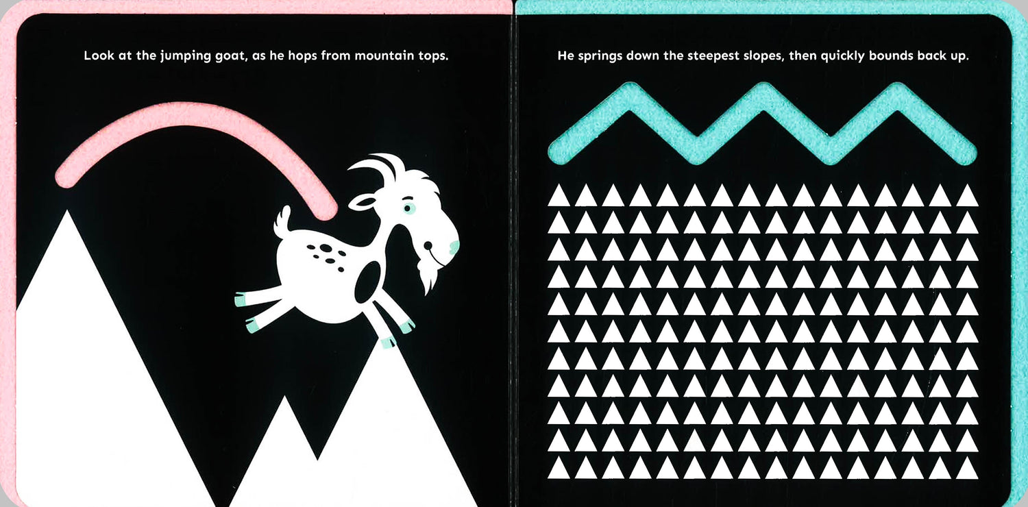 Gently rhyming text explores 8 different animals and how they like to move, in this delightful board book. A felt layer between each page, encourages your little one to practice turning the easy-to-hold felt edges themselves, while little fingers can also trace the soft, felt patterns to engage with the story and improve hand-eye coordination. Bold, simple artwork is specially created with minimal colours and black lines to appeal to young children and babies.
