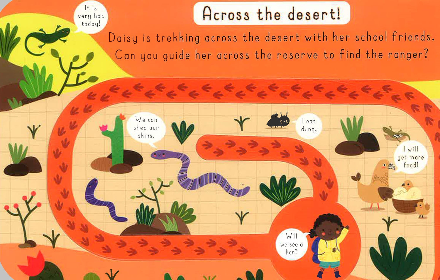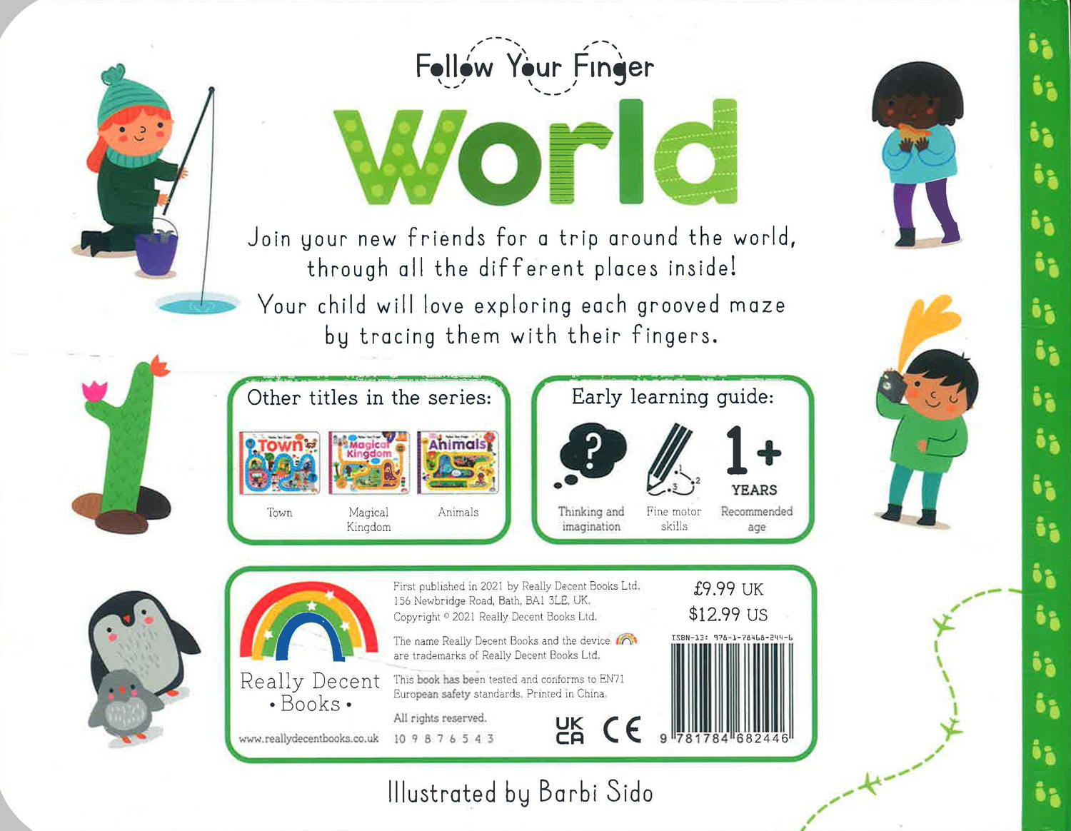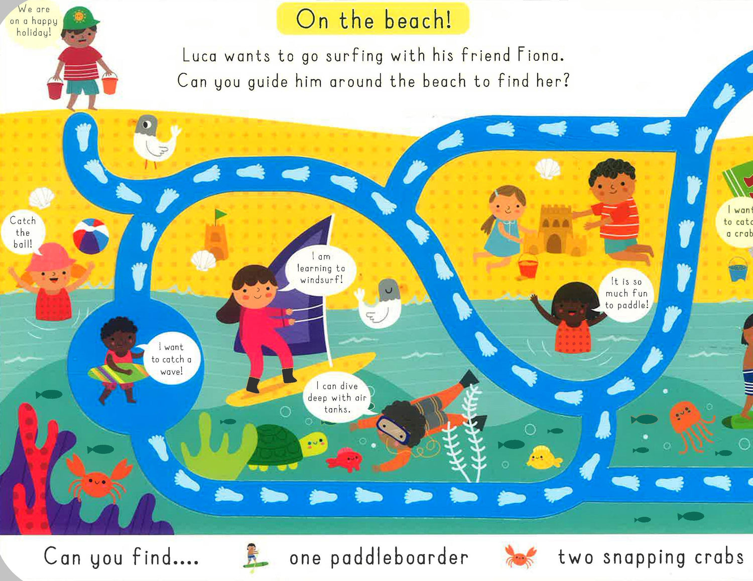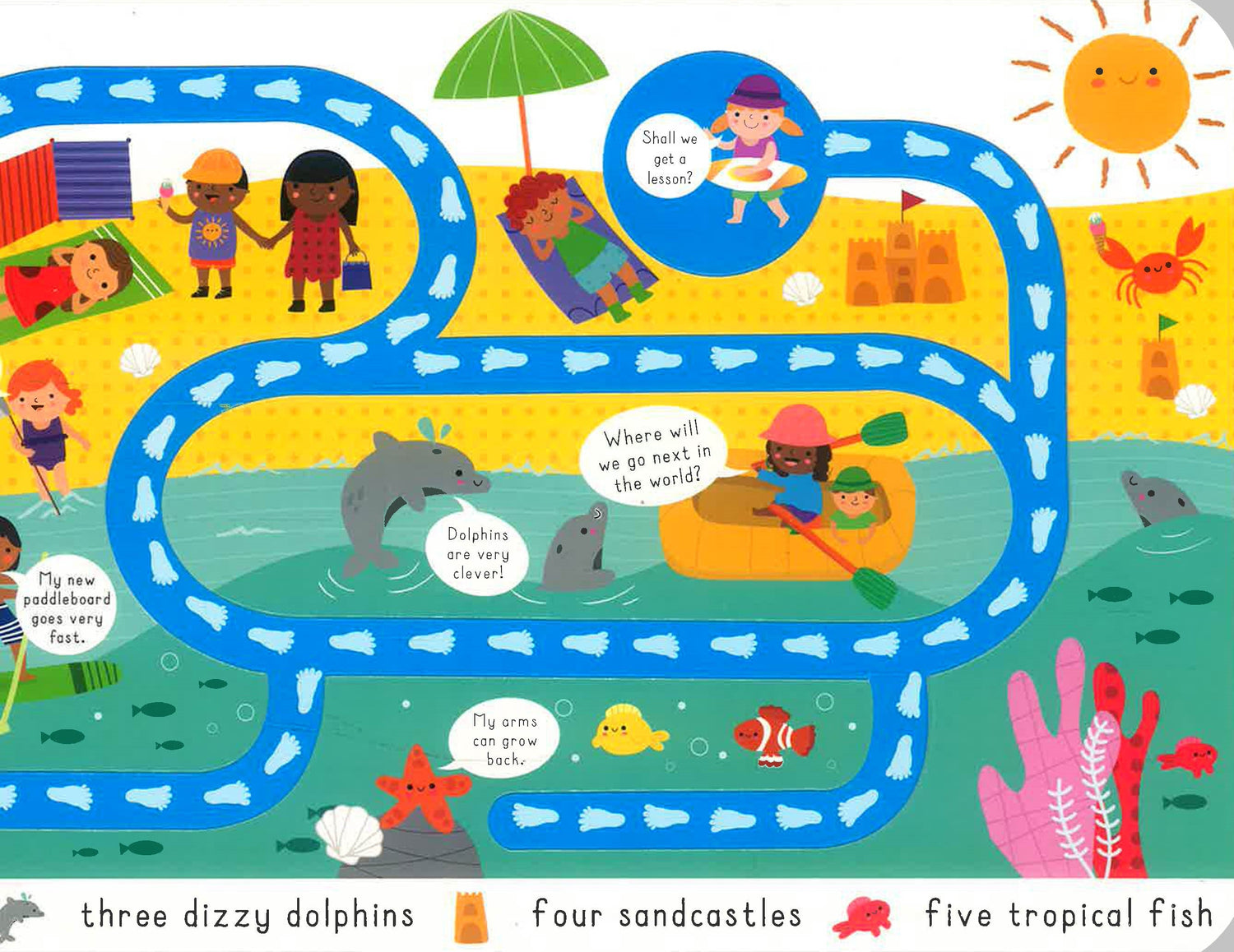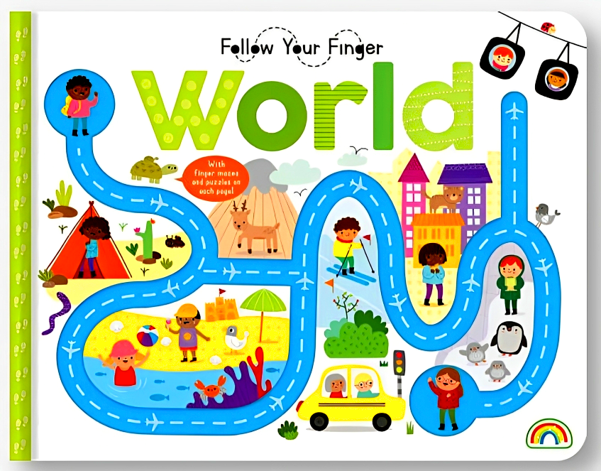 Join your new friends through all the different scenes inside for a journey around the world! Your child will love exploring each grooved maze by tracing them with their fingers. Book series with ‘follow your finger’ die-cut paths to find the correct routes, introducing fine-motor skills. Fun and bright illustrations with spotting and counting puzzles on each page.