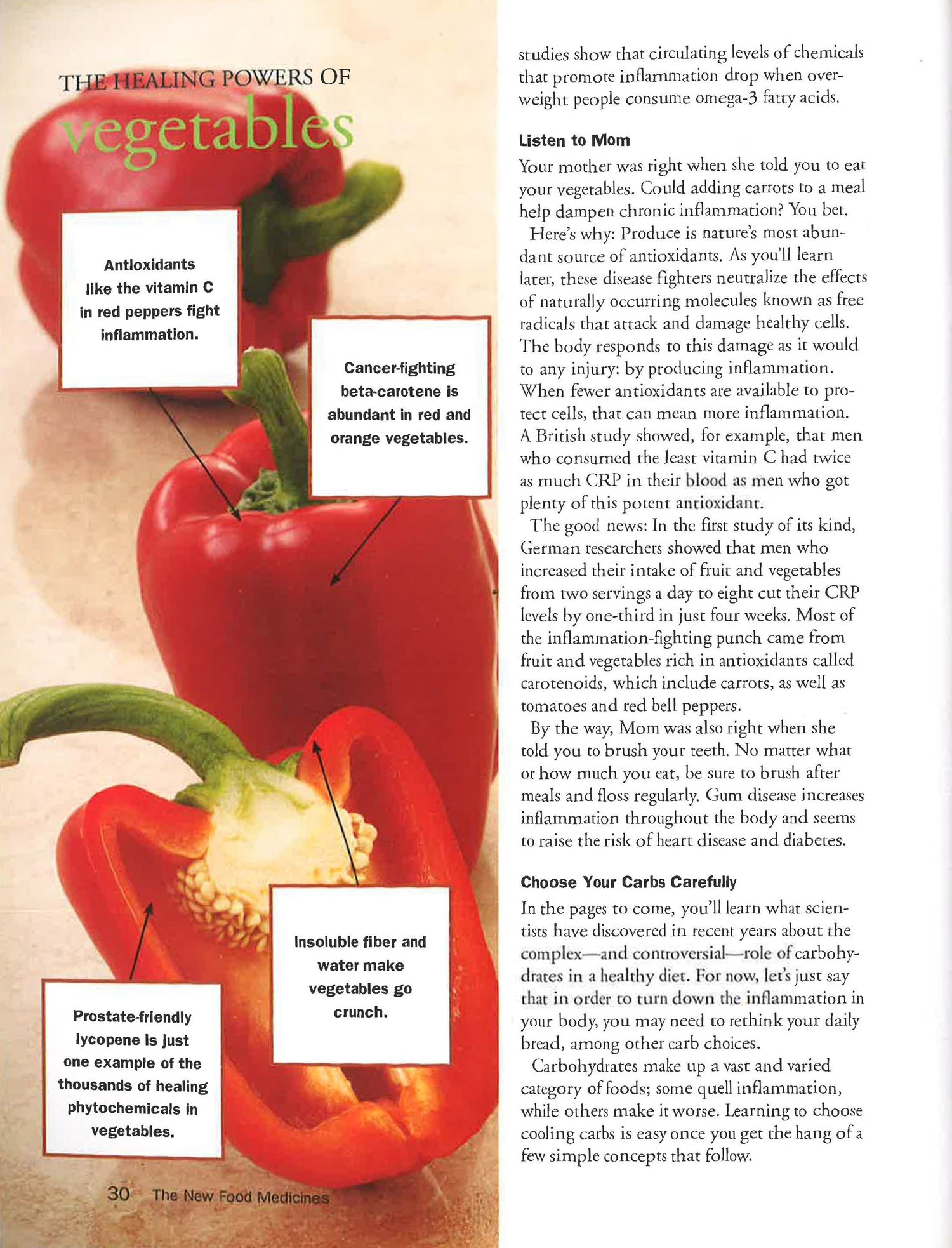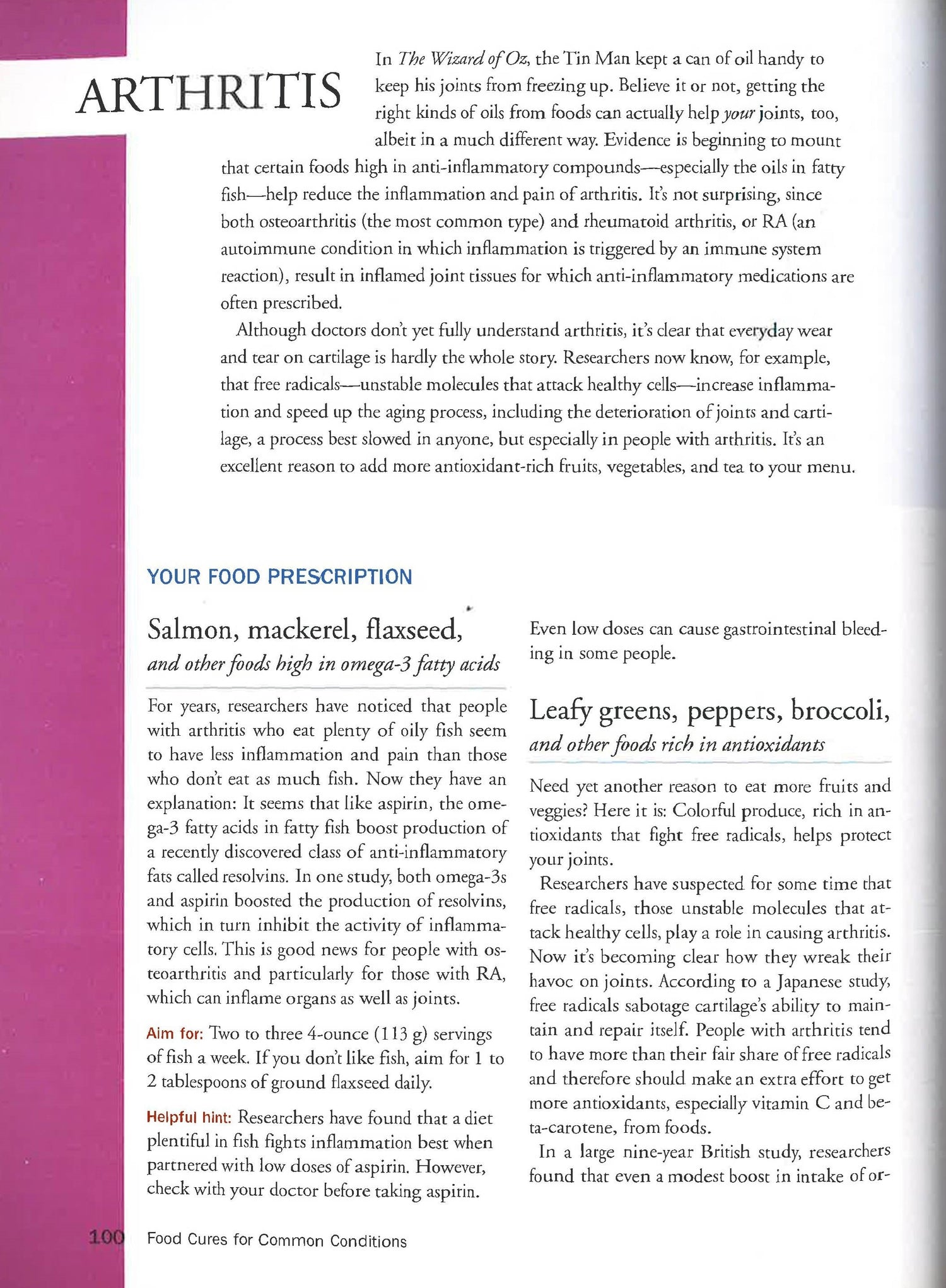 A rainbow of fruits and vegetables (8 to 9 servings a day)--the wider the variety the better--will lower the risk of an array of cancers Kale, spinach, and other dark leafy greens, which in addition to protecting your eyes from macular degeneration, are high in vitamin K which can help maintain bone density Ancient grains such as quinoa, teff, farro, and millet, are great sources of fiber and provide antioxidants, vitamins and minerals to support immunity and fight disease Dark chocolate contains hefty amounts of disease-fighting flavonoids and can significantly improve blood pressure Olive oil lowers "bad" LDL cholesterol and raises "good" HDL cholesterol Cures for common conditions include: