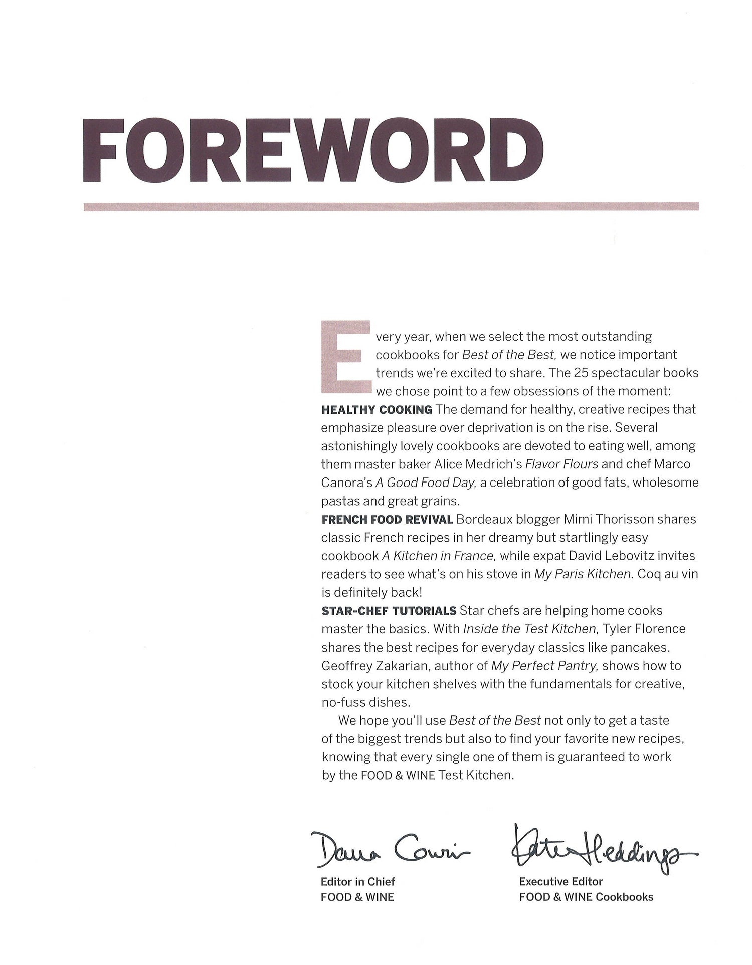 The most exceptional recipes from the 25 best cookbooks of the year, as chosen by the experts at Food & Wine magazine.To find the year's most outstanding cookbooks, Food & Wine considered hundreds of contenders. Featuring 110 dishes from superstar cooks such as Mario Batali, Alice Medrich, Carla Hall, Tyler Florence, Marcus Samuelsson, Gabrielle Hamilton, and Geoffrey Zakarian, Food & Wine Best of the Best reflects exactly how people want to cook today.Recipes for starters, main courses, and desserts have each been rigorously tested and guaranteed to work by the experts at Food & Wine. As a bonus, Best of the Best includes more than twenty exclusive, never-before-published recipes from theseacclaimed chefs and authors, adding Feta Mac & Cheese with Crunchy Tomato-Olive Crumbs, Roasted Corn& Tomato Tarts, Fudgy Raspberry Swirl Brownies, Ginger Molasses Cookies, and more to the smartly curated collection of favorites. This handsome hardcover volume also features lush color photographs of finished dishes along with simple wine pairings throughout.