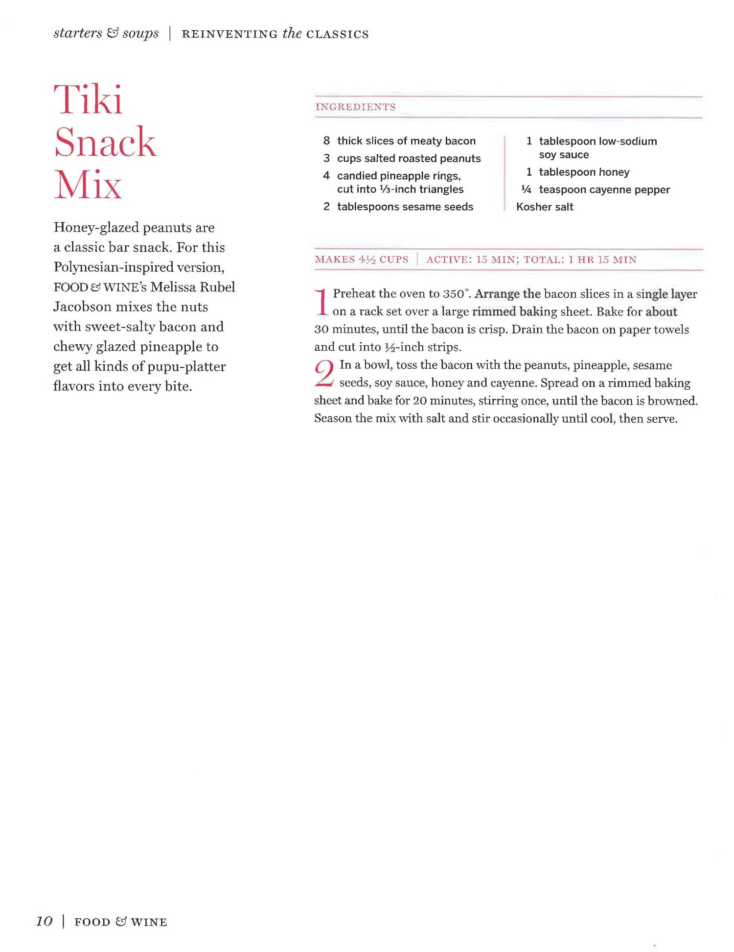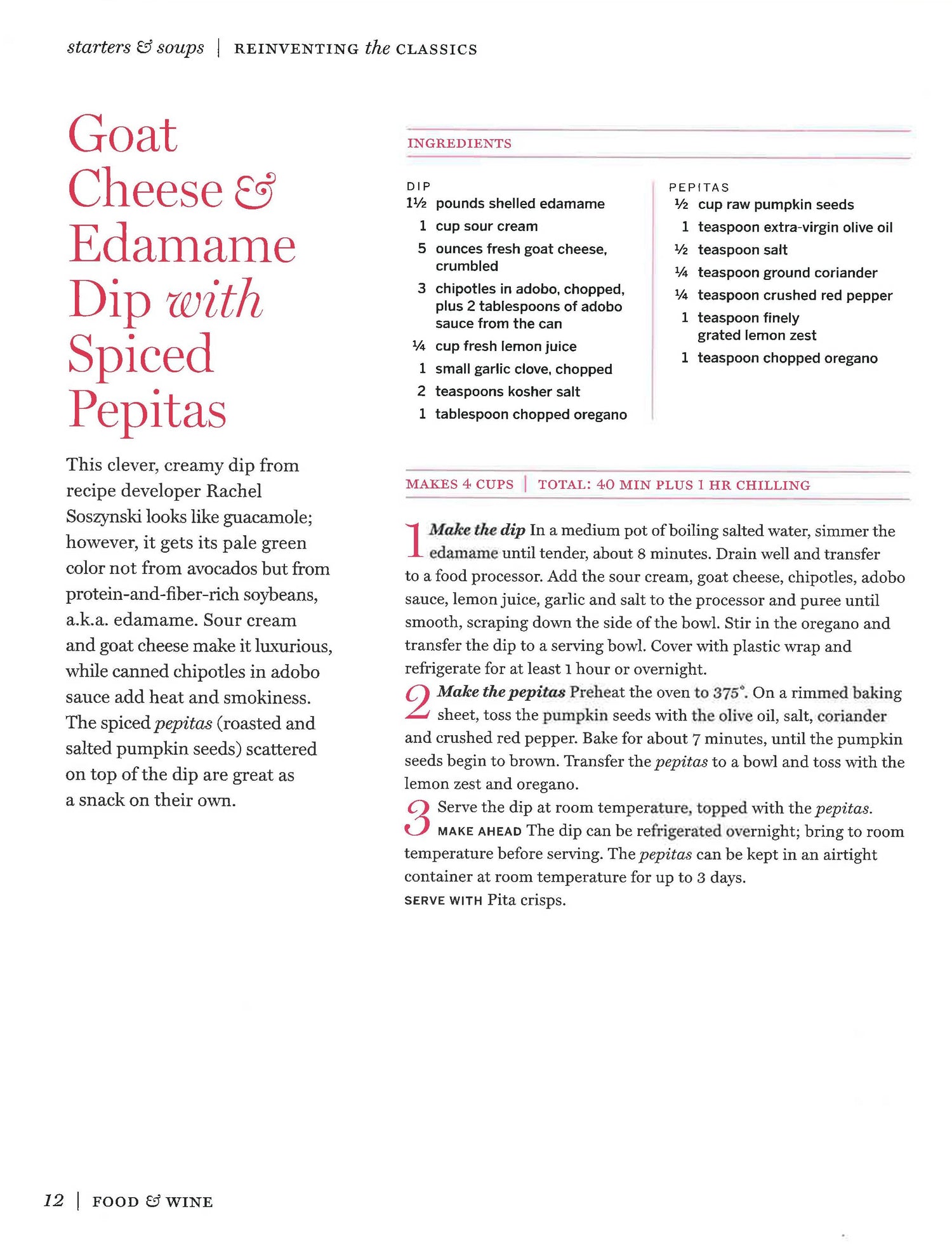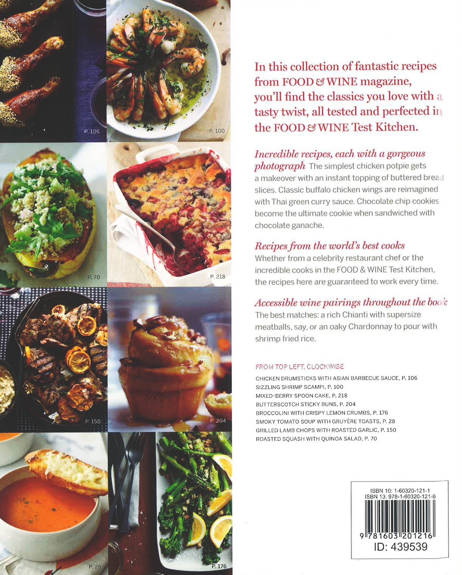 Here is an extraordinary collection of recipes from FOOD & WINE, all classics given a unique spin to make them fresh and fun. You'll love these great dishes: Fast Skillet Chicken & Mushroom Potpie . Chile-Lime Crab Salad Italian-Sausage Burgers with Garlicky Spinach Healthy Guacamole with Charred Jalapeno Shrimp & Vegetable Summer Rolls Grilled-Chicken Tacos Comfort Flatbread Lasagna Cheddar BLT Burgers with Russian Dressing Apple Pie Bars Chef Recipes Made Easy Chilled Spring Pea Soup Bucatini Carbonara Butterscotch Sticky Buns International Flavors Shiitake & Scallion Lo Mein Thai Green Curry Chicken Wings Korean Beef Stew with Napa Cabbage