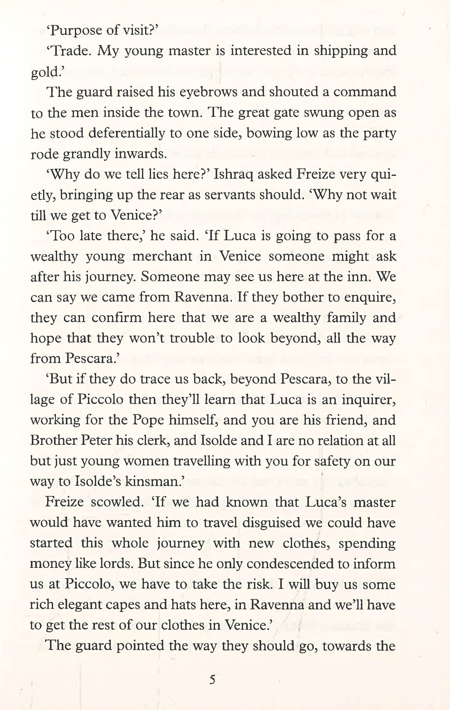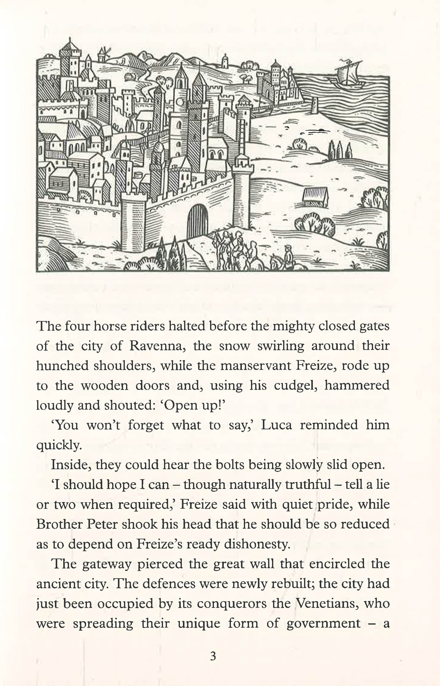 Luca Vero and his friends are plunged into the heady whirlwind of Venice, the world's busiest marketplace, where everything - and everyone - is for sale. Their mission from the Pope is no protection: this city has its own laws. Meanwhile, the Lady Isolde is in more danger than ever, and her feelings for Luca are becoming more intense.