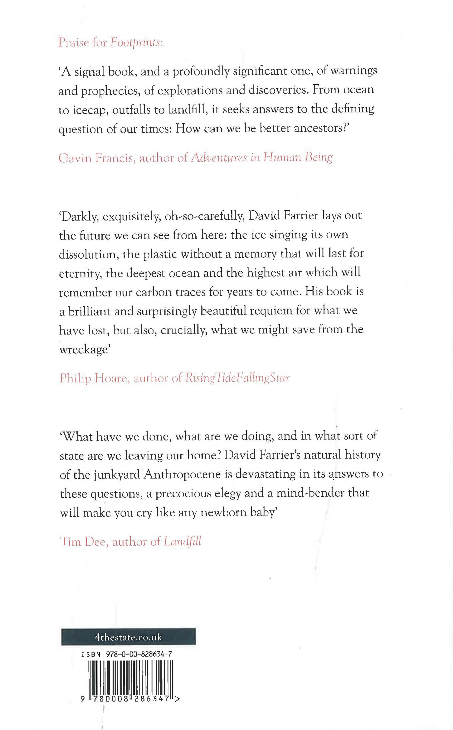 A profound meditation on climate change and the Anthropocene and an urgent search for the fossils-industrial, chemical, geological-that humans are leaving behind A Times Book of the Year * A Daily Telegraph Book of the Year What will the world look like ten thousand or ten million years from now? In Footprints, David Farrier explores what traces we will leave for the very deep future. From long-lived materials like plastic and nuclear waste, to the 50 million kilometres of roads spanning the planet, in modern times we have created numerous objects and landscapes with the potential to endure through deep time. Our carbon could linger in the atmosphere for 100,000 years, and the remains of our cities will still exist millions of years from now as a layer in the rock. These future fossils have the potential to tell remarkable stories about how we lived in the twenty-first century. Through literature, art, and science, Footprints invites us to think about how we will be remembered in the myths, stories, and languages of our distant descendants. Travelling from the Baltic Sea to the Great Barrier Reef, and from an ice core laboratory in Tasmania to Shanghai, one of the world's biggest cities, David Farrier tells a story of a world that is changing rapidly, and with long-term consequences. Footprints will not only alter how you think about the future, it will change how you see the world today.