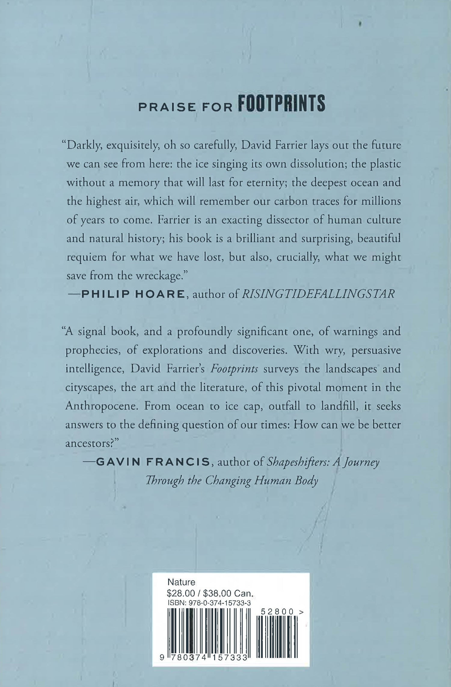 Crossing the boundaries of literature, art, and science, Footprints invites us to think about how we will be remembered in the myths and stories of our distant descendants. Traveling from the Baltic Sea to the Great Barrier Reef, and from an ice-core laboratory in Tasmania to Shanghai, one of the world’s biggest cities, Farrier describes a world that is changing rapidly, with consequences beyond the scope of human understanding. As much a message of hope as a warning, Footprints will not only alter how you think about the future; it will change how you see the world today.
