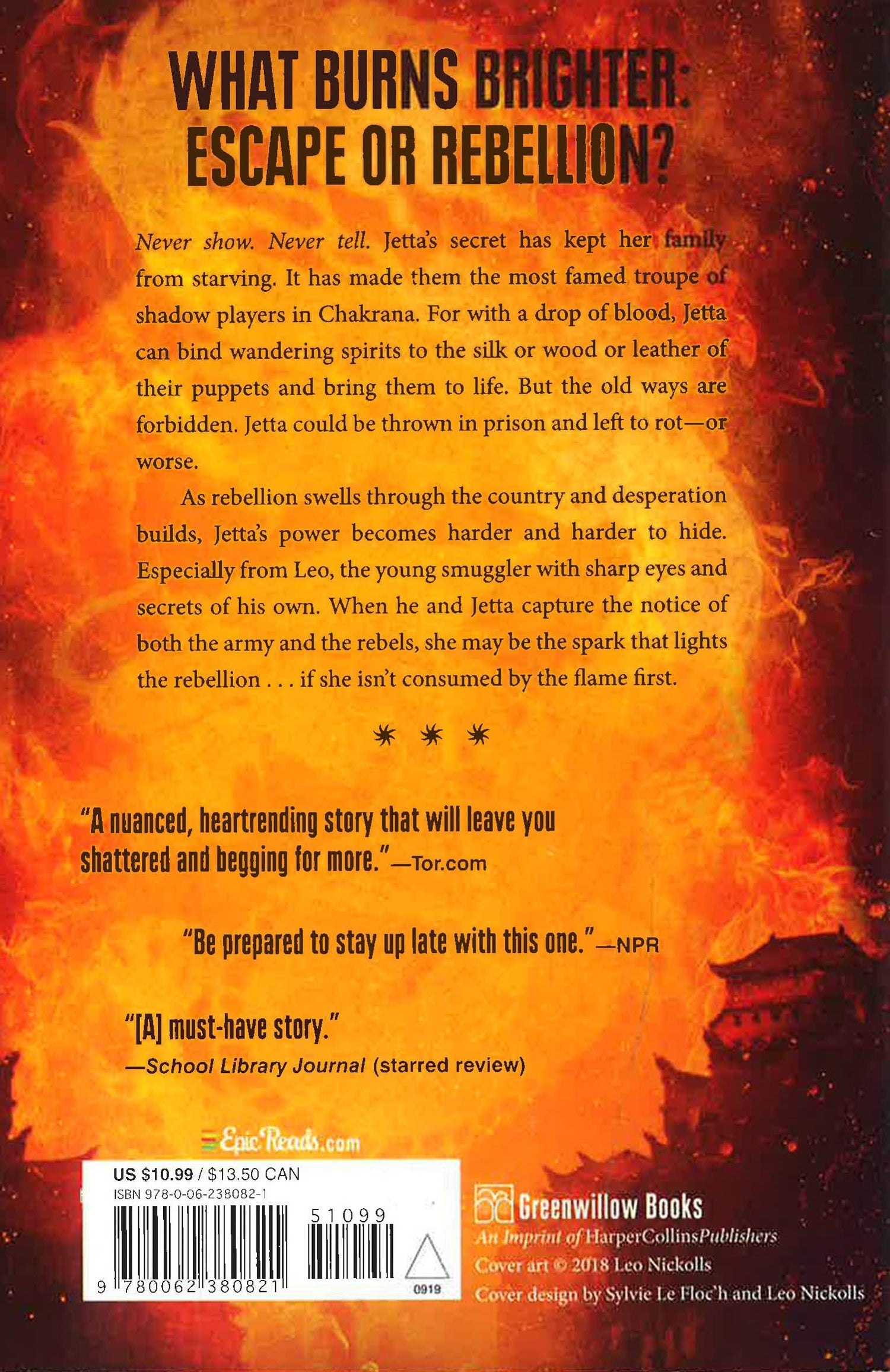 Jetta's family is famed as the most talented troupe of shadow players in the land. With Jetta behind the scrim, their puppets seem to move without string or stick--a trade secret, they say. In truth, Jetta can see the souls of the recently departed and bind them to the puppets with her blood. But ever since the colonizing army conquered their country, the old ways are forbidden. Jetta must never show, never tell. Her skill and fame are her family's way to earn a spot aboard the royal ship to Aquitan, where shadow plays are the latest rage, and where rumor has it the Mad King has a spring that cures his ills. Because seeing spirits is not the only thing that plagues Jetta. But as rebellion seethes and as Jetta meets a young smuggler, she will face truths and decisions that she never imagined--and safety will never seem so far away.