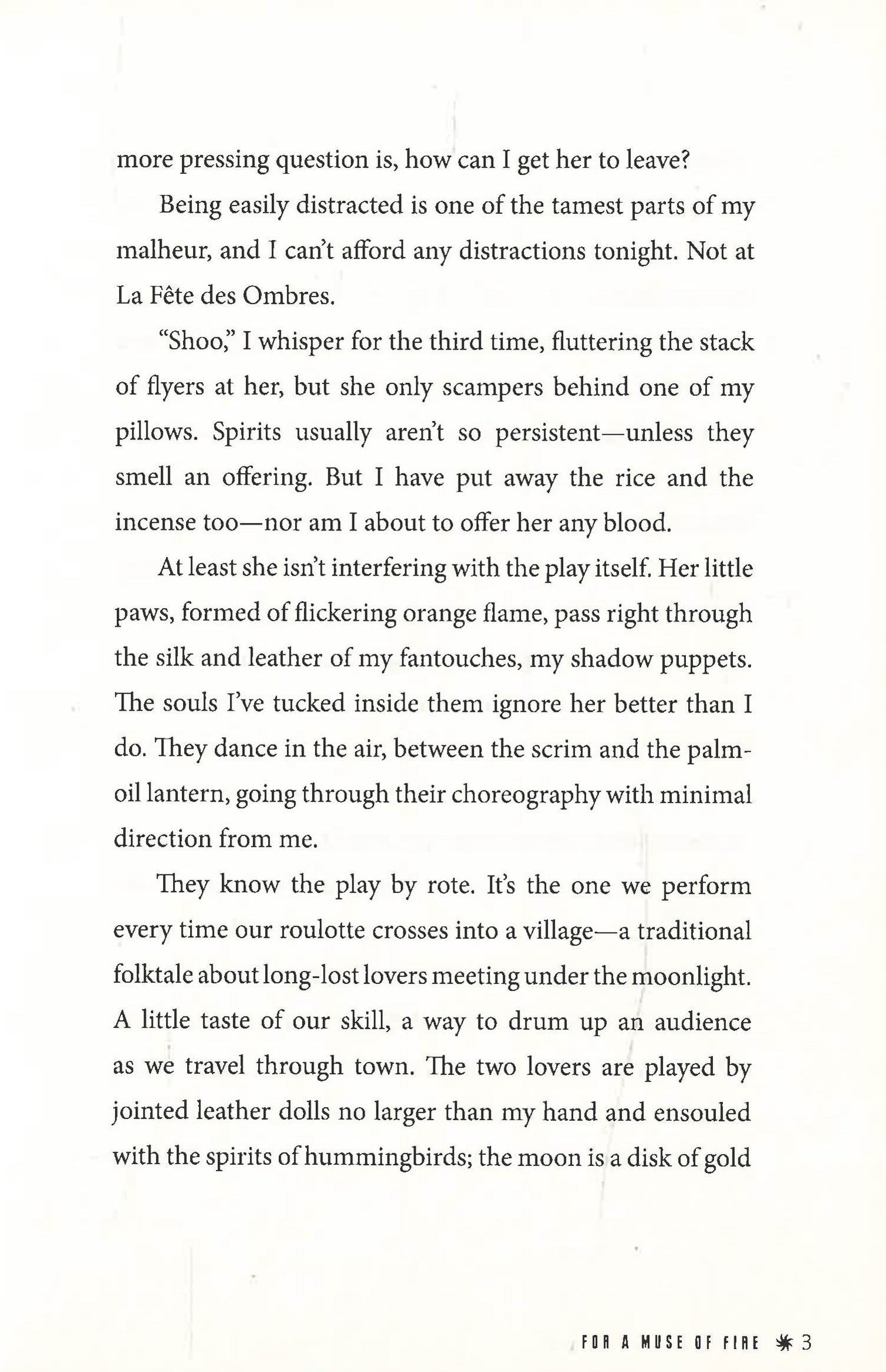 Heidi Heilig creates a vivid, rich world inspired by Southeast Asian cultures and French colonialism. Told from Jetta's first-person point-of-view, as well as chapters written as play scripts and ephemera such as telegrams and letters, For a Muse of Fire is an engrossing journey that weaves magic, simmering romance, and the deep bonds of family with the high stakes of epic adventure.