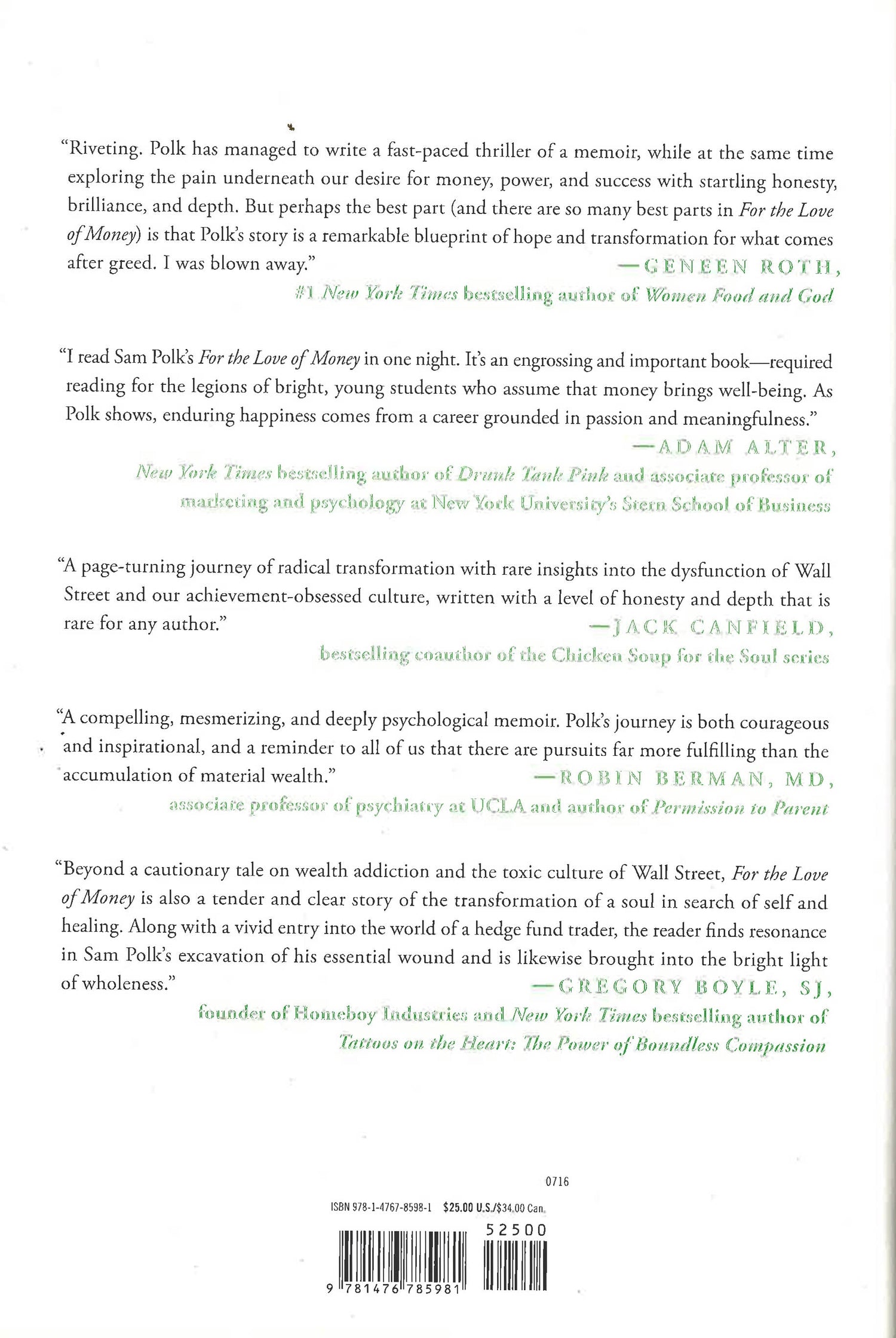 In 2014, a former hedge fund trader’s New York Times Sunday Review front page article about wealth addiction instantly went viral. This is his unflinching memoir about coming of age on Wall Street, fighting to overcome the ghosts of his past - and the radical new way he now defines success.At just thirty years old, Sam Polk was a senior trader for one of the biggest hedge funds on Wall Street, on the verge of making it to the very top. When he was offered an annual bonus of $3.75 million, he grew angry because it was not enough. In that moment he knew he had lost himself in his obsessive pursuit of money. And he had come to loathe the culture - the shallowness, the sexism, the crude machismo - and Wall Street’s use of wealth as the sole measure of a person’s worth. He decided to walk away from it all.For Polk, becoming a Wall Street trader was the fulfillment of his dreams. But in reality it was just the culmination of a life of addictive and self-destructive behaviors, from overeating, to bulimia, to alcohol and drug abuse. His obsessive pursuit of money papered over years of insecurity and emotional abuse. Making money was just the latest attempt to fill the void left by his narcissistic and emotionally unavailable father.As in Liar’s Poker, Polk brings readers into the rarefied world of Wall Street trading floors, capturing the modern frustrations of young graduates drawn to Wall Street. Raw, vivid, and immensely readable, For the Love of Money explores the birth of a young hedge fund trader, his disillusionment, and the radical new way he has come to define success.