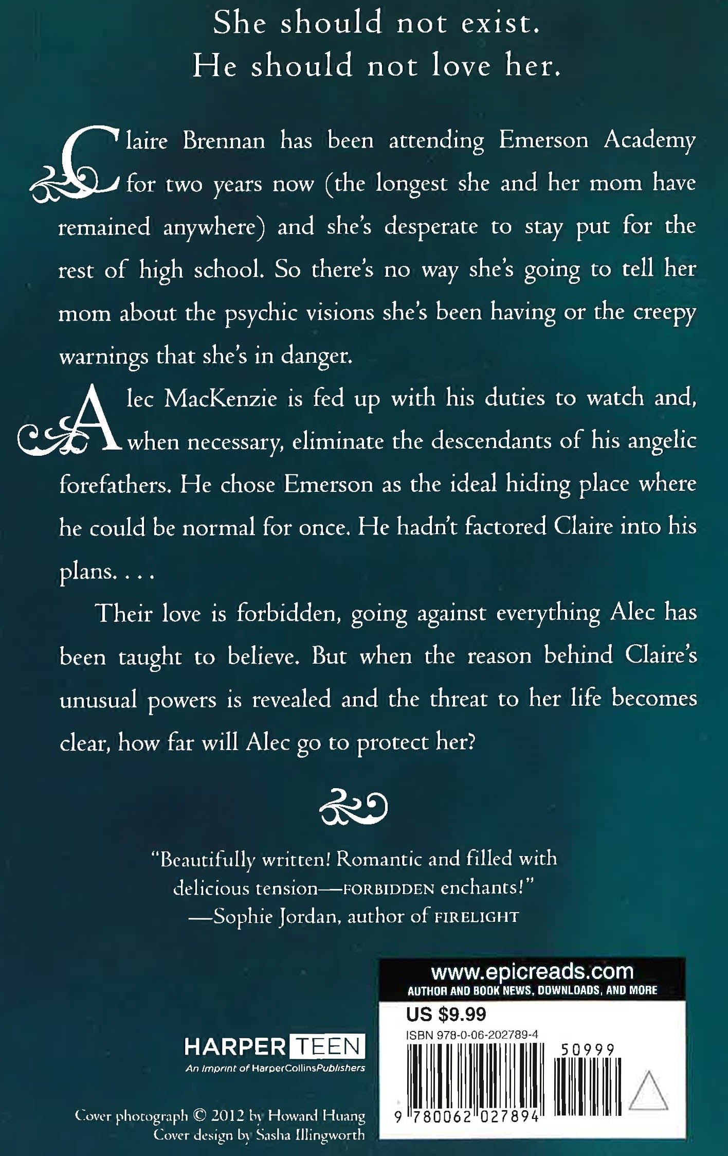 She should not exist. He should not love her. Claire Brennan has been attending Emerson Academy for two years now (the longest she and her mom have remained anywhere) and she's desperate to stay put for the rest of high school. So there's no way she's going to tell her mom about the psychic visions she's been having or the creepy warnings that she's in danger. Alec MacKenzie is fed up with his duties to watch and, when necessary, eliminate the descendants of his angelic forefathers. He chose Emerson as the ideal hiding place where he could be normal for once. He hadn't factored Claire into his plans. . . . Their love is forbidden, going against everything Alec has been taught to believe. But when the reason behind Claire's unusual powers is revealed and the threat to her life becomes clear, how far will Alec go to protect her?