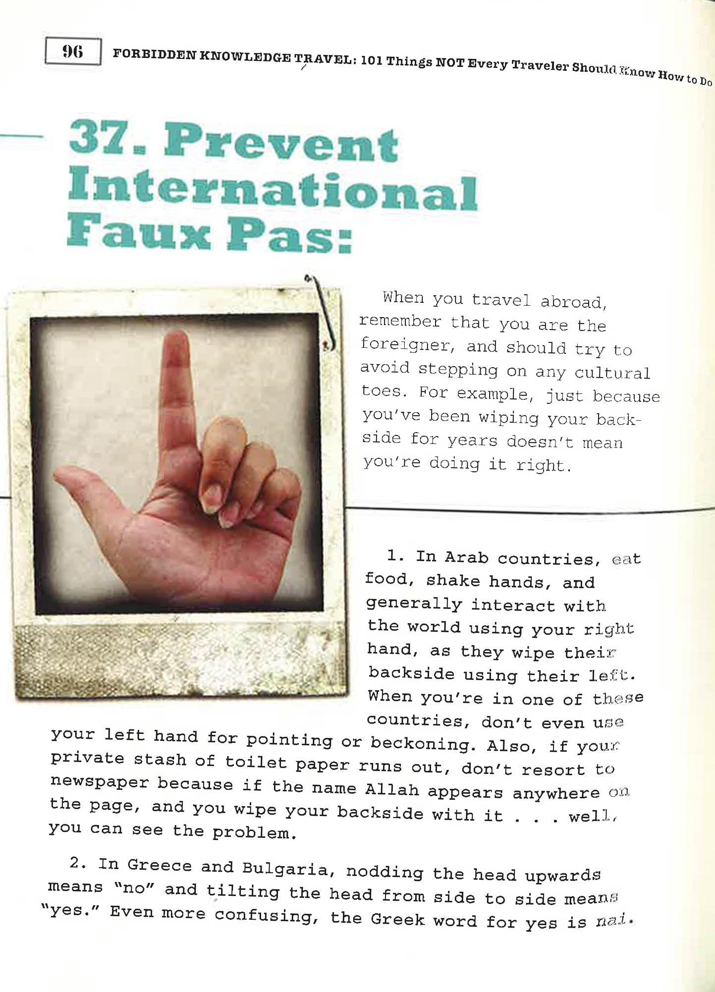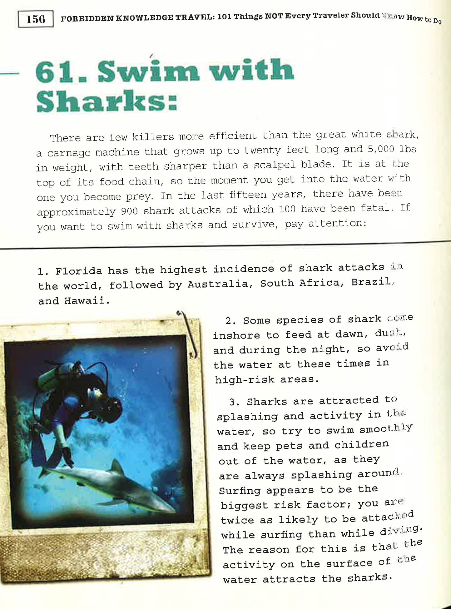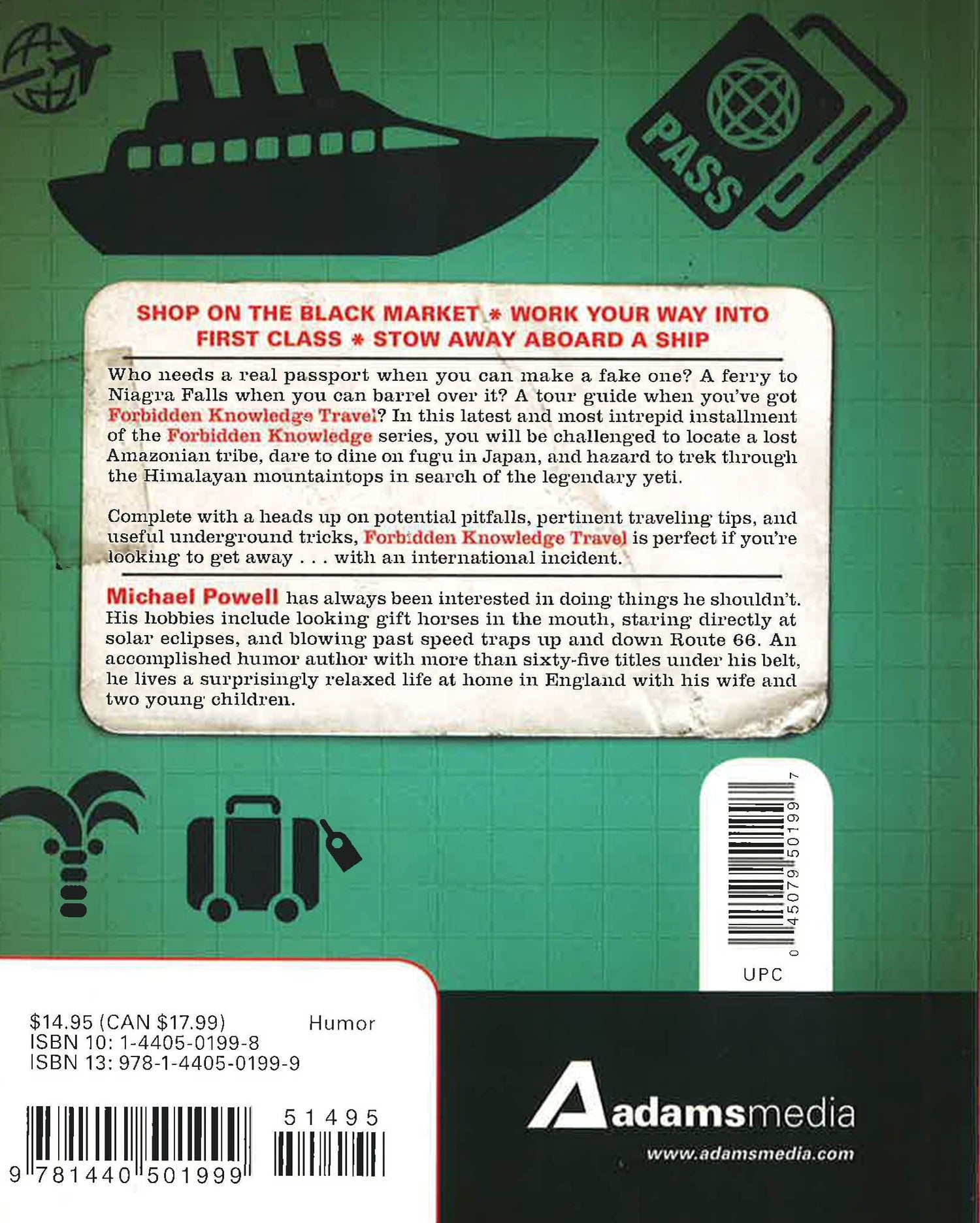 Crash a nude beach. Work your way into first class. Shop on the black market. Eat something that's still alive. Stow away aboard a ship. And more ...Who needs a real passport when you can make a fake one? A ferry to Niagra Falls when you can barrel over it? A tour guide when you've got this travel guide? In this latest and most intrepid installment of the Forbidden Knowledge series, adventure seekers and their wannabe counterparts will be challenged to locate a lost Amazonian tribe, dare to dine on fugu in Japan, or hazard to trek through the Himalayan mountaintops in search of the legendary yeti.Complete with a heads up on potential pitfalls, pertinent traveling tips, and useful underground tricks, this book is perfect for anyone looking to get away ...with an international incident!